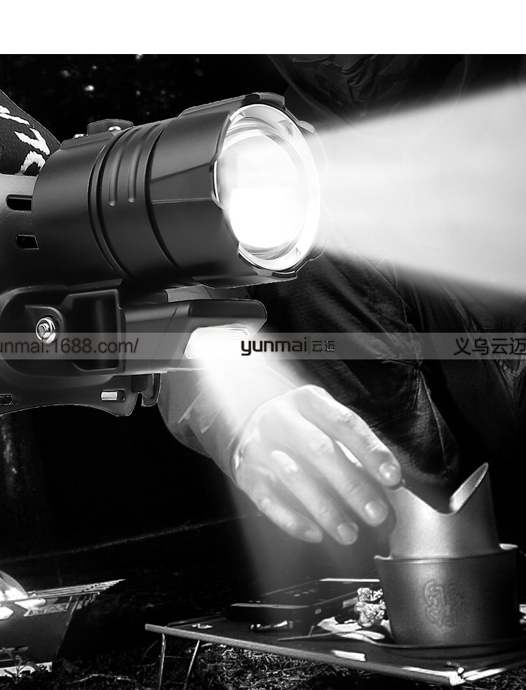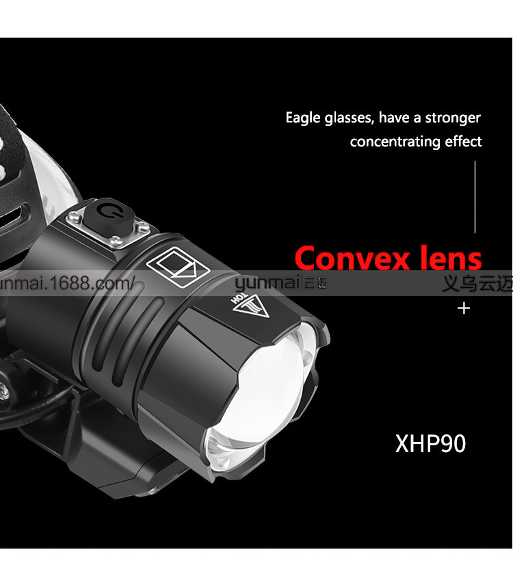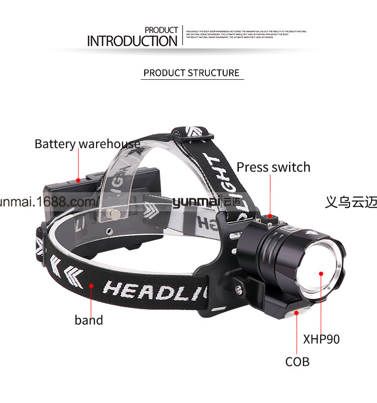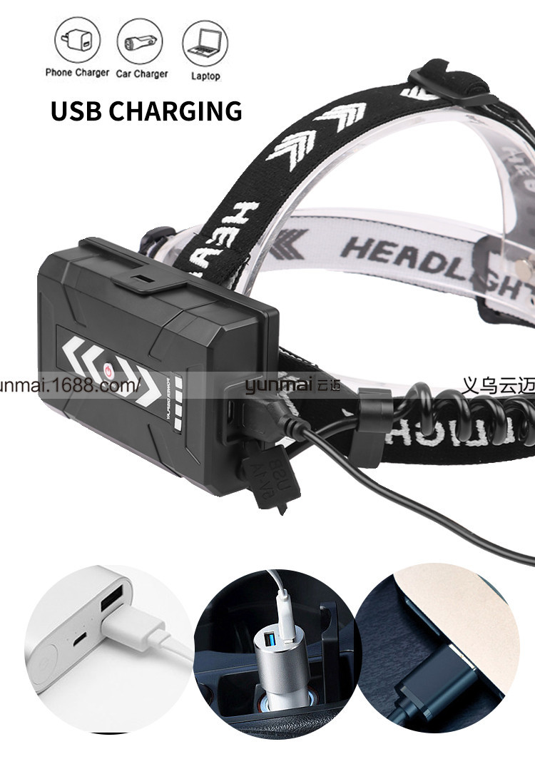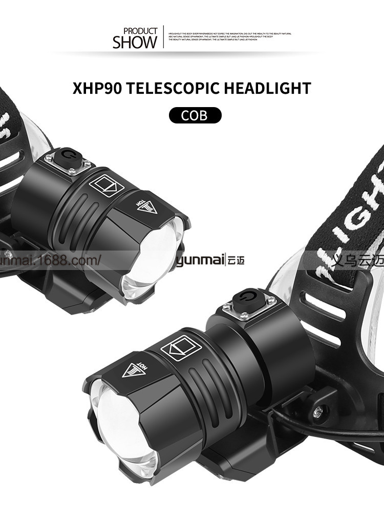 标题:跨境新款XHP90强光头灯 XHP90+COB斜45°户外钓鱼头灯USB强光头灯