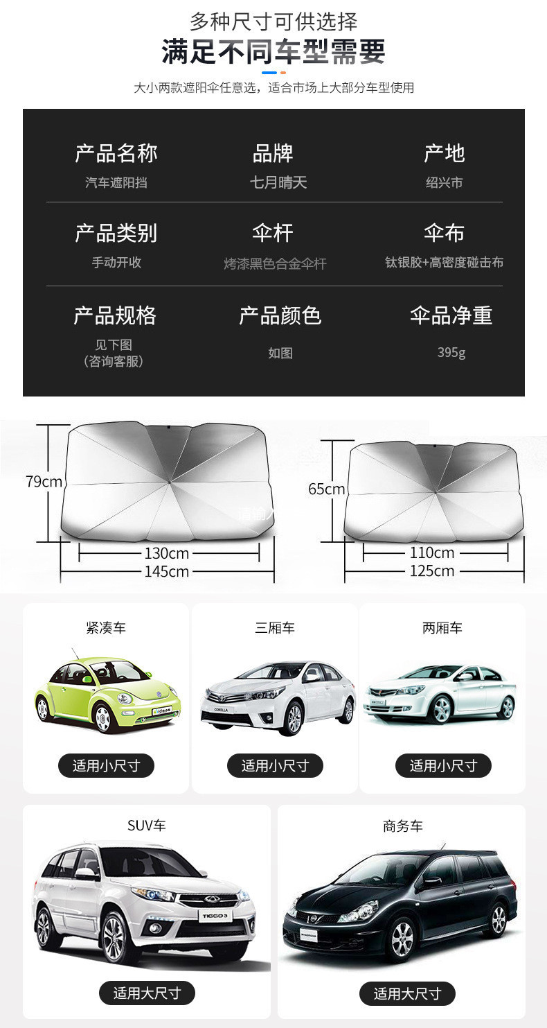 描述:品牌:七月晴天,是否进口:否,伞布材质:碰击布,伞布过胶:银胶,伞布密度:210T,伞骨材质:钢,中棒材质:钢,伞柄材质:橡胶,伞骨数量:10骨,打开方式:手动,收伞方式:手动,货号:02,款式:汽车伞,造型:高尔夫伞,适用人群:成人,加印LOGO:可以,加工定制:是,产地(国内):浙江省,毛重:0.4,箱装数量:按需,包装:按需,是否专利货源:是,专利类型:外观设计专利,专利号:ZL202030397232.1,功能:遮阳,设计元素:镜面,颜色:钛银伞面全遮光小号(65*125,银胶伞面半遮光小号(65*125),钛银伞面全遮光大号(79*140),银胶伞面半遮光大号(79*140),是否跨境出口专供货源:否,风格:百搭,送礼用途:商务送礼,是否属于礼品:是,商务礼品,流行趋势词:按需,版权:无,紫外线防晒指数:UPF大于50,