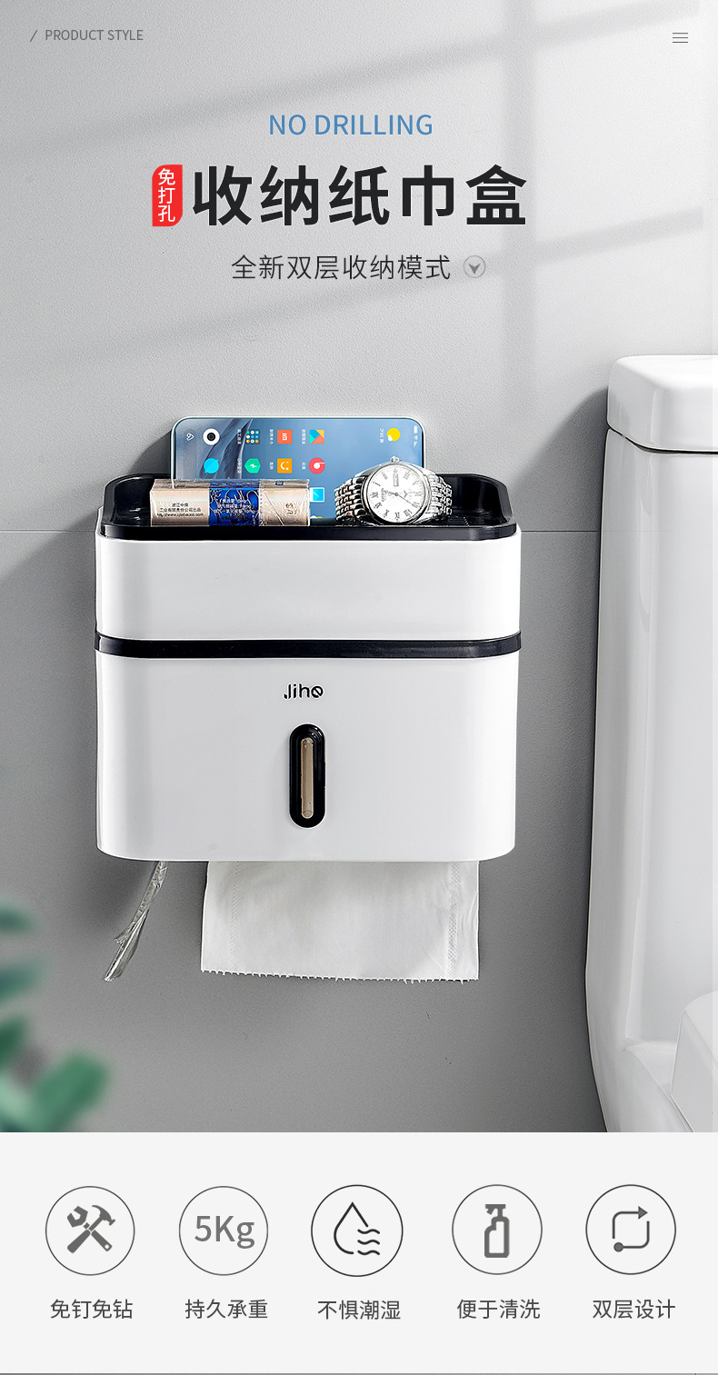 标题:卫生间纸巾盒免打孔壁挂创意防水抽纸卷纸厕所厕纸盒卫生纸置物架