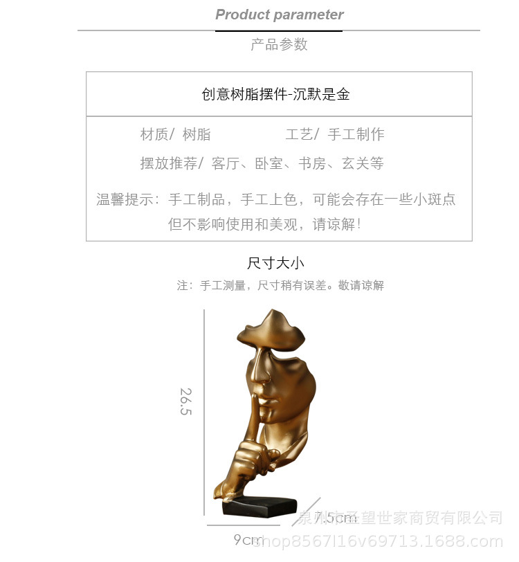 描述:材质:树脂,货号:单层沉默是金,工艺:树脂工艺,是否进口:否,加工定制:是,类别:人物,摆挂形式:摆饰,风格:欧式,造型:人物,包装:普通包装,产地:福建,加印LOGO:可以,是否专利货源:否,颜色:光滑金色不说,光滑黑色不说,光滑白色不说,光滑香槟色不说,主要下游平台:ebay,亚马逊,wish,速卖通,独立站,LAZADA,主要销售地区:欧洲,南美,东南亚,北美,东北亚,是否跨境出口专供货源:是,是否属于礼品:否,是否IP授权:否,
