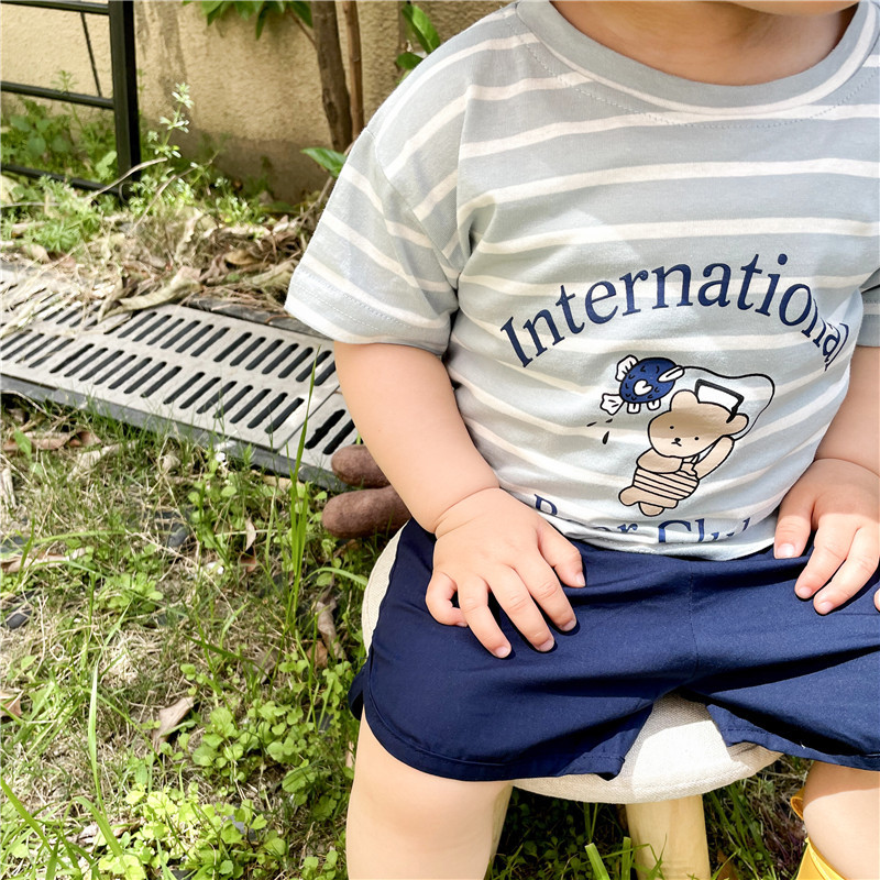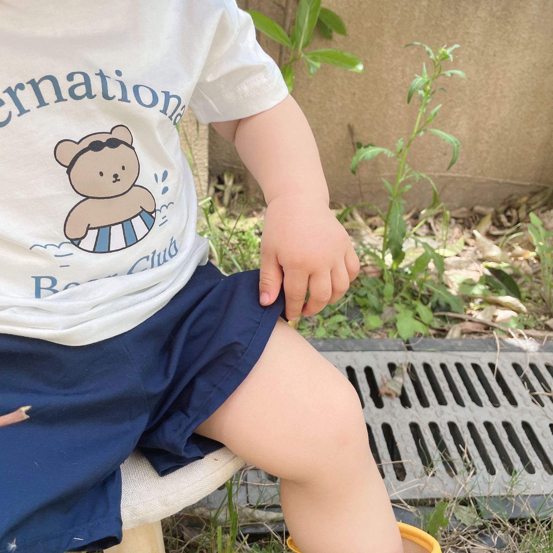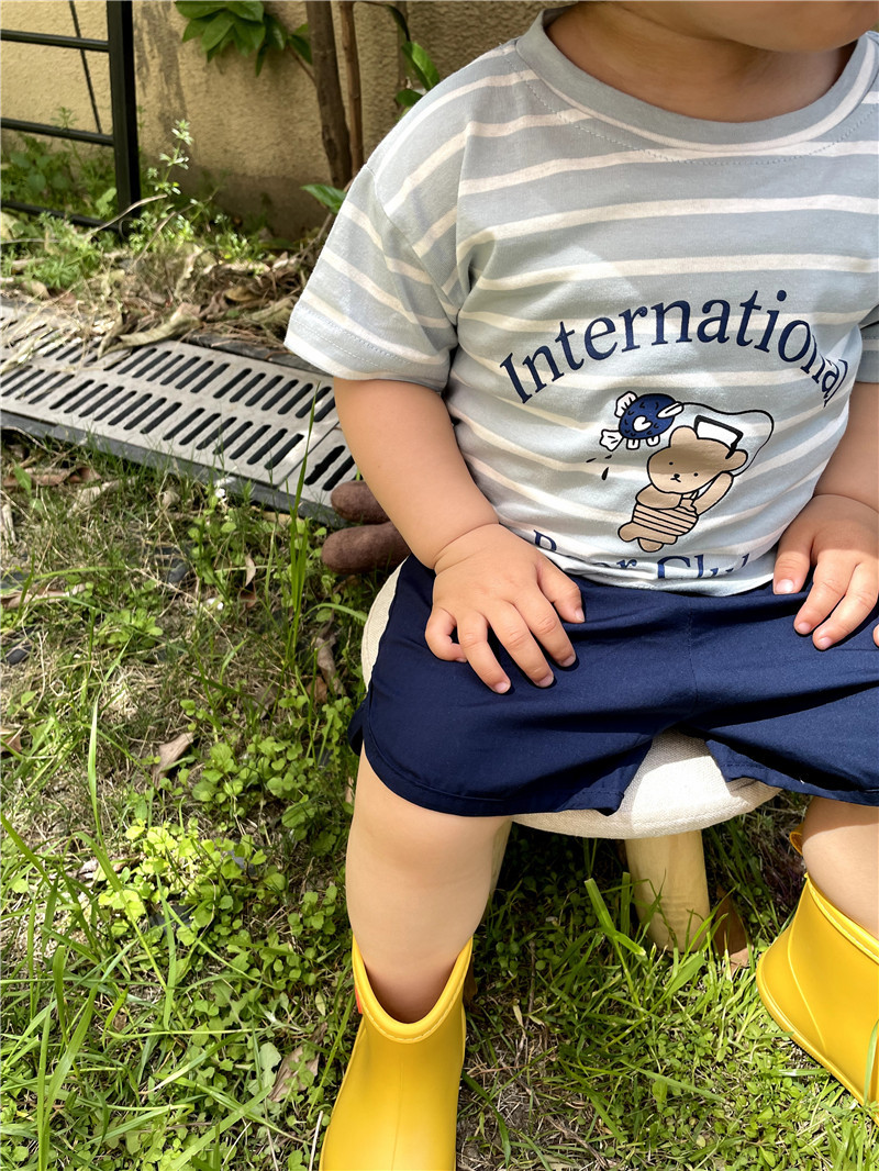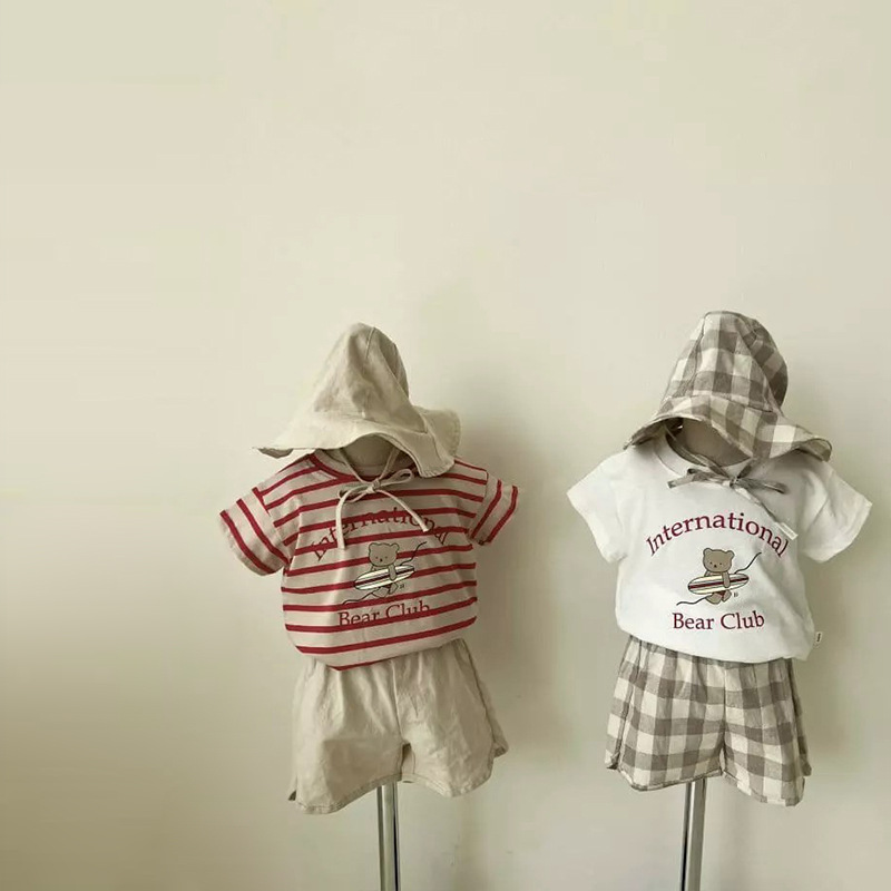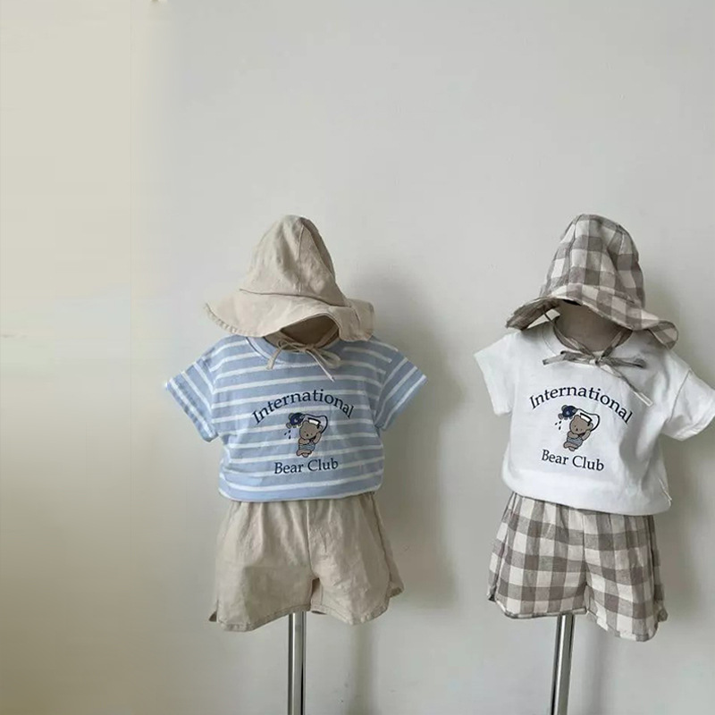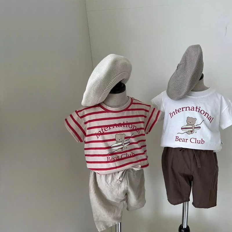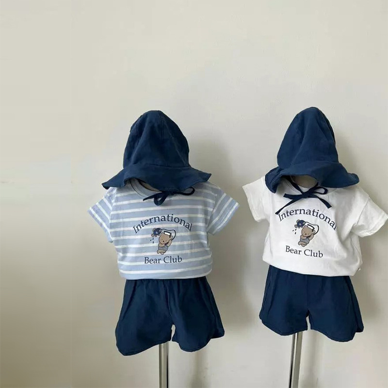 描述:品牌:芝麻饼干,货号:22115,货源类别:现货,适用性别:中性/男女均可,风格:韩版,产地:浙江,是否连帽:不连帽,袖长:短袖,适合年龄段:婴幼童(1~3岁,80~100cm),中小童(3~8岁,100~140cm),适合季节:夏季,面料工艺:柔软处理,图案:条纹,卡通,图片实拍:实拍无模特,是否库存:是,元素:套装,条纹,卡通,上市年份季节:2022年夏季,AQL抽检标准:1.0,平车针距12~14针/3cm:是,毛头/杂余线头是否修剪:全部修剪干净,面料名称:棉,主面料成分:棉,主面料成分含量:95,安全等级:A类,领型:圆领,功能:吸湿排汗,颜色:白底冲浪熊,条纹冲浪熊,白底钓鱼熊,条纹钓鱼小熊,条纹泳衣小熊,白底游泳小熊,米色裤,蓝色裤,黑色裤,咖格裤,草莓裤,樱桃裤,适合身高:80cm,90cm,100cm,110cm,120cm,主要下游平台:ebay,亚马逊,wish,速卖通,独立站,LAZADA,主要销售地区:东南亚,东北亚,有可授权的自有品牌:是,是否跨境出口专供货源:是,