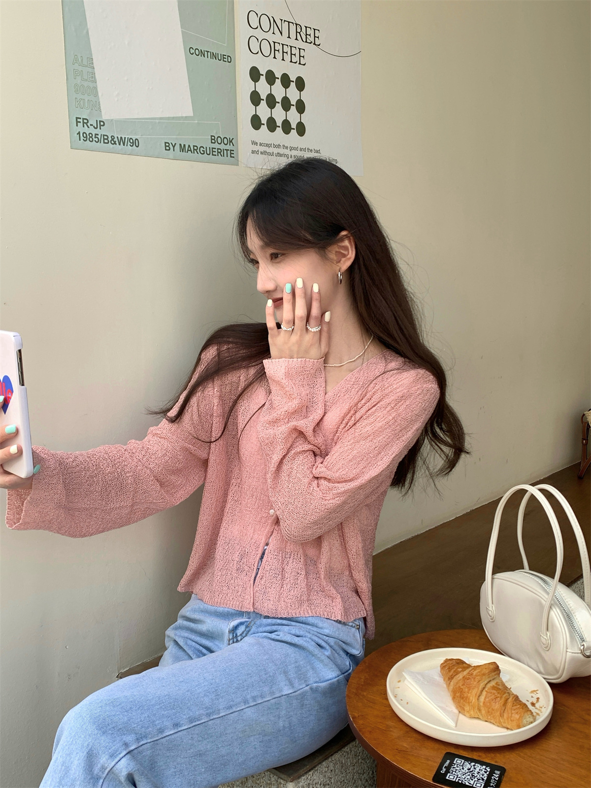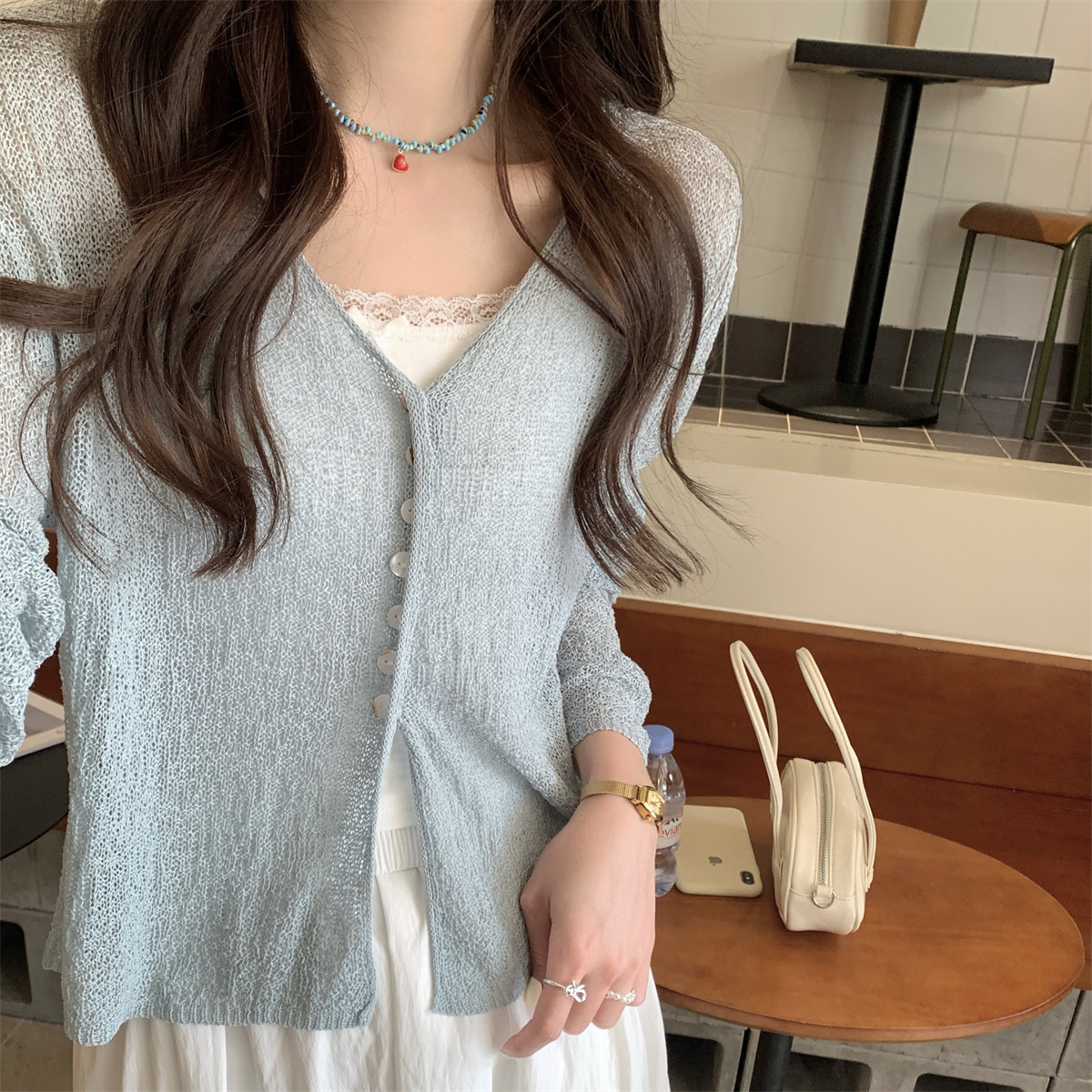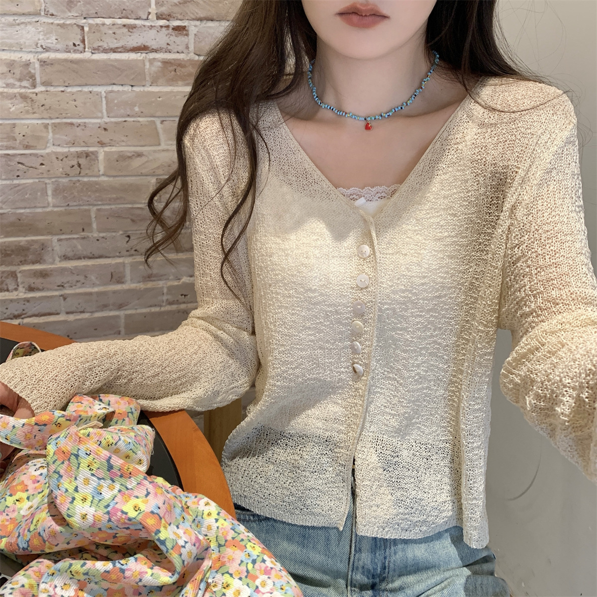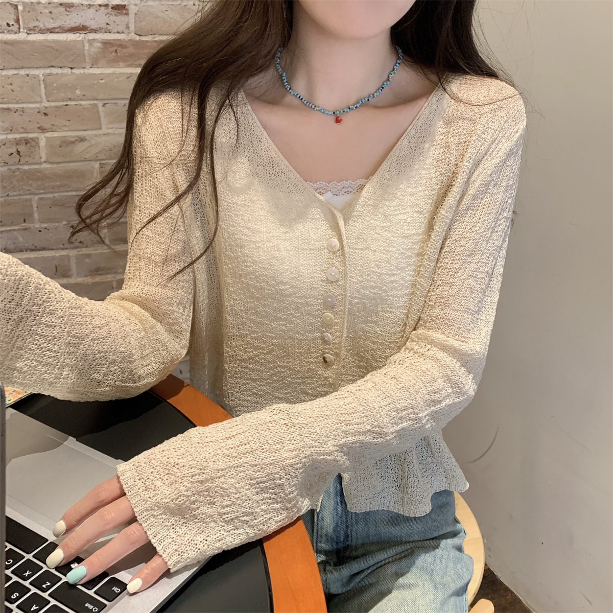 标题:新作 夏 韓国風VネックUVニット リネン風 ゆったりUVカット日焼け防止ウェア