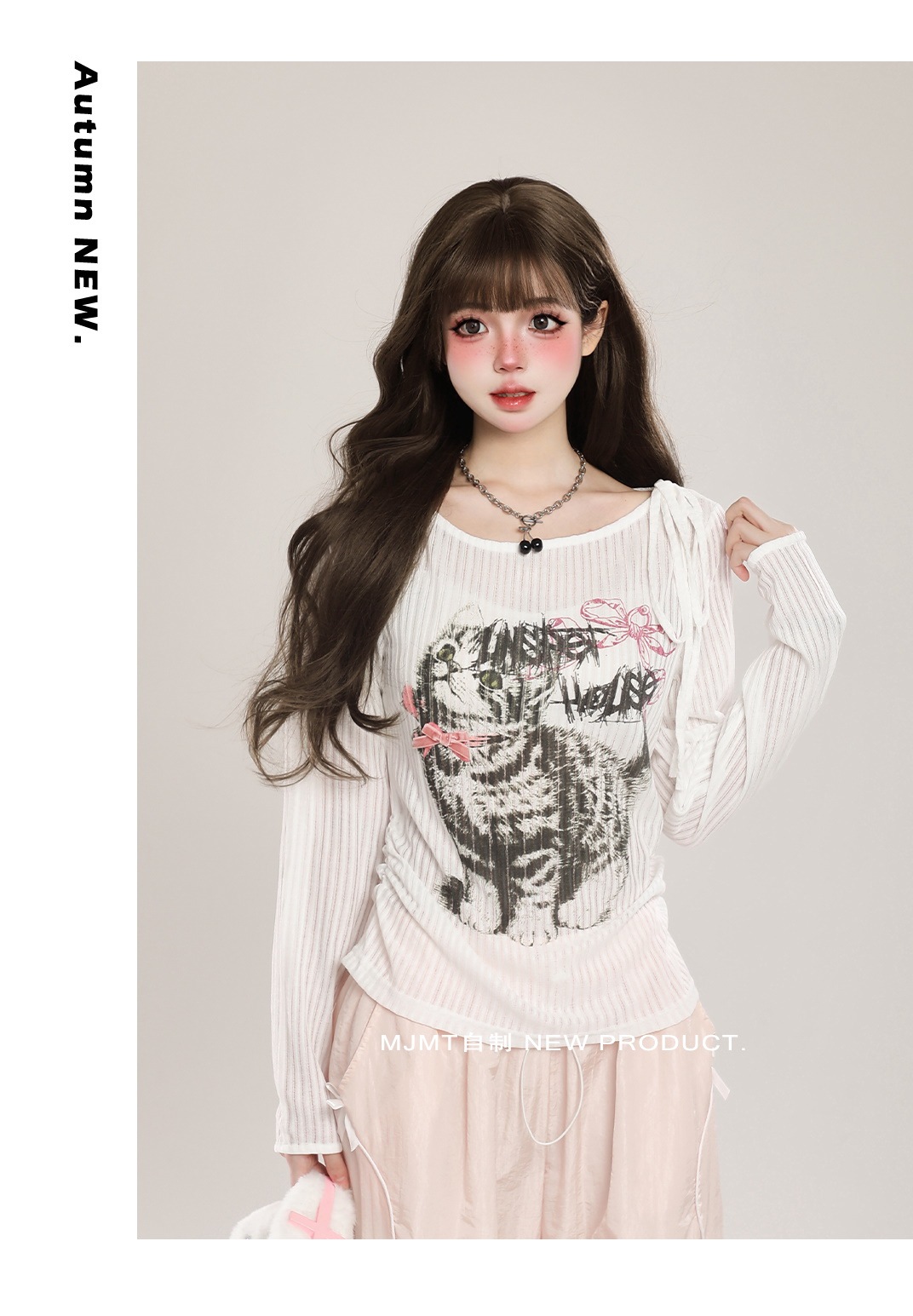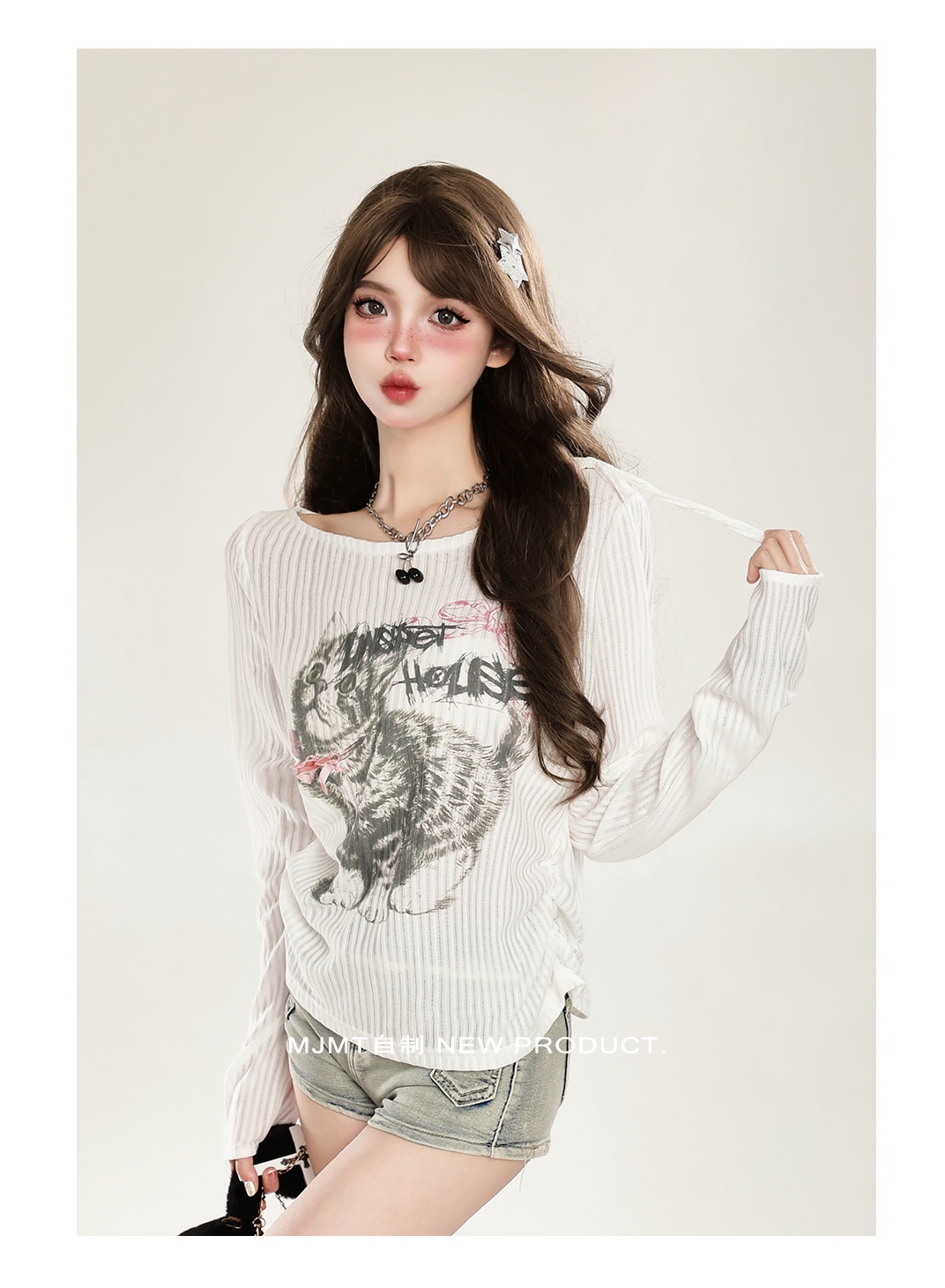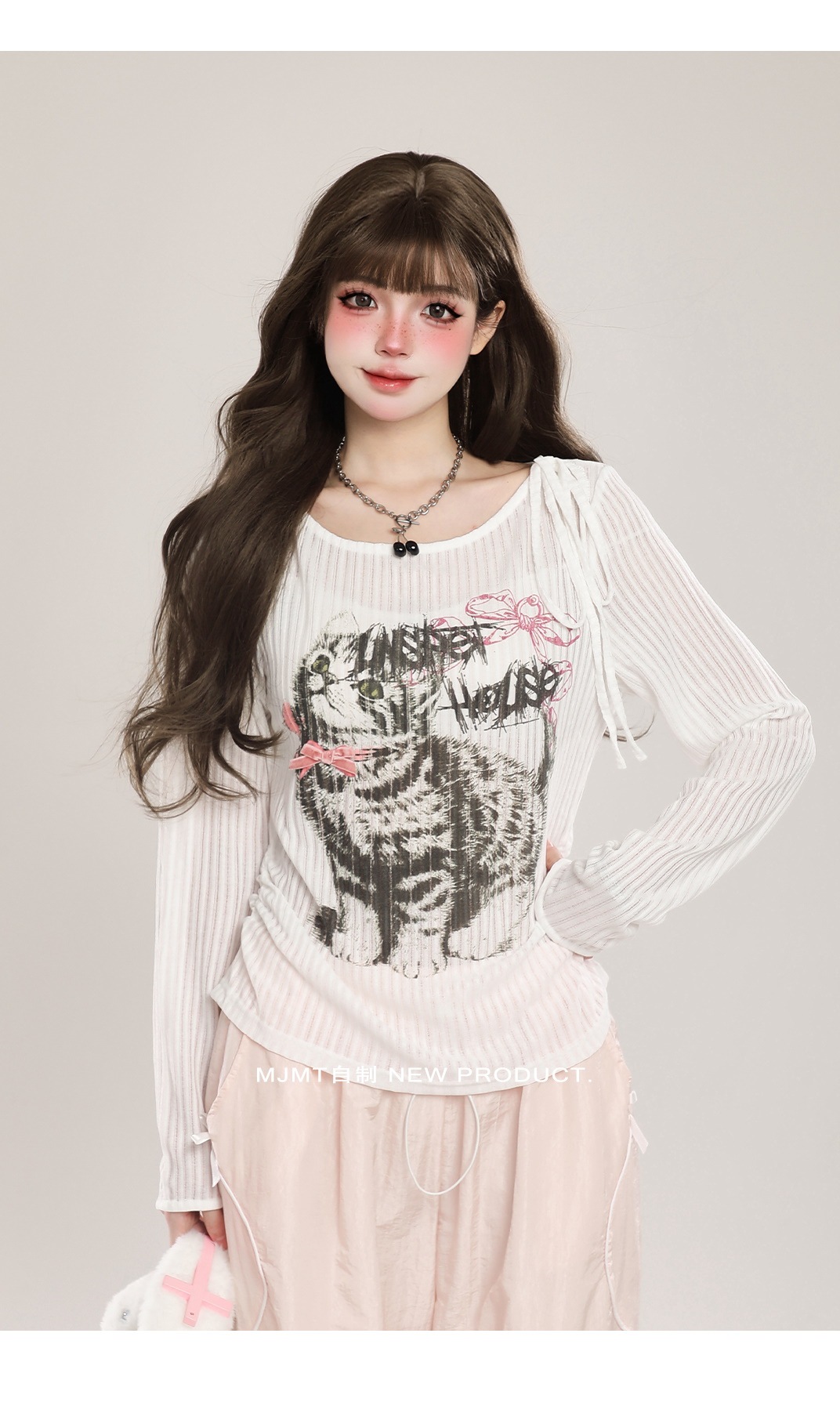 标题:2025春夏 長袖 Tシャツ ショート丈 カットソーレイヤード風重ね着トレンドプリントラウンドネックK-POPトップスカジュアル韓国系ストリートへそ出しタイト肌見せTファッションレディースかわいいミニ