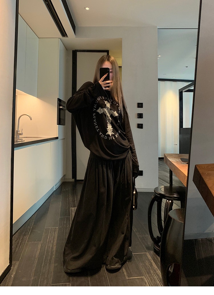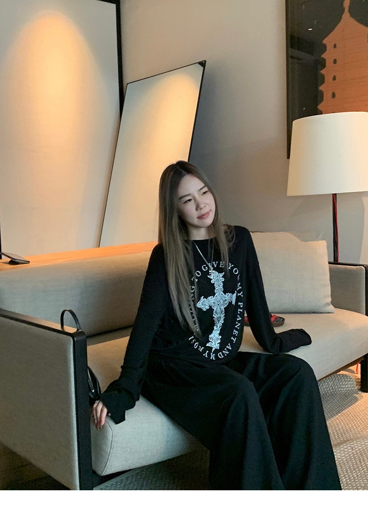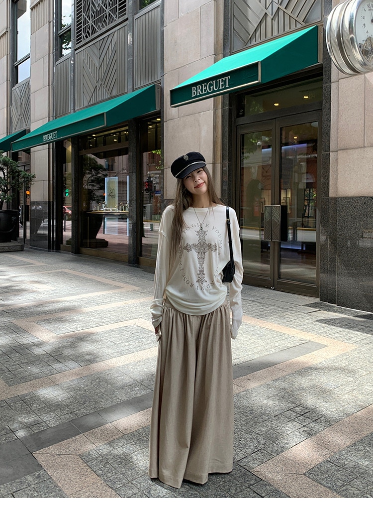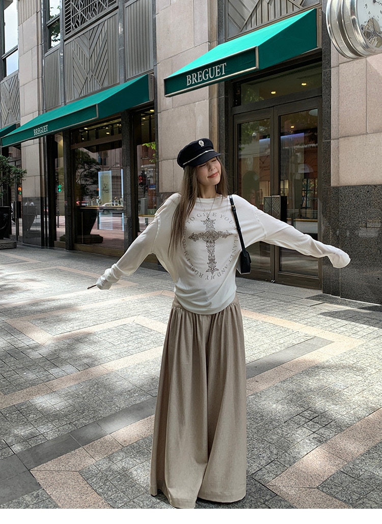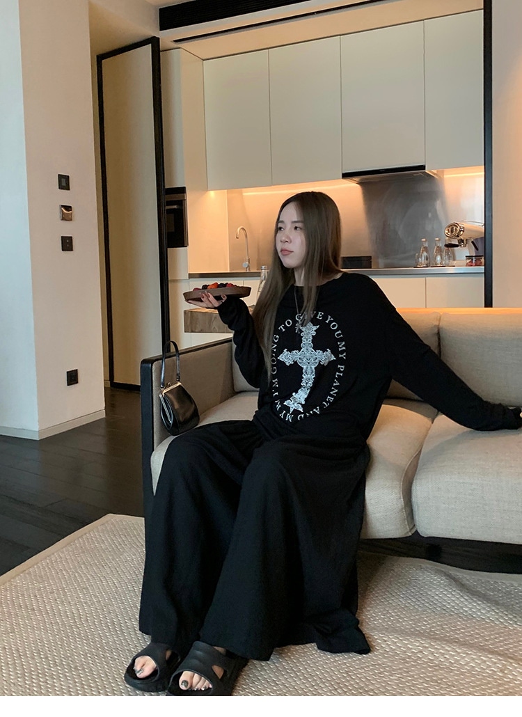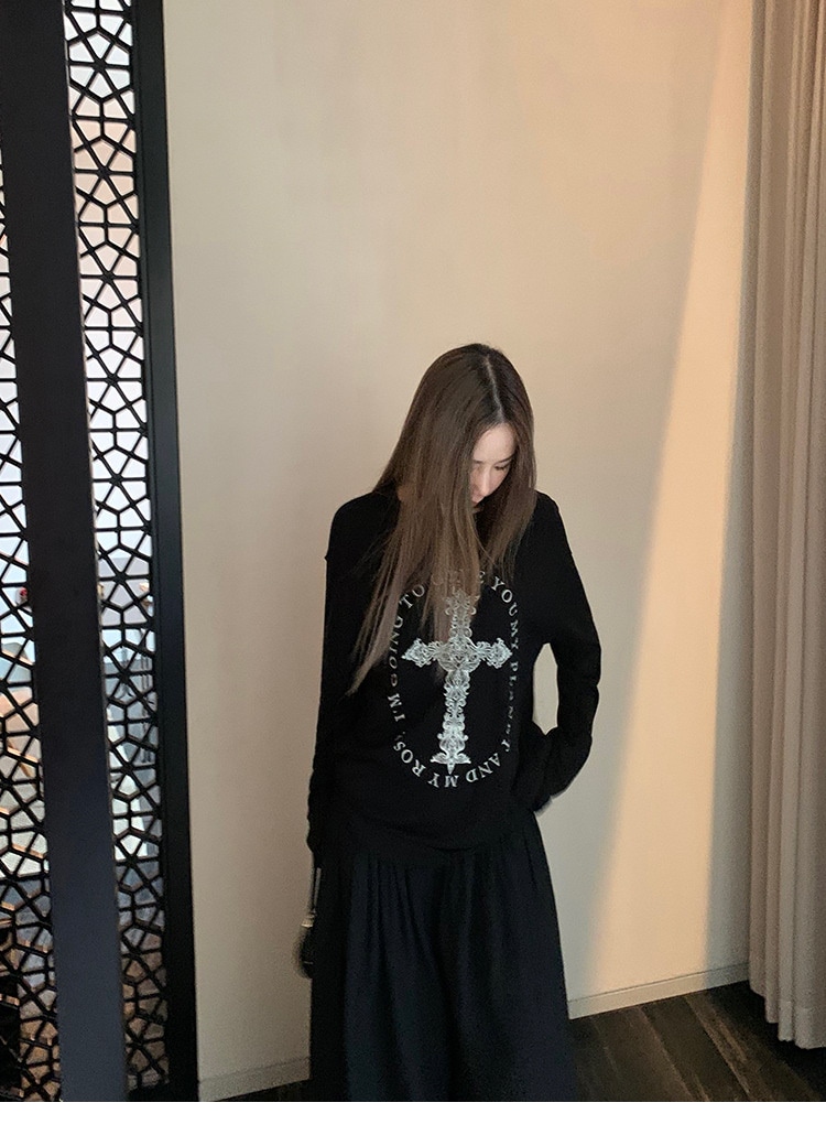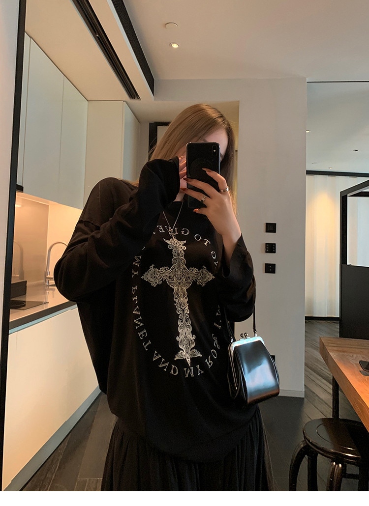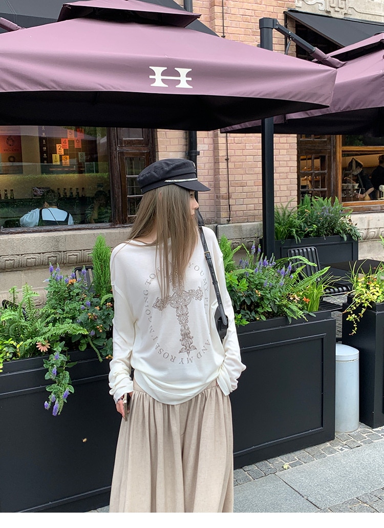 标题:2025 春夏ロンT クロスプリント オーバーサイズ クルーネック ドロップショルダー tシャツ トップス カットソー ゆったり 長袖 レトロ