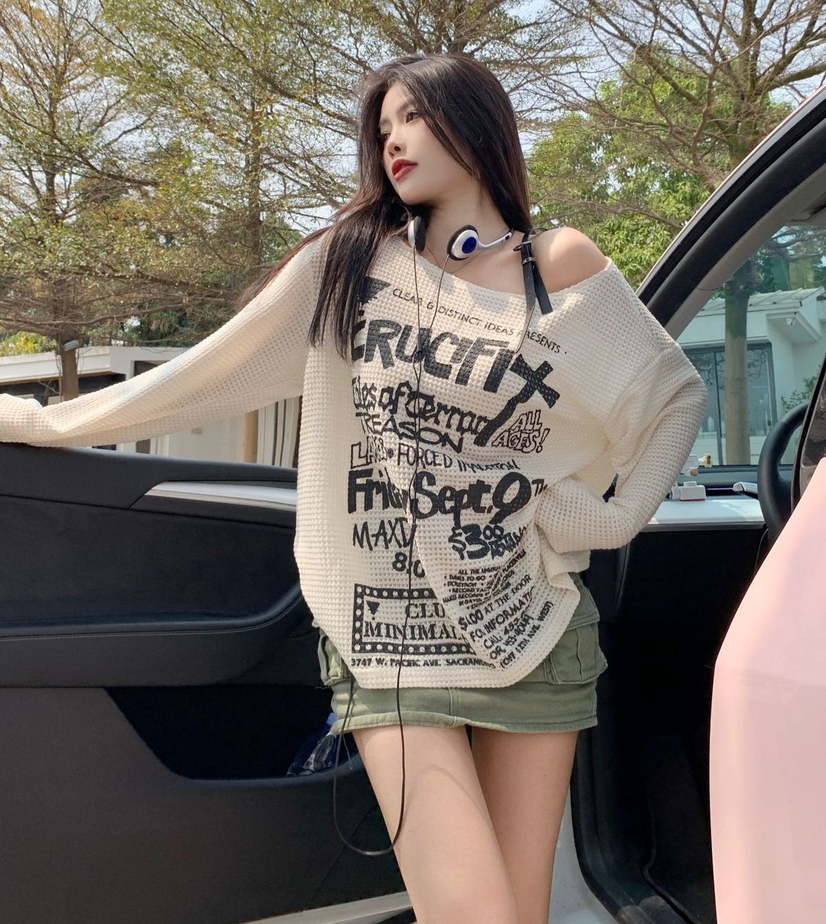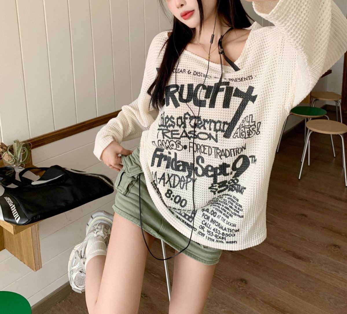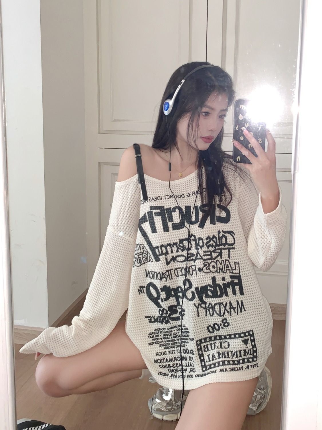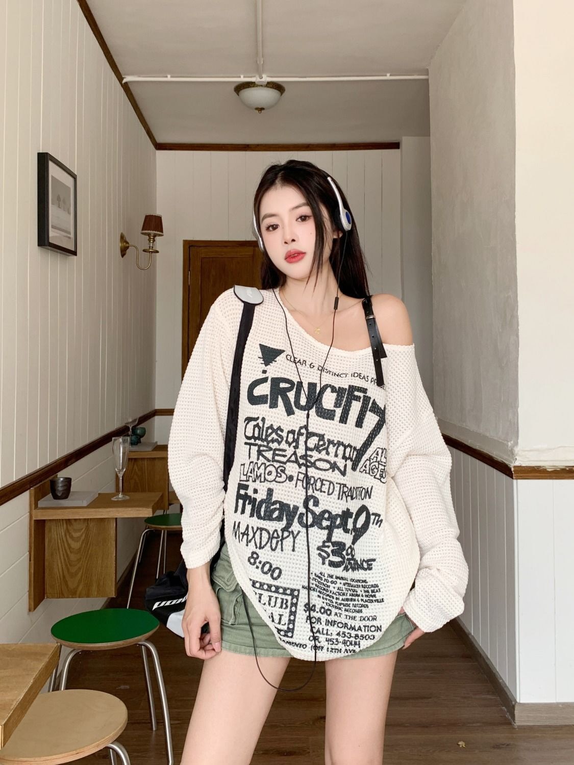 标题:2025 春夏ロンT レタープリント オフショルダー トップス ワンショルダー ショルダーストラップ tシャツ ゆったり ルーズ 長袖 レトロ