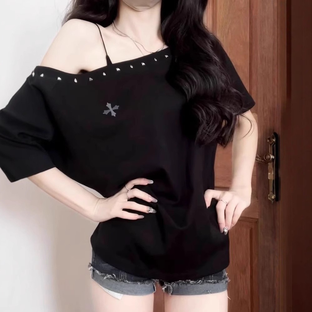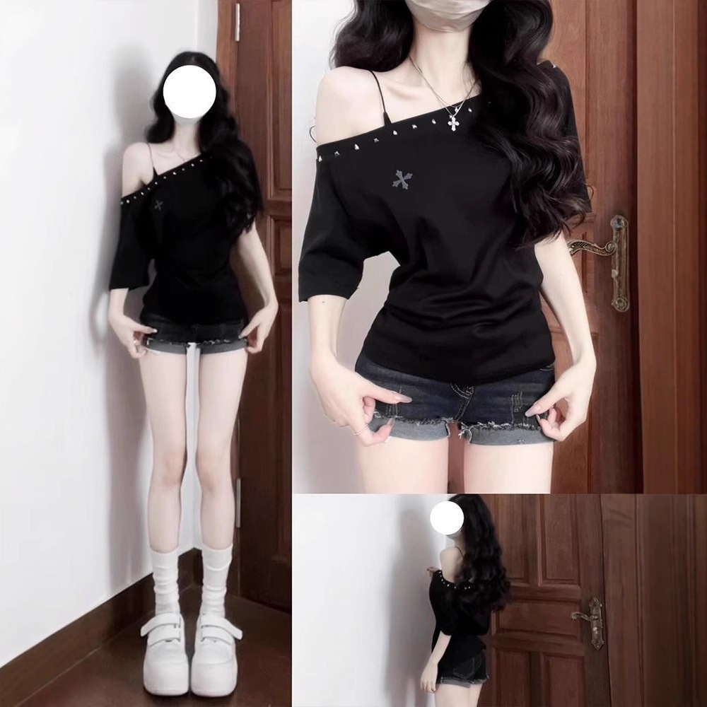 标题:2025 春夏Tシャツ スタッズ ワンショルダー スリムフィット Vネック トップス スリムtシャツ カットソー 半袖 レトロ