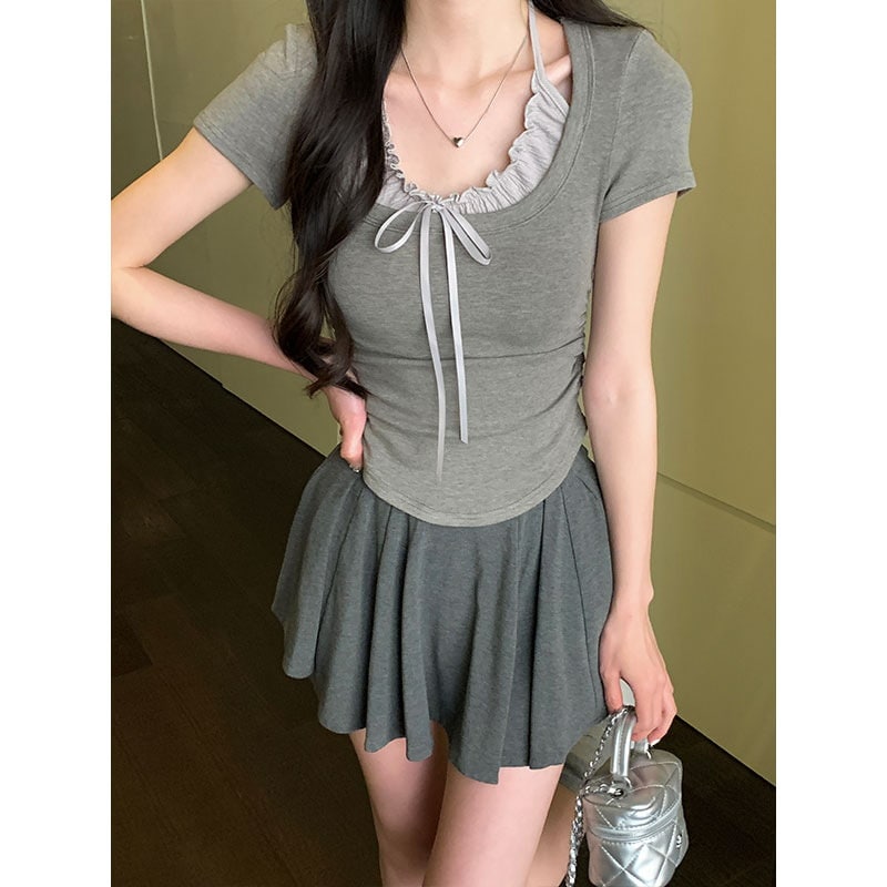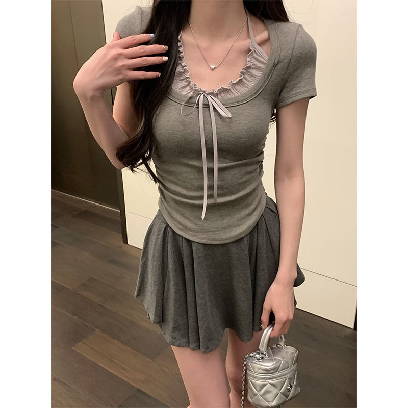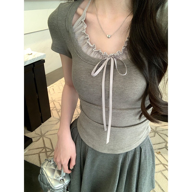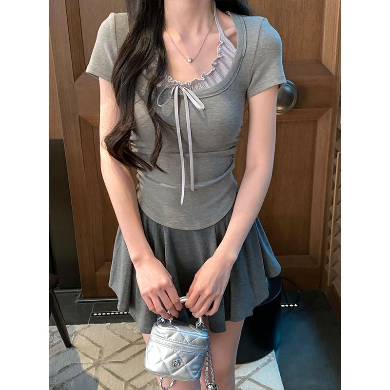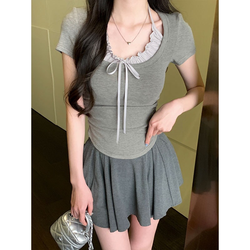 标题:2025 春夏フェイクレイヤード Tシャツ ホルターネック プリーツフリル リボン ドッキングトップス スリムフィット ショート丈 半袖 レトロ