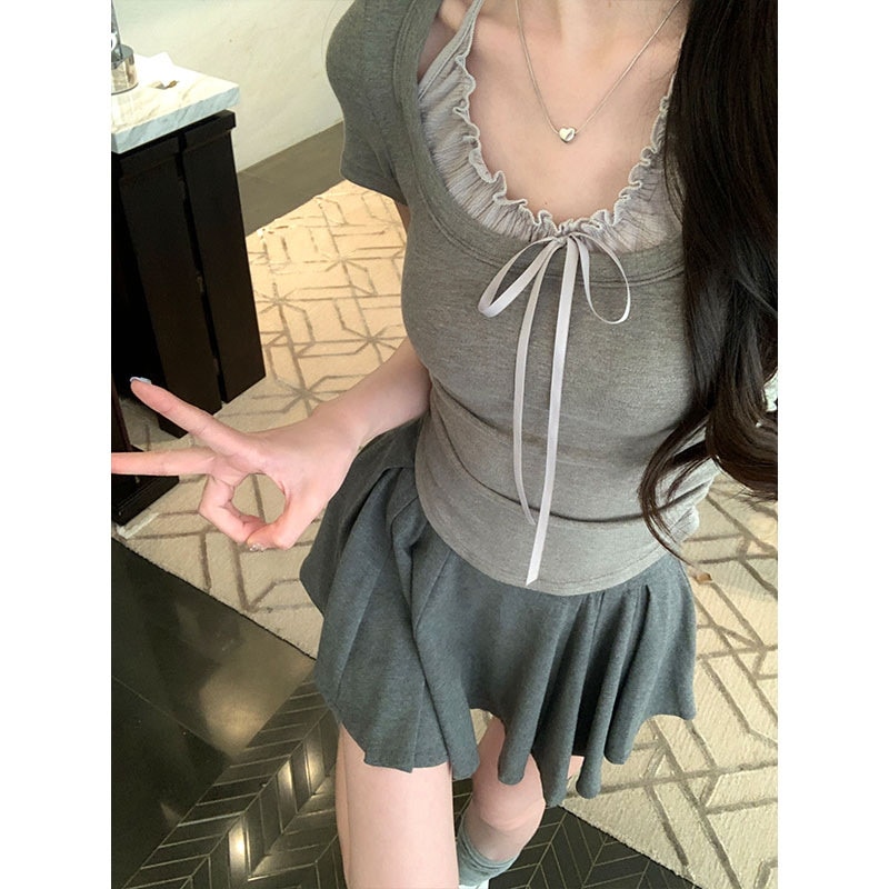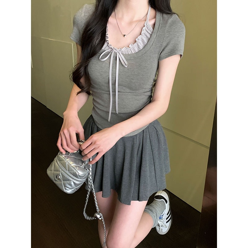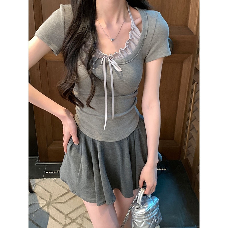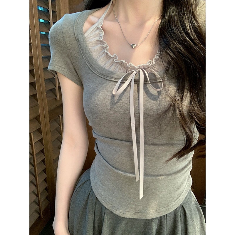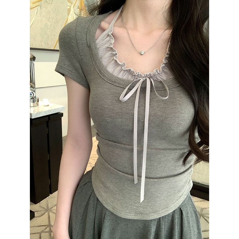 标题:2025 春夏フェイクレイヤード Tシャツ ホルターネック プリーツフリル リボン ドッキングトップス スリムフィット ショート丈 半袖 レトロ