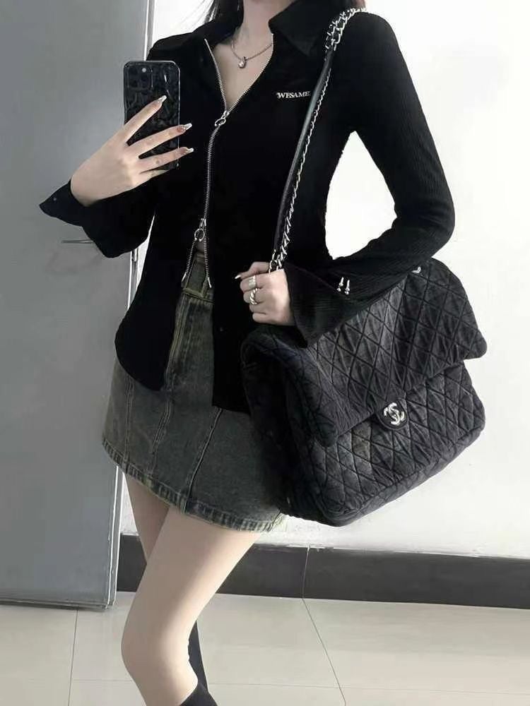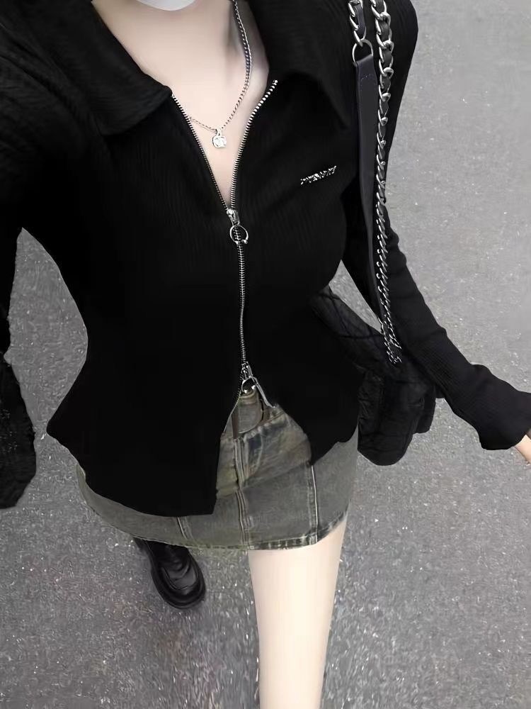 标题:2025春夏ダブルジップ トップス スリムフィット ポロカラー カーディガン ブラック 長袖 y2k .