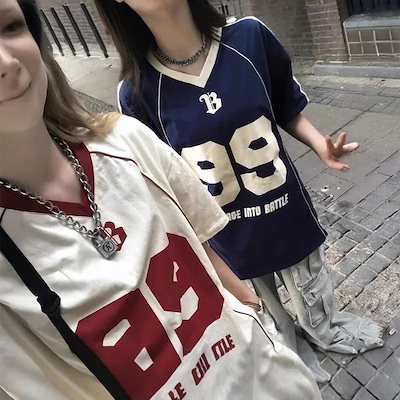 标题:2025春夏 韓国可愛い風トップス Tシャツ プリントファッション半袖ストリート系サイド丈フットシルエットシャツ衣装レディースサイズVネックユニセックスおしゃれカジュアル春ダンスラグラン配色T