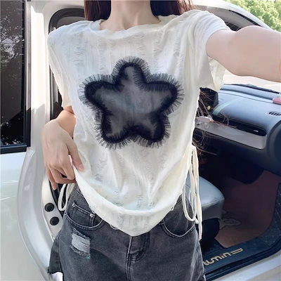 标题:2025春夏 Tシャツ レディース 半袖 韓国風 プリント ショート丈 トップス ストリートフィット感おしゃれ系グラフィックラウンドネックスリーブカジュアル大人可愛いサイド配色T