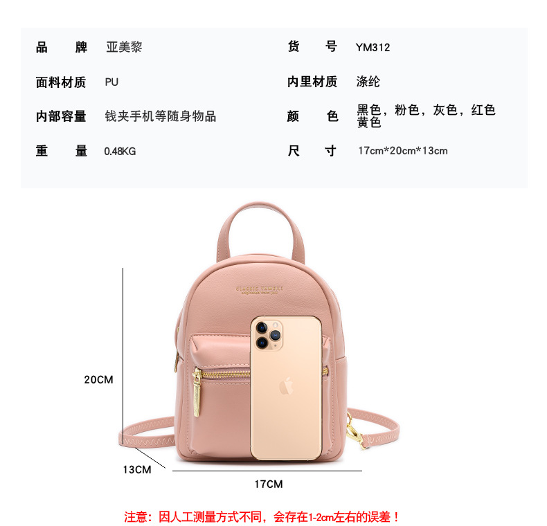 描述:颜色:黄色,红色,黑色,粉色,灰色,风格:潮流时尚,货源类别:现货,货号:YM312,材质:PU,箱包潮流款式:小圆包,箱包大小:MINI/迷你,流行元素:撞色,上市年份季节:2020年秋季,库存类型:整单,是否支持分销:支持分销,里料质地:涤纶,箱包形状:圆形,开盖方式:拉链,包内部结构:手机袋,证件袋,夹层拉链袋,图案:纯色,加工方式:软面,硬度:软,提拎部件:装卸式提把,外袋种类:立体袋,是否出口:否,品牌:yameili/亚美黎,是否跨境出口专供货源:否,肩带根数:单根,款式:女式双肩包,面料质地:PU,