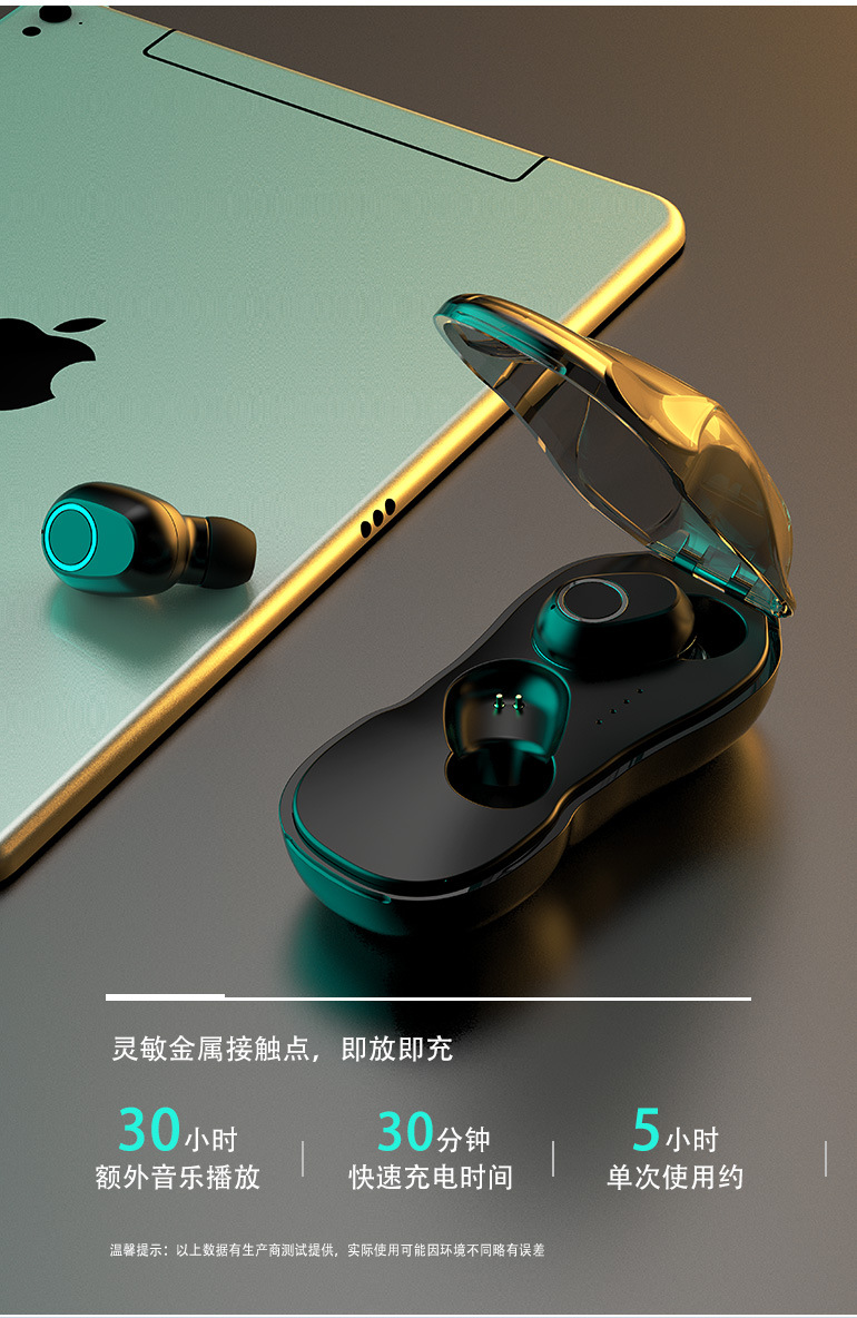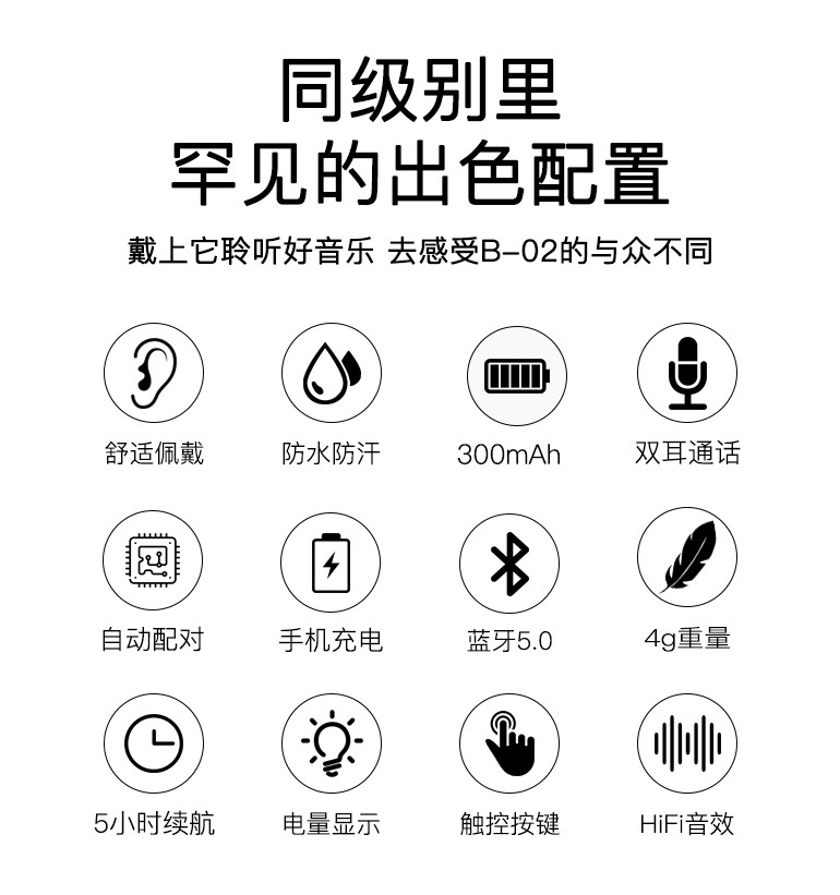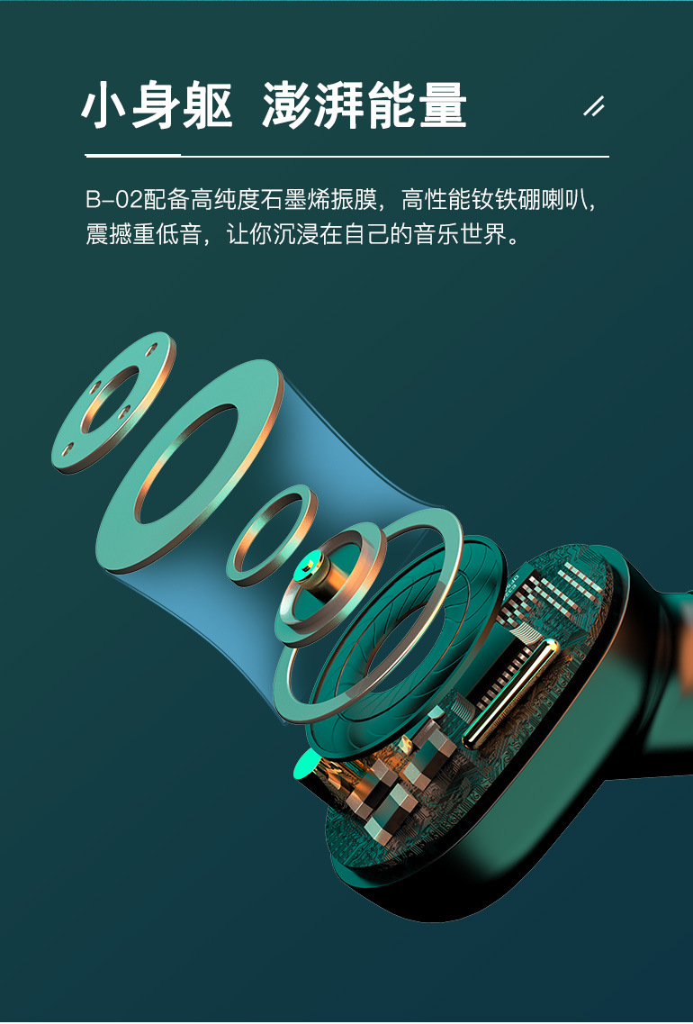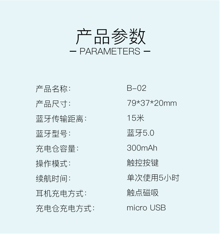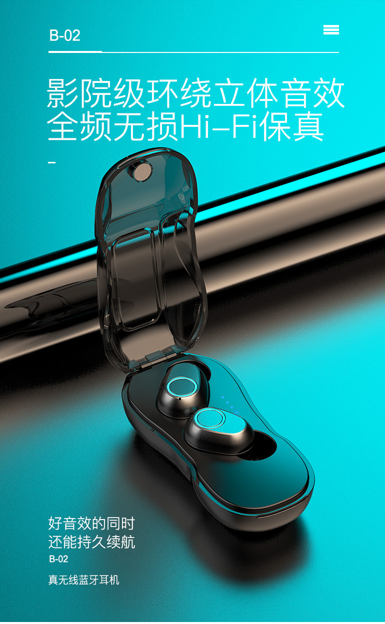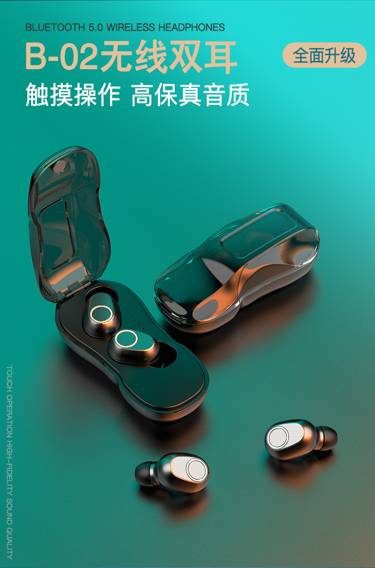 描述:Item number: B-02, transmission range: 10 meters, function: battery display, call function, NFC function, voice control, support music, multi-point connection, Bluetooth protocol: 5.0, channel: stereo, usage: earplug, whether Single and binaural: bilateral stereo