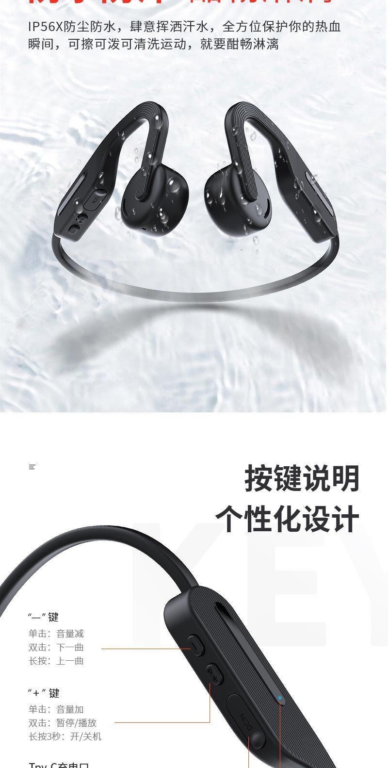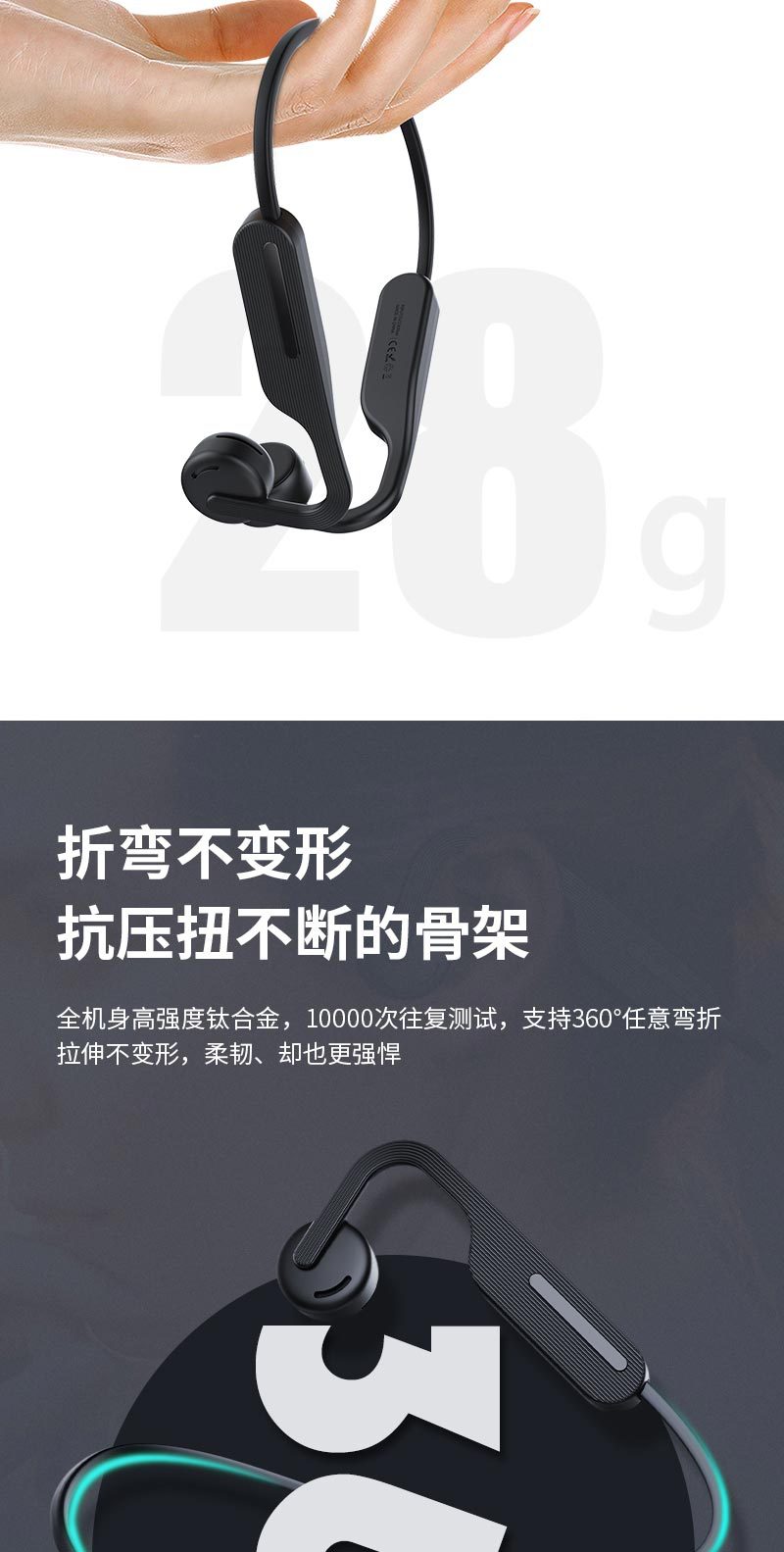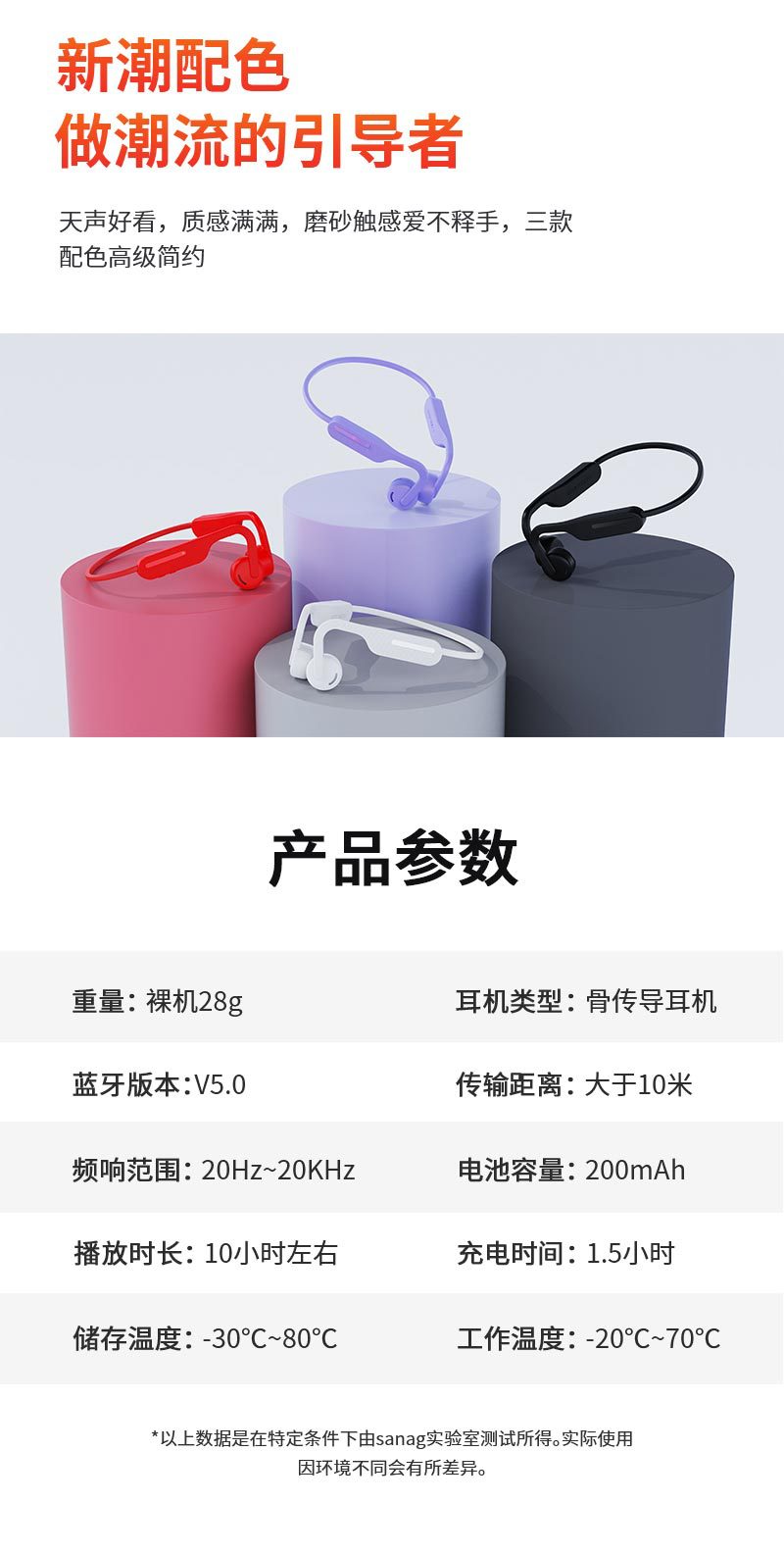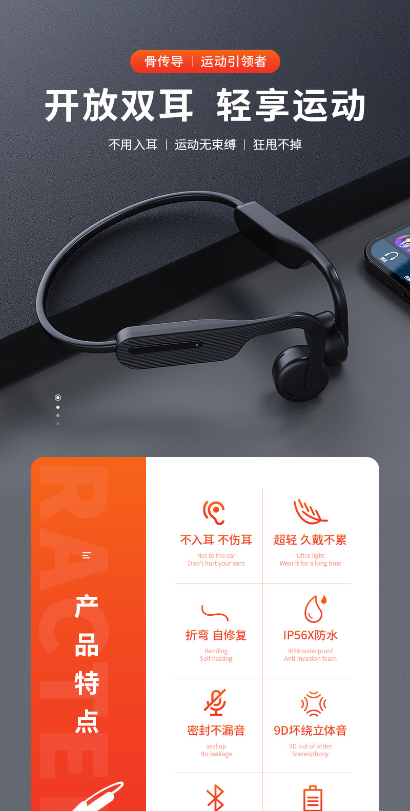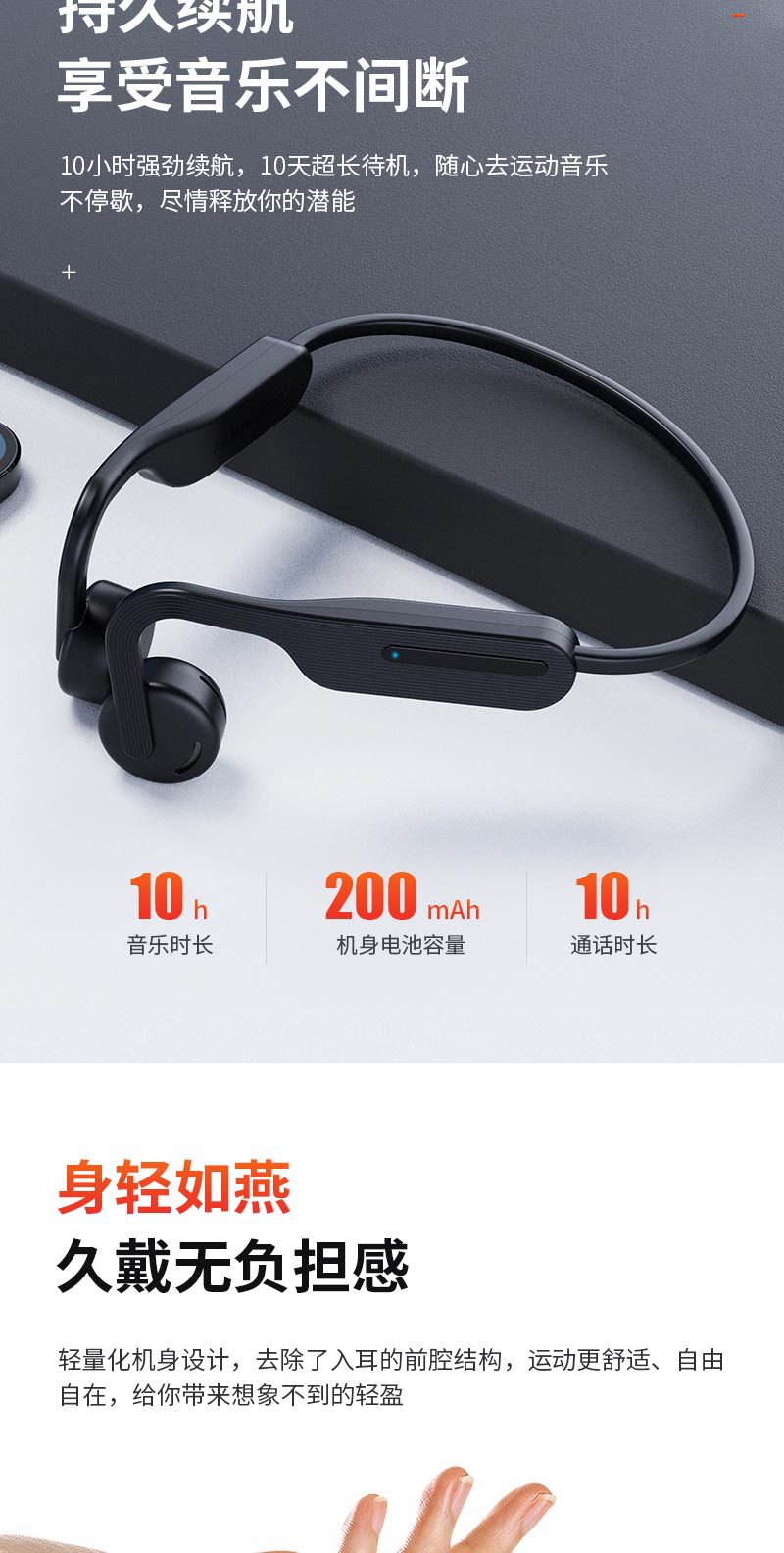 描述:Air conduction, transmission range: 10 meters, function: bone conduction, call function, voice control, support for music, Bluetooth protocol: 5.0, channel: stereo, use method: hanging ear type, whether single and double ears: bilateral stereo, wearing feeling : Comfortable to wear, Stability: Stable performance, Sound quality: Full sound quality