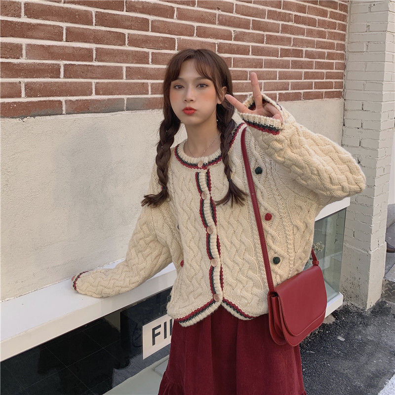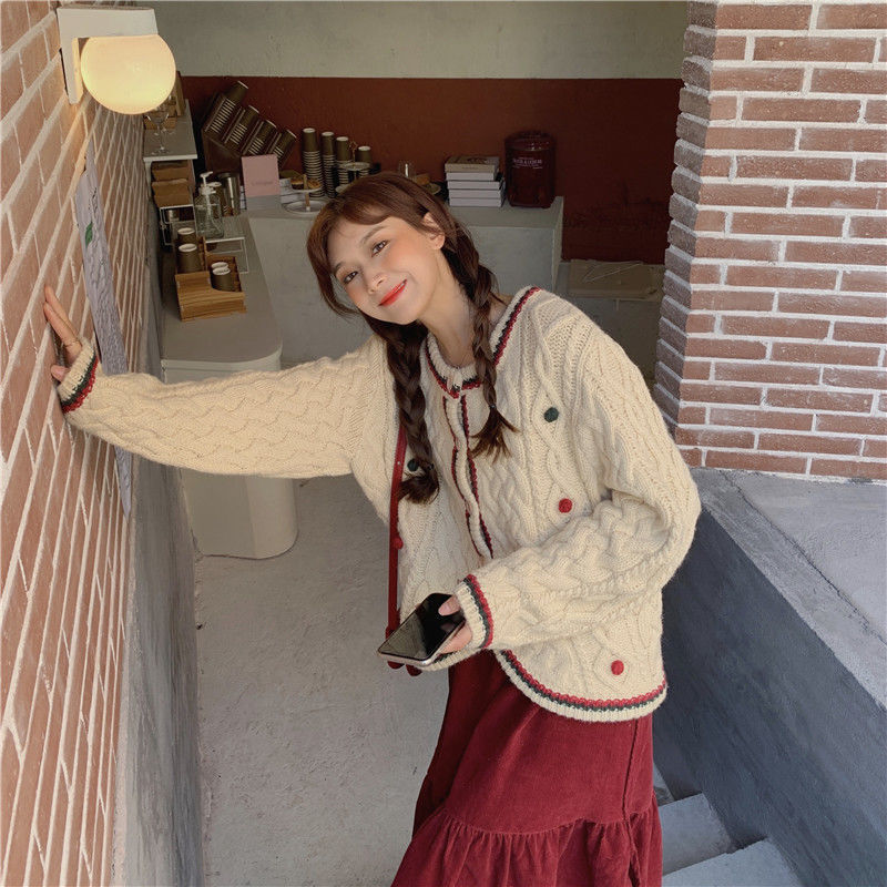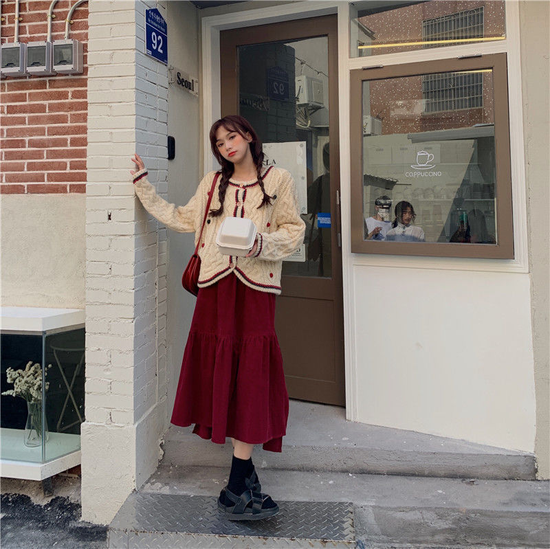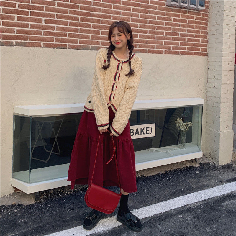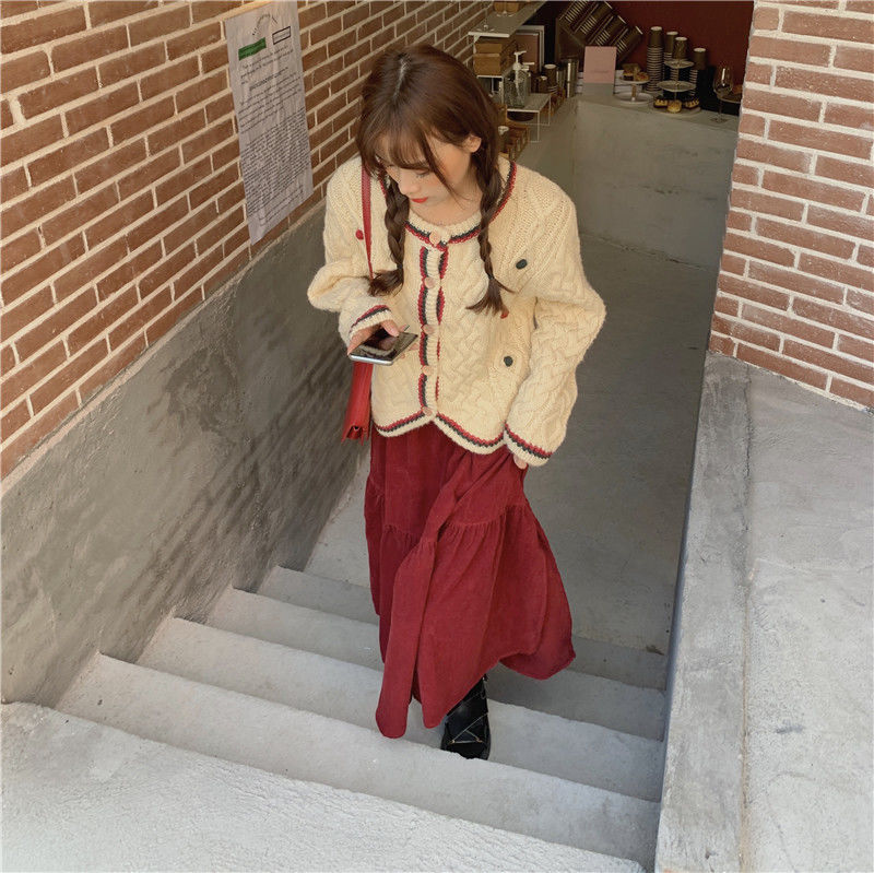 标题:【两件套】复古宽松减龄麻花开衫毛衣+高腰半身裙早秋时尚套装女