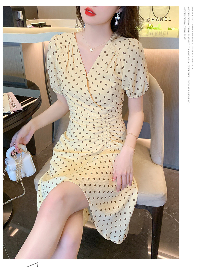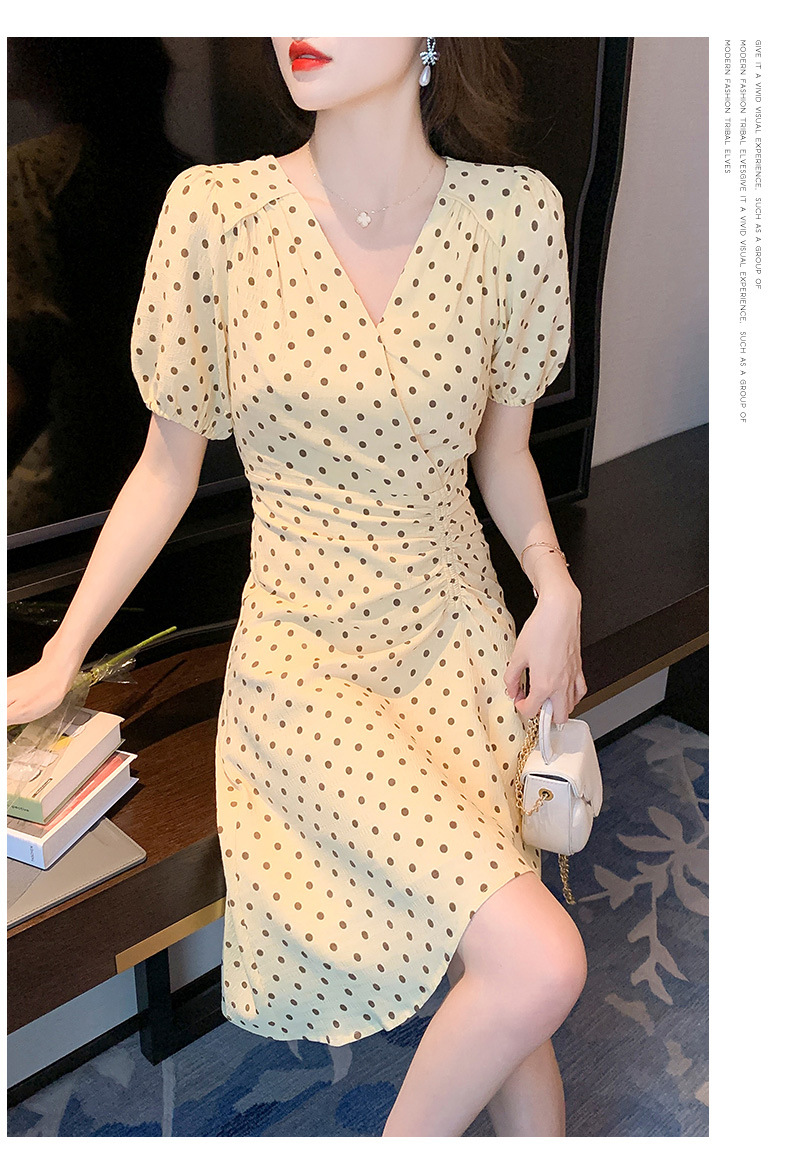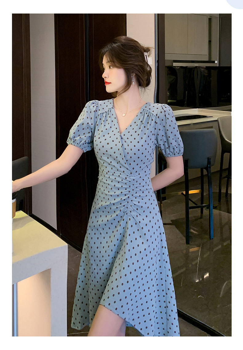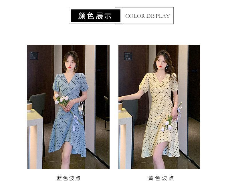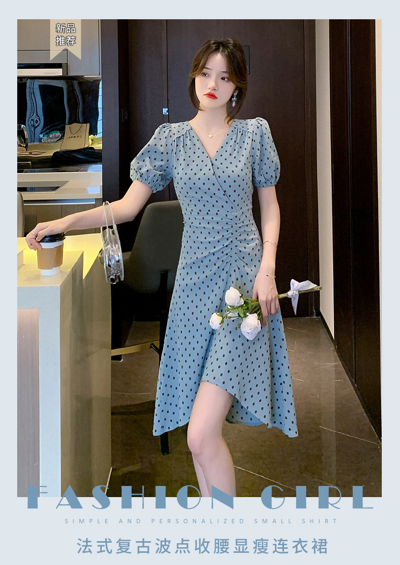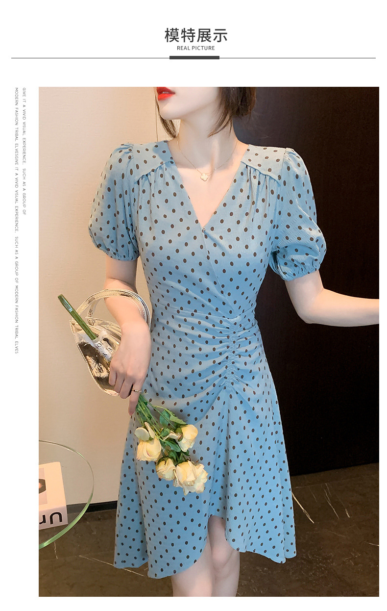 标题:法式优雅轻熟风波点连衣裙2022夏新款女复古泡泡袖V领收腰短裙子
