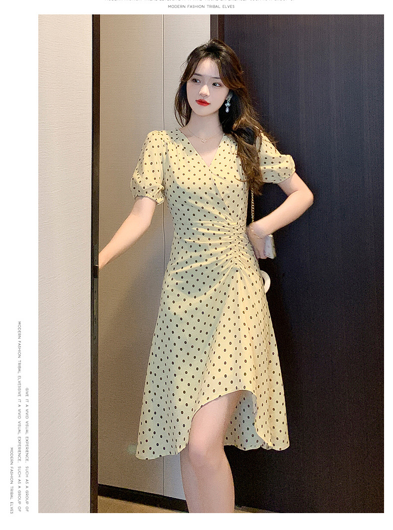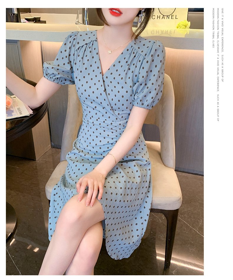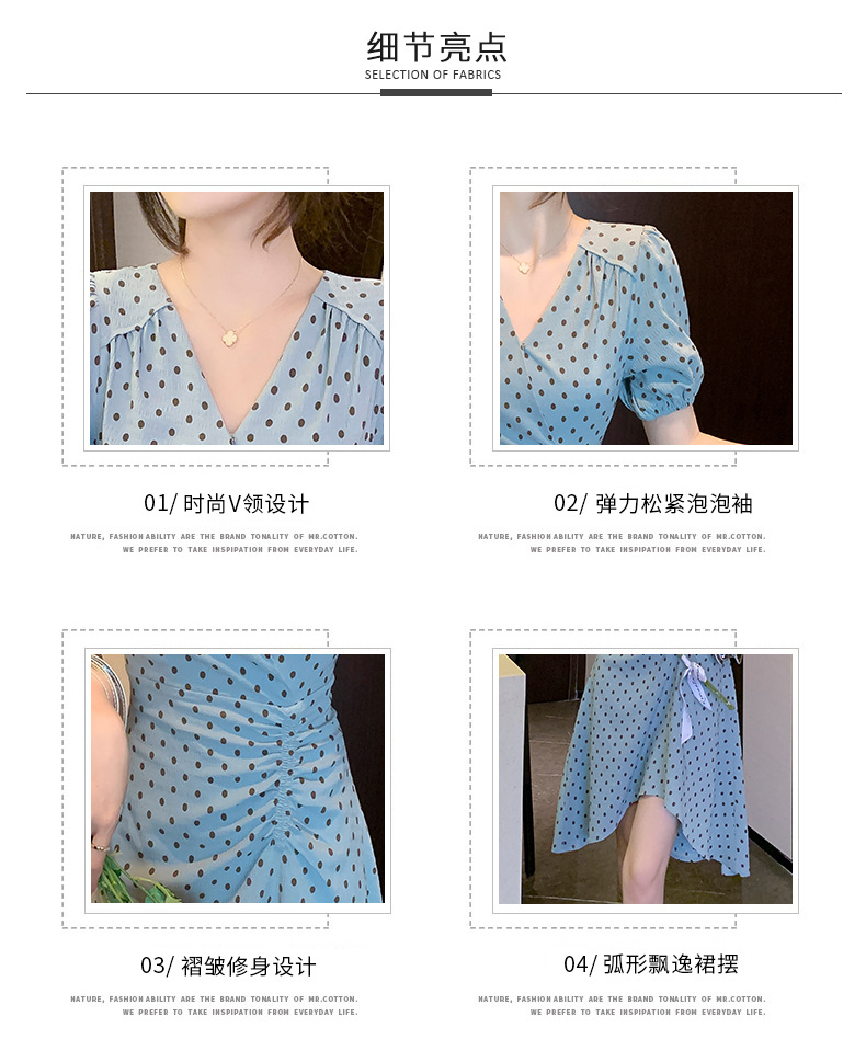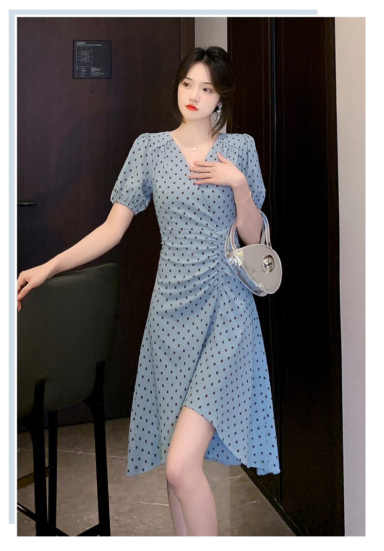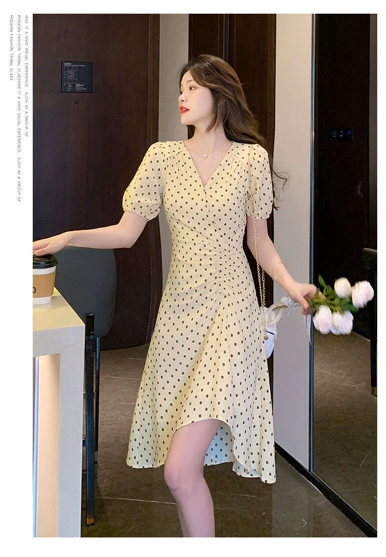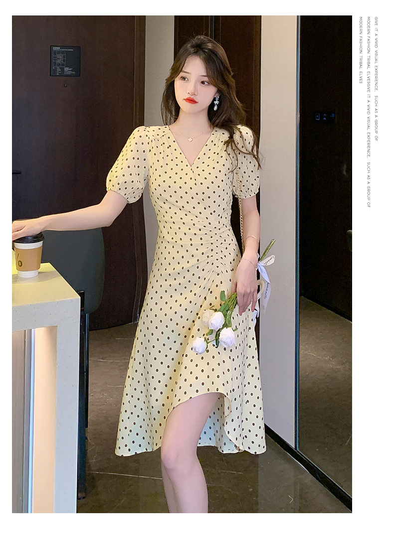 标题:法式优雅轻熟风波点连衣裙2022夏新款女复古泡泡袖V领收腰短裙子