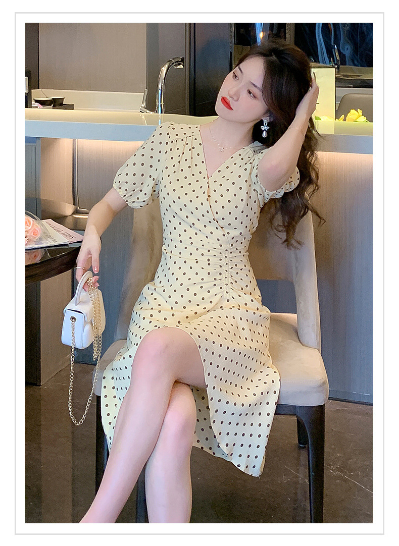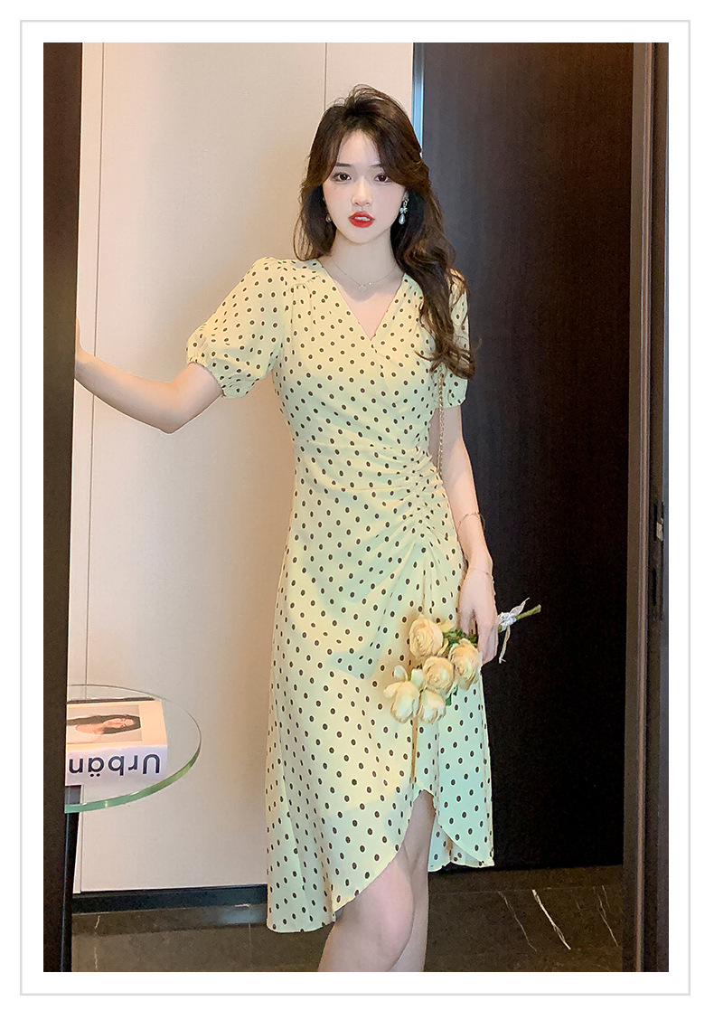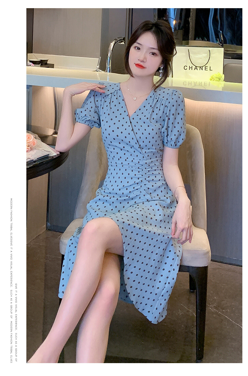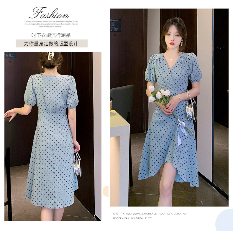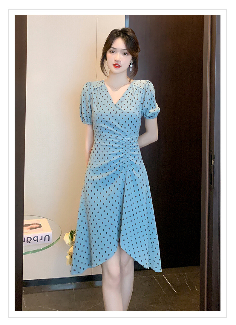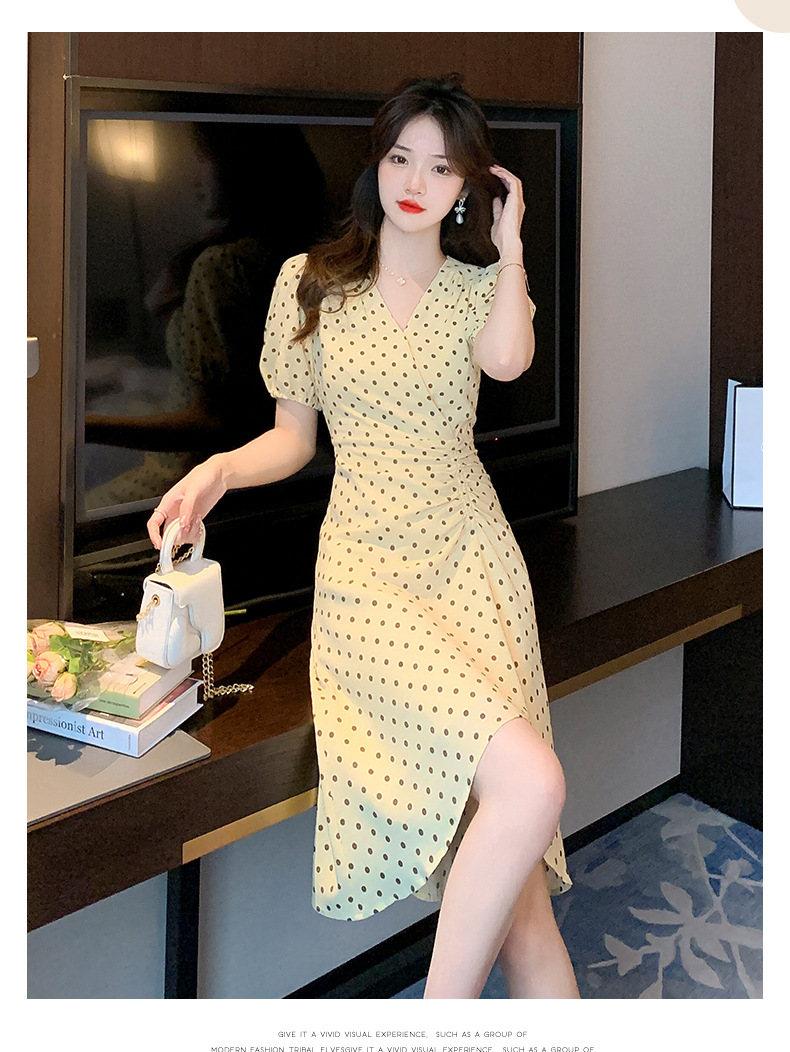 标题:法式优雅轻熟风波点连衣裙2022夏新款女复古泡泡袖V领收腰短裙子