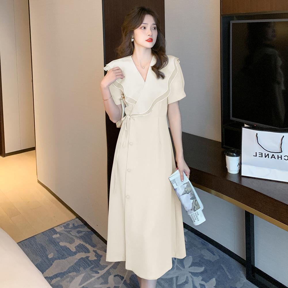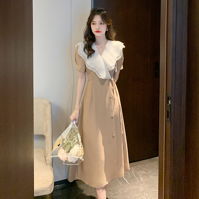 描述:面料名称:聚酯纤维,图案:纯色,工艺:拼贴/拼接,产地:广州,款式:基本款,组合形式:单件,裙长:长裙,裙型:A字裙,领型:V领,袖型:常规袖,袖长:短袖,腰型:高腰,流行元素:其他,上市年份/季节:2022年夏季,主面料成分:聚酯纤维(涤纶),主面料成分2:聚酯纤维(涤纶),货号:5073,颜色:米色,黑色,卡其,树莓色,尺码:S,M,L,XL,XXL,风格类型:气质通勤,门襟:系带,主面料成分含量:90%(不含)-95%(含),风格:优雅风,通勤风,知性风,跨境风格类型:气质优雅,是否跨境货源:是,主面料成分2含量:50%(不含)-70%(含),主要下游销售地区1:欧美,主要下游销售地区2:其他,
