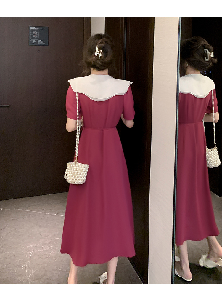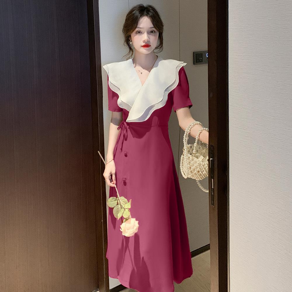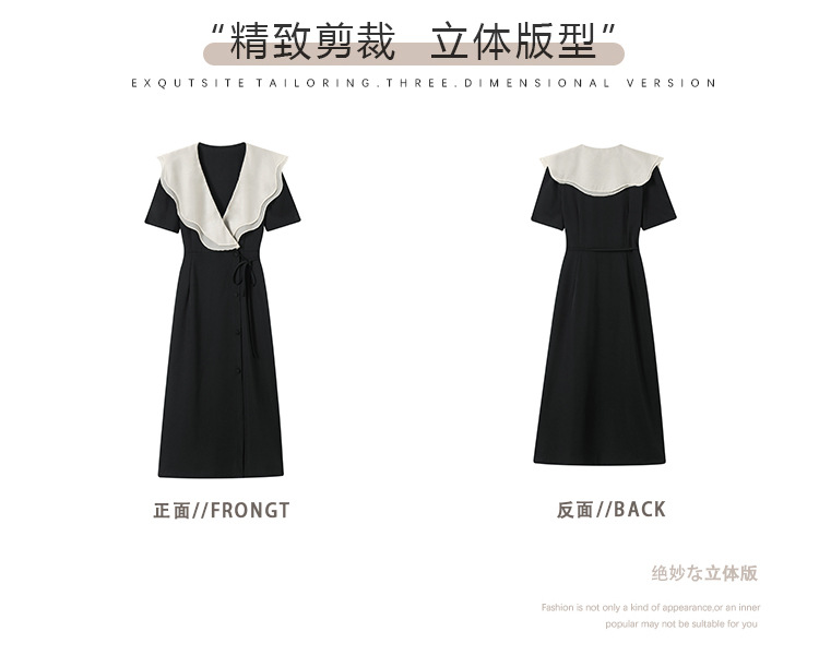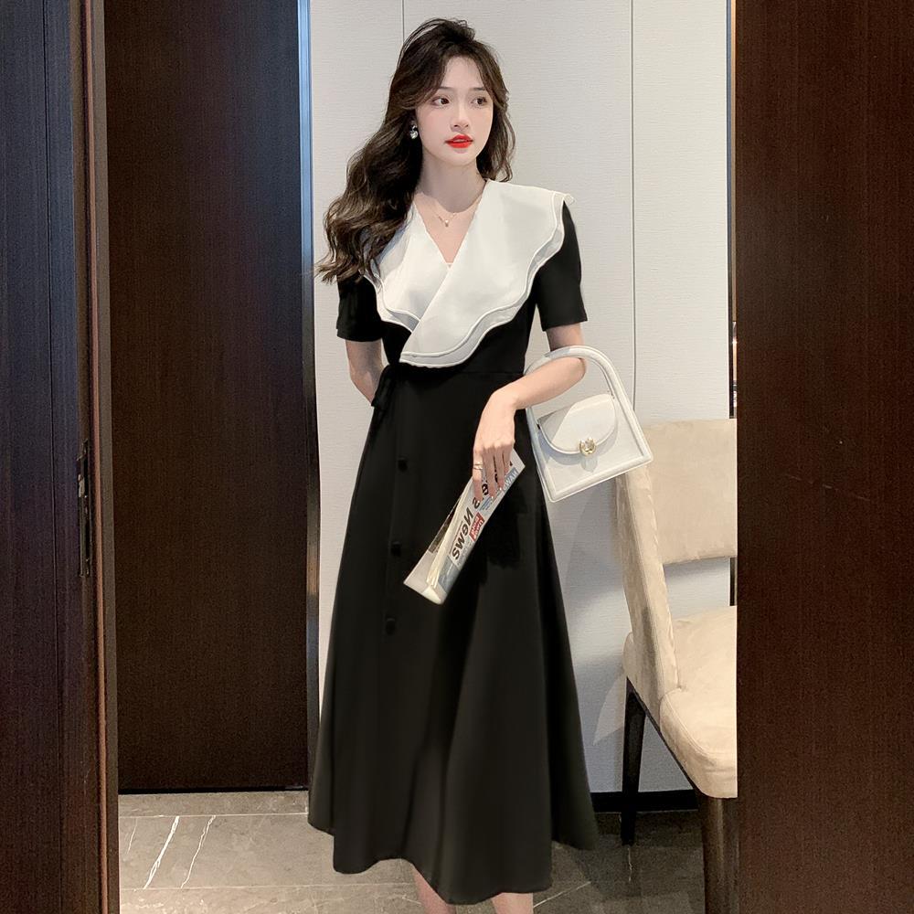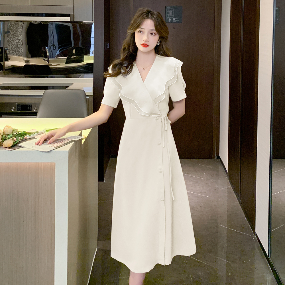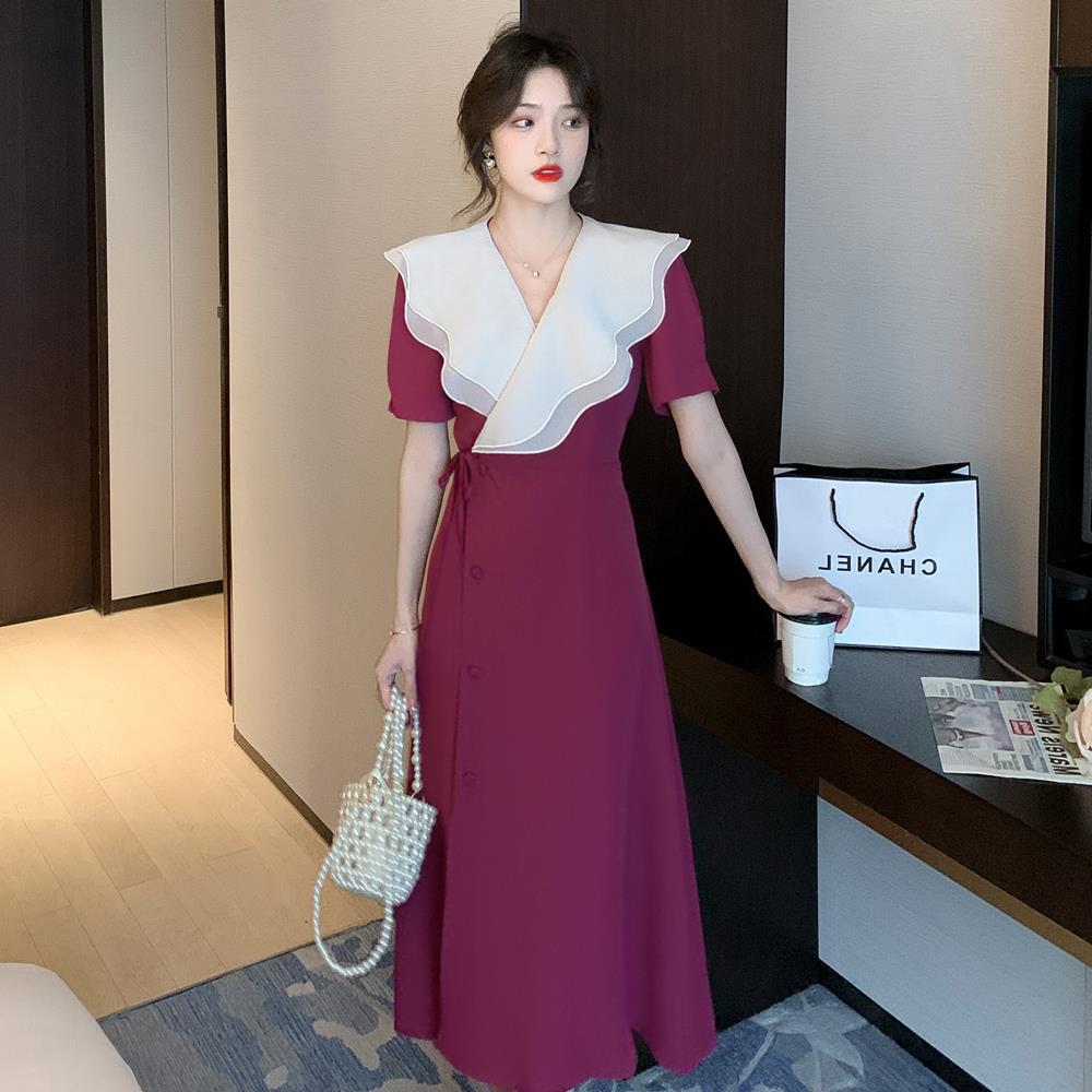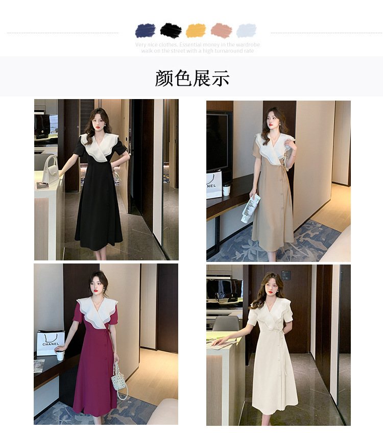 标题:高品质2022夏季新款法式复古V领荷叶边大翻领遮肉显瘦长款连衣裙