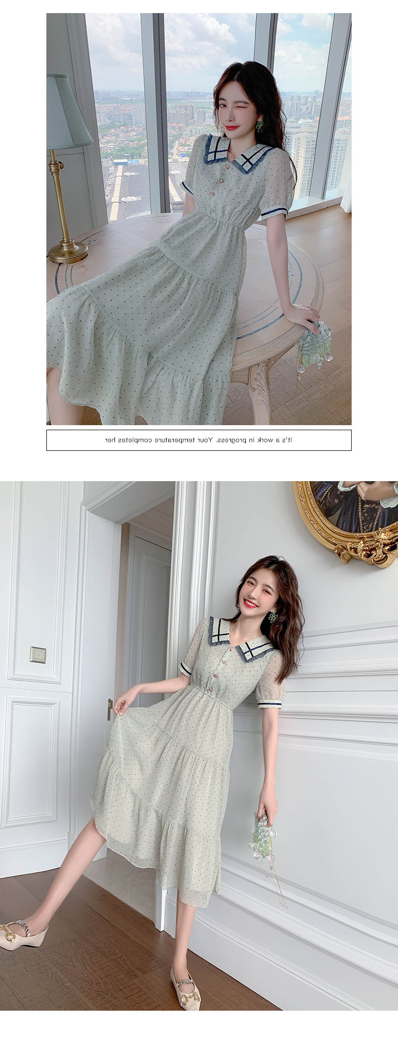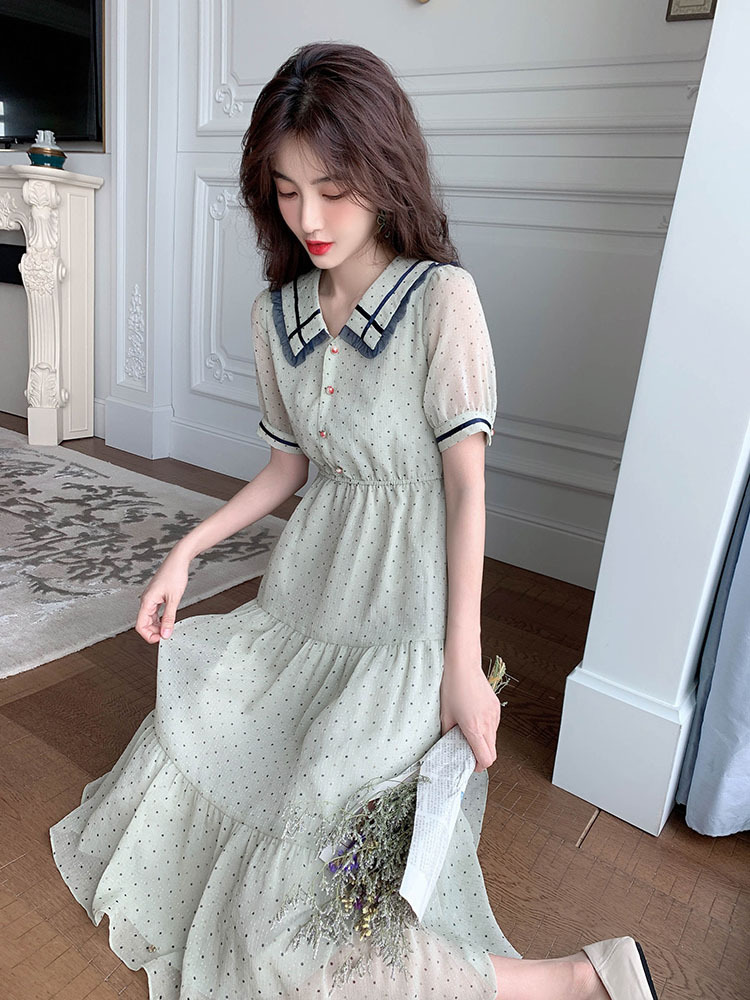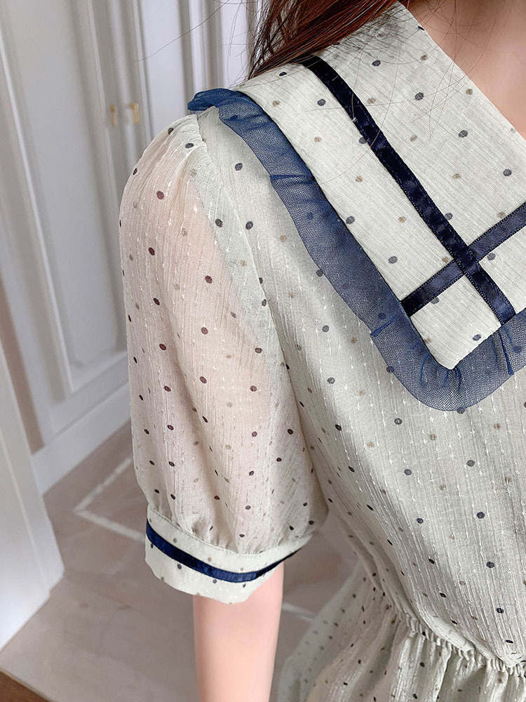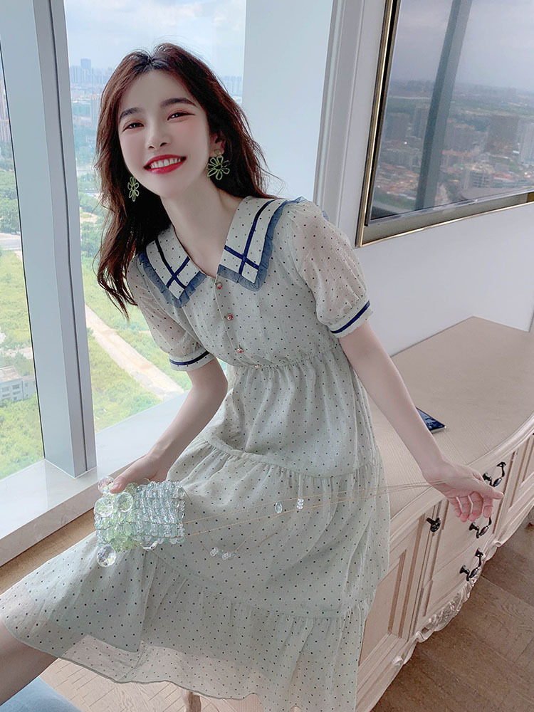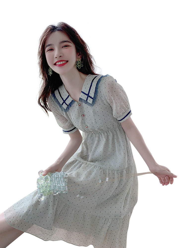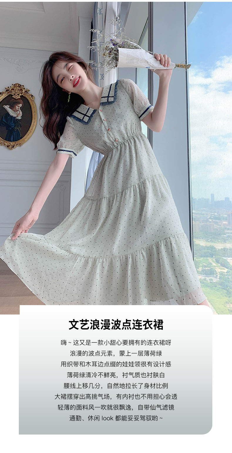 描述:面料名称:雪纺,主图来源:官方图片,货源类别:现货,风格:OL通勤,图案:波点,工艺:拼贴/拼接,产地:广州,库存类型:整单,款式:基本款,组合形式:单件,裙长:中长裙,裙型:大摆型,领型:娃娃领,袖型:常规袖,袖长:短袖,腰型:高腰,衣门襟:套头,流行元素:拼接,上市年份/季节:2021年夏季,主面料成分:聚酯纤维,主面料成分的含量:51%-70%,主面料成分2:聚酯纤维(涤纶),主面料成分2的含量:30%-50%,里料成分:聚酯纤维(涤纶),里料成分含量:10%以下,是否库存:是,货号:6043,品牌:否,主面料产地是否进口:否,是否外贸:是,颜色:图片色,尺码:S,M,L,XL,主要下游平台:ebay,亚马逊,wish,速卖通,独立站,LAZADA,主要销售地区:非洲,欧洲,南美,东南亚,北美,东北亚,中东,有可授权的自有品牌:否,适合年龄:25-29周岁,是否跨境出口专供货源:是,风格类型:气质通勤,适用季节:夏季,服装款式细节:波点,