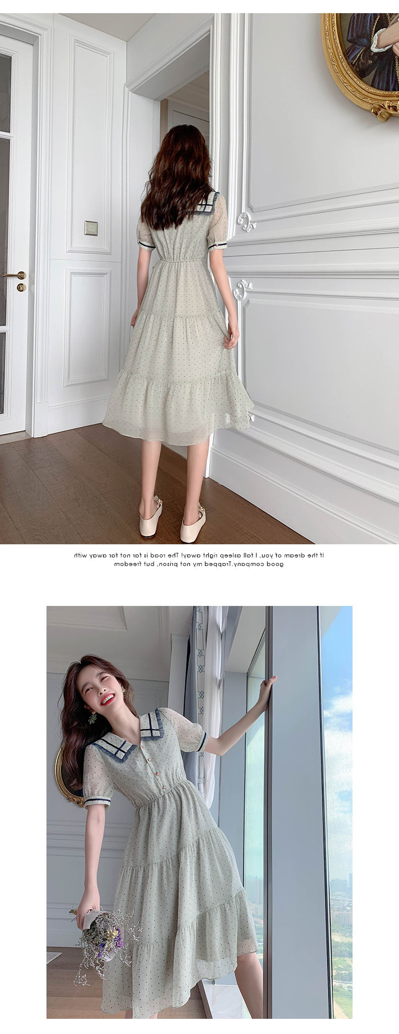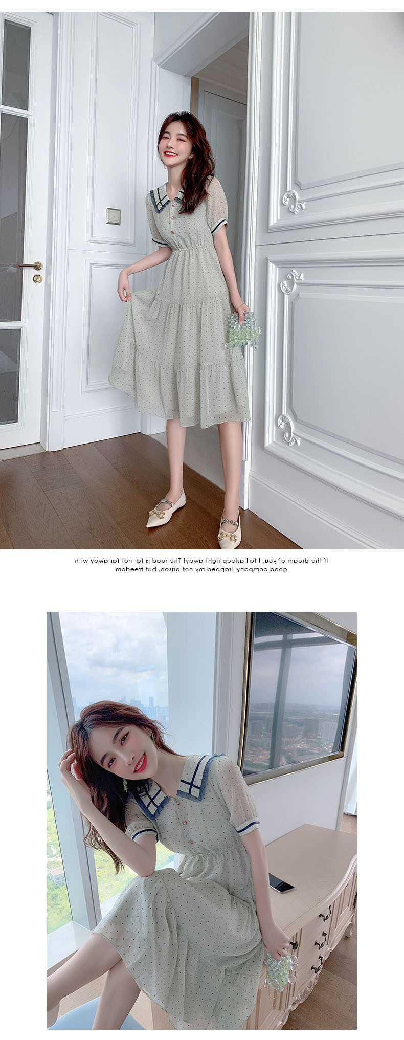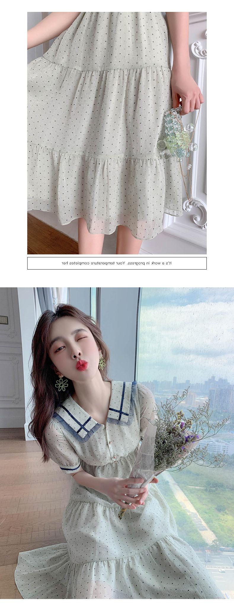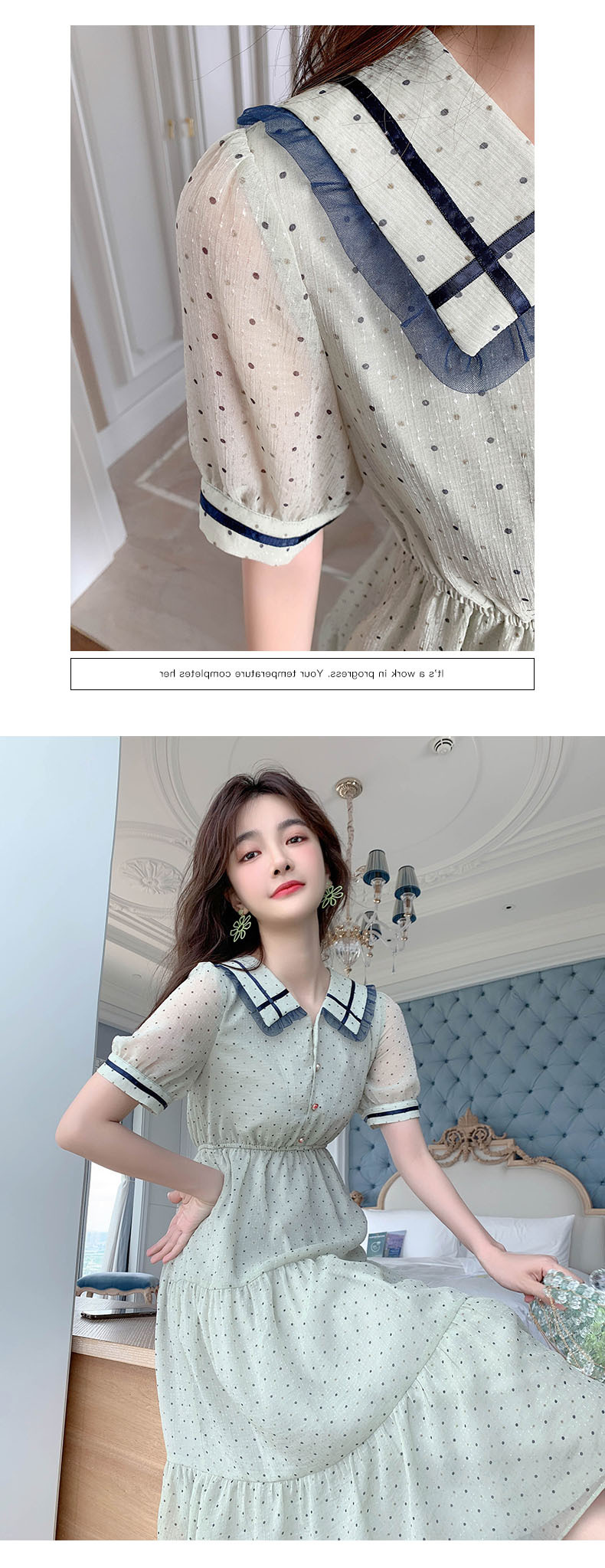 描述:面料名称:雪纺,主图来源:官方图片,货源类别:现货,风格:OL通勤,图案:波点,工艺:拼贴/拼接,产地:广州,库存类型:整单,款式:基本款,组合形式:单件,裙长:中长裙,裙型:大摆型,领型:娃娃领,袖型:常规袖,袖长:短袖,腰型:高腰,衣门襟:套头,流行元素:拼接,上市年份/季节:2021年夏季,主面料成分:聚酯纤维,主面料成分的含量:51%-70%,主面料成分2:聚酯纤维(涤纶),主面料成分2的含量:30%-50%,里料成分:聚酯纤维(涤纶),里料成分含量:10%以下,是否库存:是,货号:6043,品牌:否,主面料产地是否进口:否,是否外贸:是,颜色:图片色,尺码:S,M,L,XL,主要下游平台:ebay,亚马逊,wish,速卖通,独立站,LAZADA,主要销售地区:非洲,欧洲,南美,东南亚,北美,东北亚,中东,有可授权的自有品牌:否,适合年龄:25-29周岁,是否跨境出口专供货源:是,风格类型:气质通勤,适用季节:夏季,服装款式细节:波点,