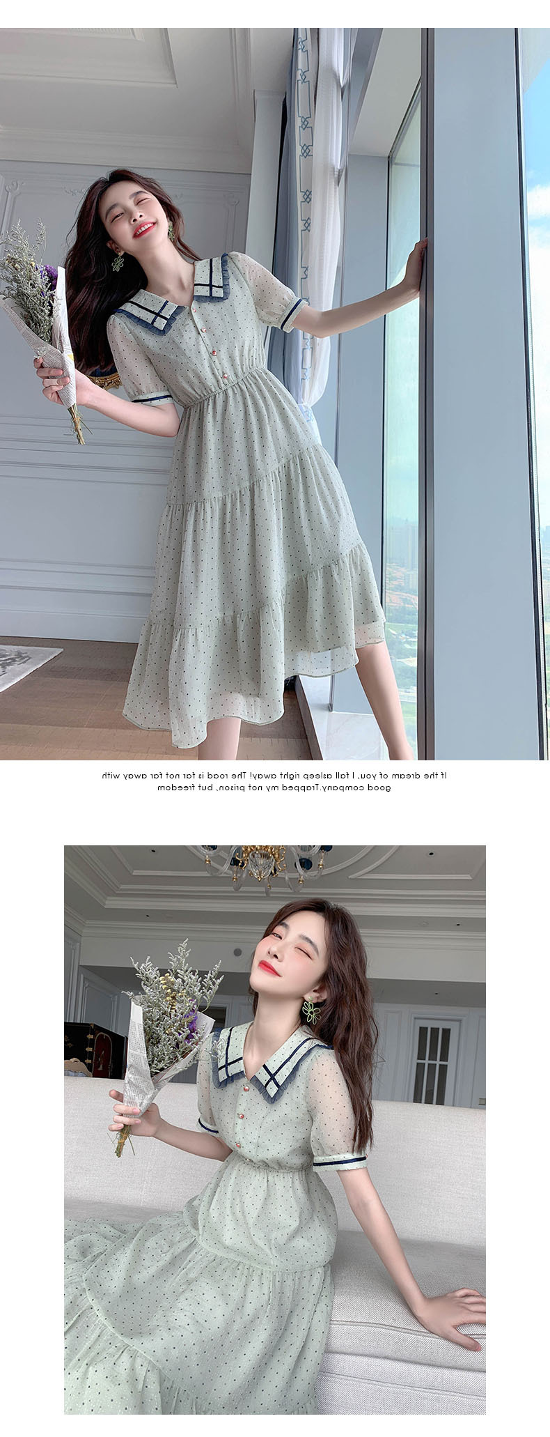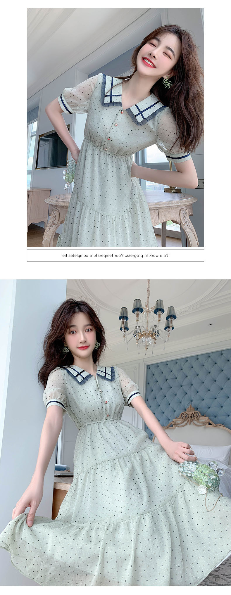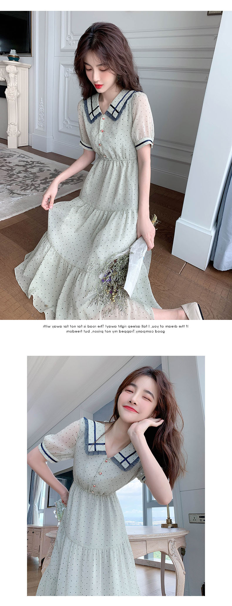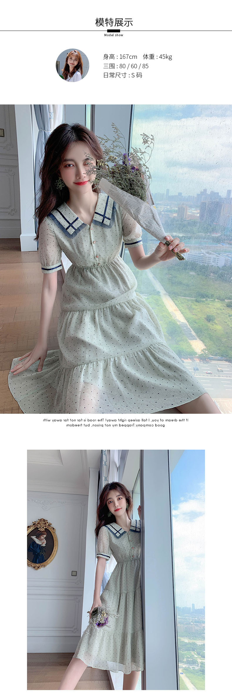 描述:面料名称:雪纺,主图来源:官方图片,货源类别:现货,风格:OL通勤,图案:波点,工艺:拼贴/拼接,产地:广州,库存类型:整单,款式:基本款,组合形式:单件,裙长:中长裙,裙型:大摆型,领型:娃娃领,袖型:常规袖,袖长:短袖,腰型:高腰,衣门襟:套头,流行元素:拼接,上市年份/季节:2021年夏季,主面料成分:聚酯纤维,主面料成分的含量:51%-70%,主面料成分2:聚酯纤维(涤纶),主面料成分2的含量:30%-50%,里料成分:聚酯纤维(涤纶),里料成分含量:10%以下,是否库存:是,货号:6043,品牌:否,主面料产地是否进口:否,是否外贸:是,颜色:图片色,尺码:S,M,L,XL,主要下游平台:ebay,亚马逊,wish,速卖通,独立站,LAZADA,主要销售地区:非洲,欧洲,南美,东南亚,北美,东北亚,中东,有可授权的自有品牌:否,适合年龄:25-29周岁,是否跨境出口专供货源:是,风格类型:气质通勤,适用季节:夏季,服装款式细节:波点,