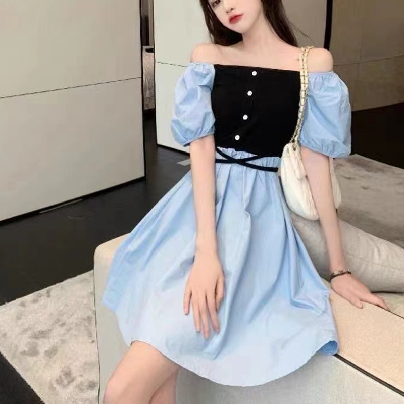 标题:夏新款减龄裙子洋气显瘦别致裙子一字肩拼接茶歇公主裙连衣裙女装
