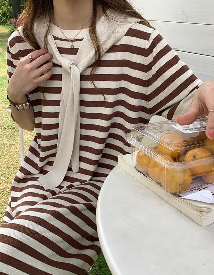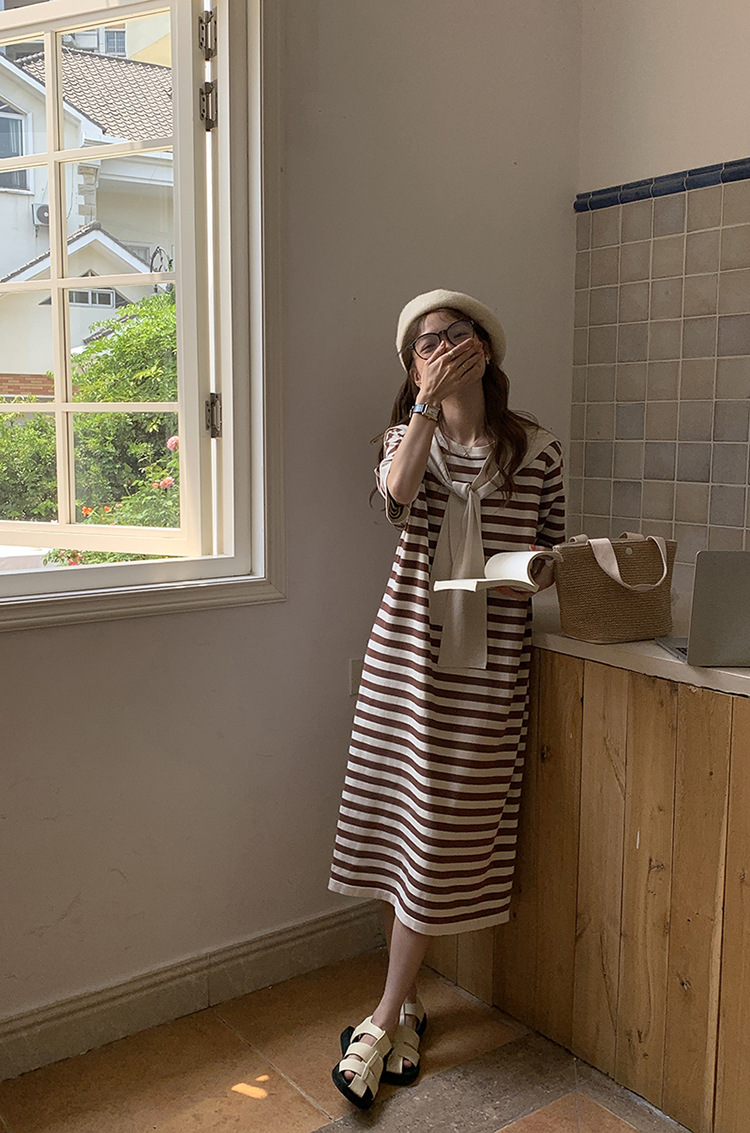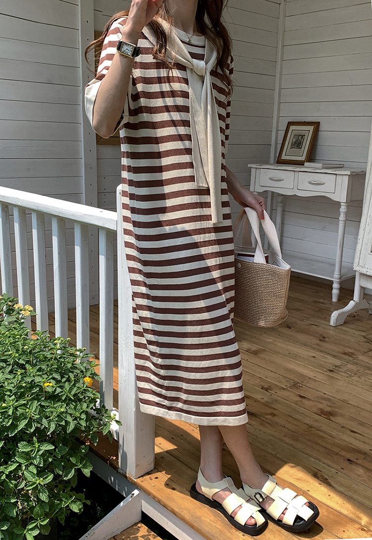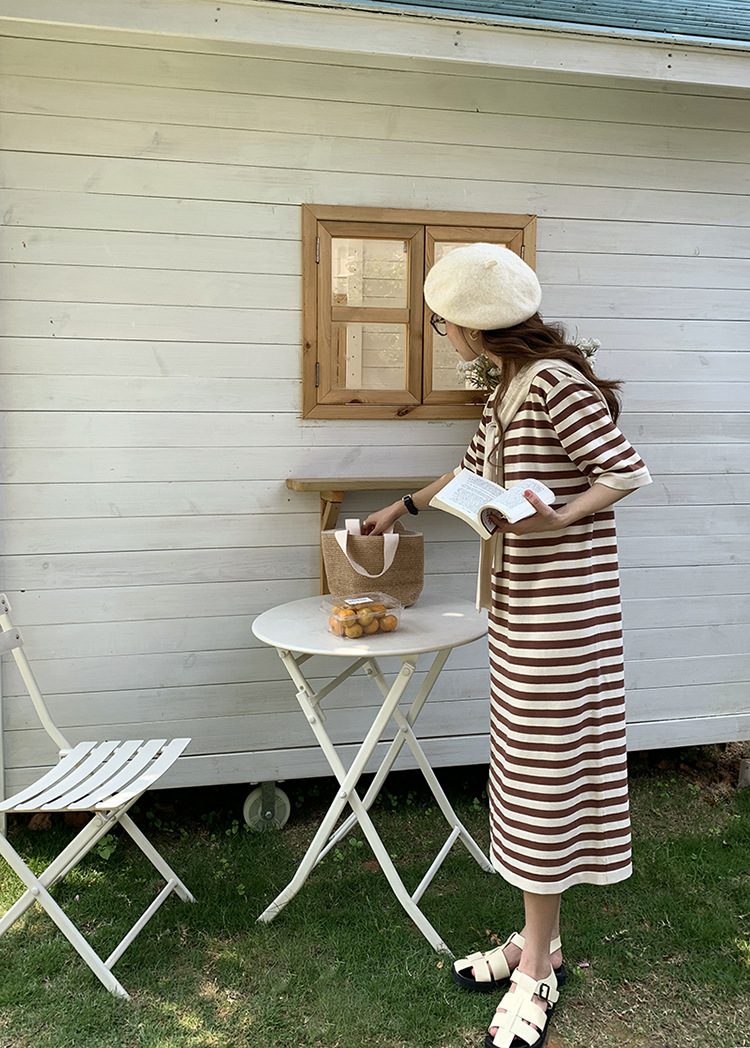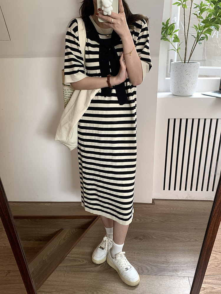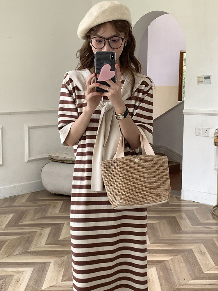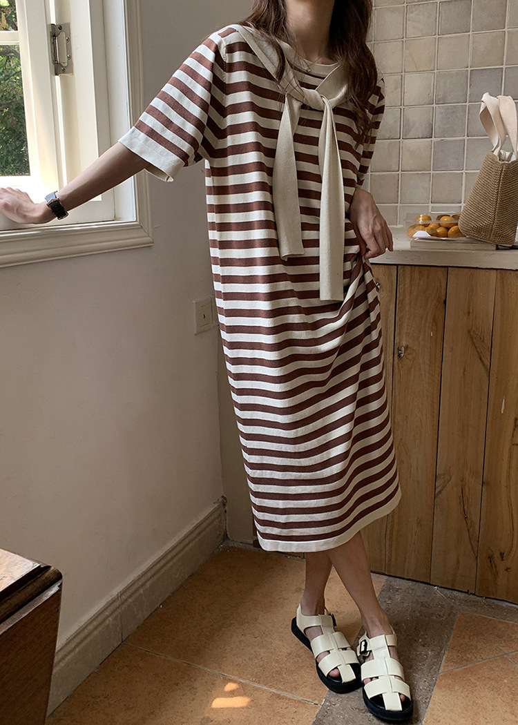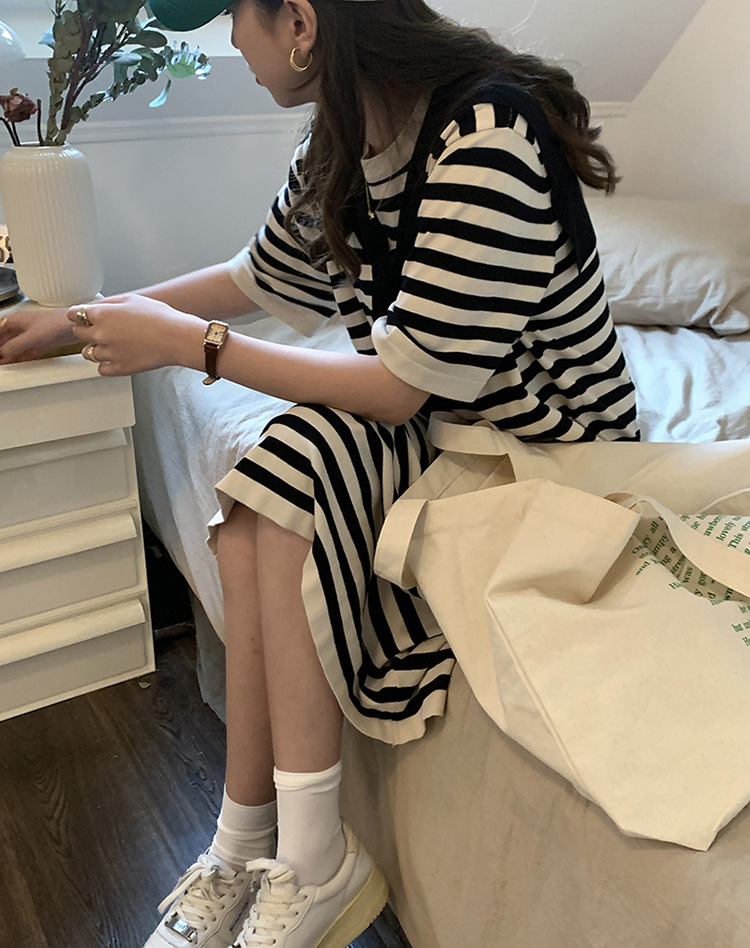 描述:面料名称:毛料冰爽丝,图案:条纹,工艺:高温整烫,产地:广州,款式:基本款,组合形式:假两件,裙长:中长裙,裙型:直筒型,领型:圆领,袖型:常规袖,袖长:短袖,腰型:宽松腰,流行元素:其他,上市年份/季节:2022年夏季,主面料成分:粘胶,主面料成分2:锦纶,货号:122MZ158,品牌:hooozen,颜色:咖杏,黑杏,尺码:均码,风格类型:日韩休闲,主面料成分含量:70%(不含)-80%(含),风格:韩系风,是否跨境货源:否,主面料成分2含量:30%及以下,