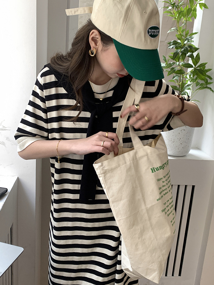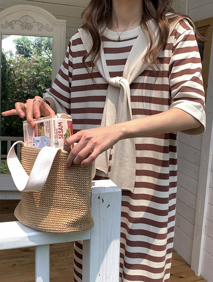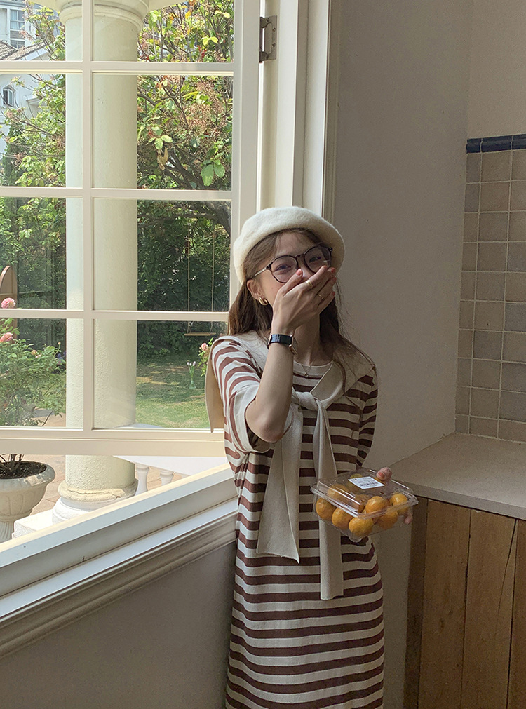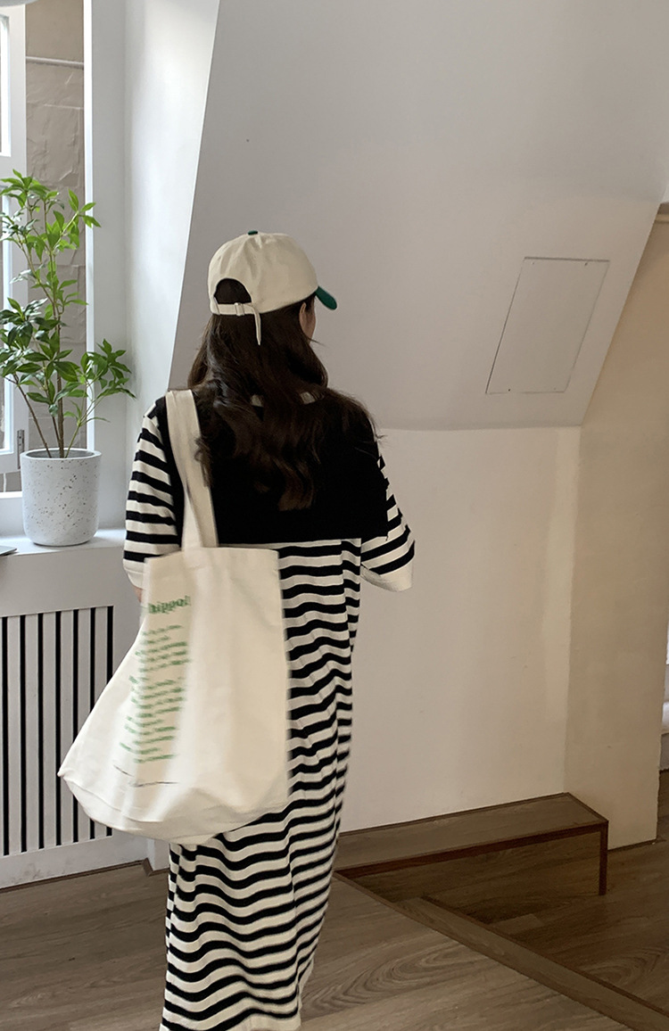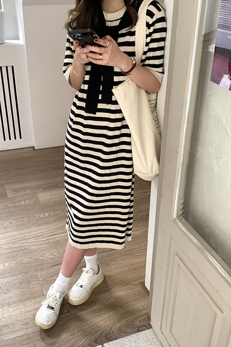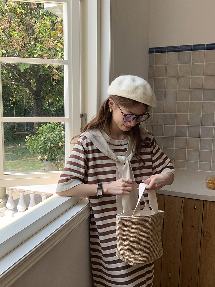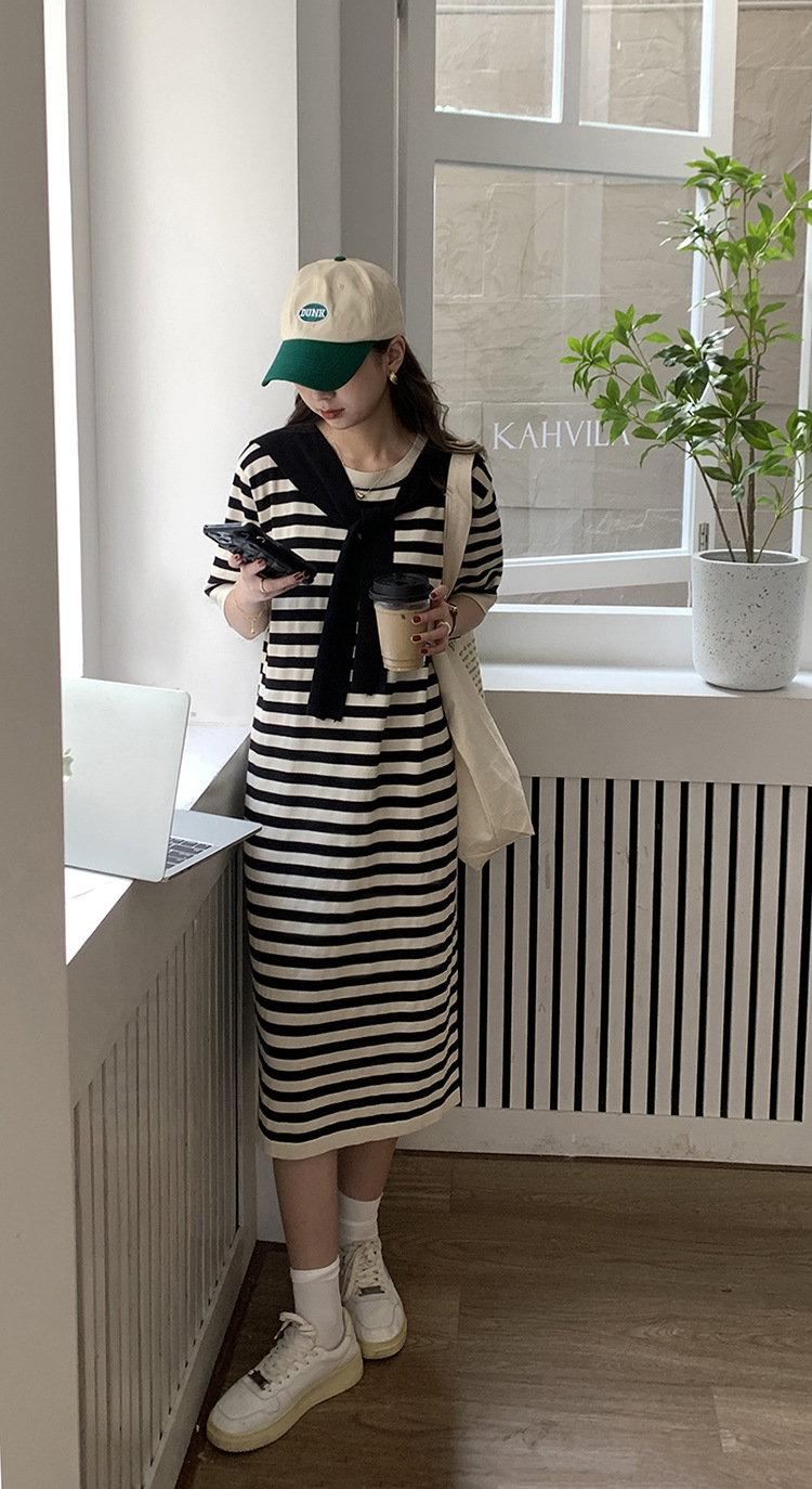 描述:面料名称:毛料冰爽丝,图案:条纹,工艺:高温整烫,产地:广州,款式:基本款,组合形式:假两件,裙长:中长裙,裙型:直筒型,领型:圆领,袖型:常规袖,袖长:短袖,腰型:宽松腰,流行元素:其他,上市年份/季节:2022年夏季,主面料成分:粘胶,主面料成分2:锦纶,货号:122MZ158,品牌:hooozen,颜色:咖杏,黑杏,尺码:均码,风格类型:日韩休闲,主面料成分含量:70%(不含)-80%(含),风格:韩系风,是否跨境货源:否,主面料成分2含量:30%及以下,