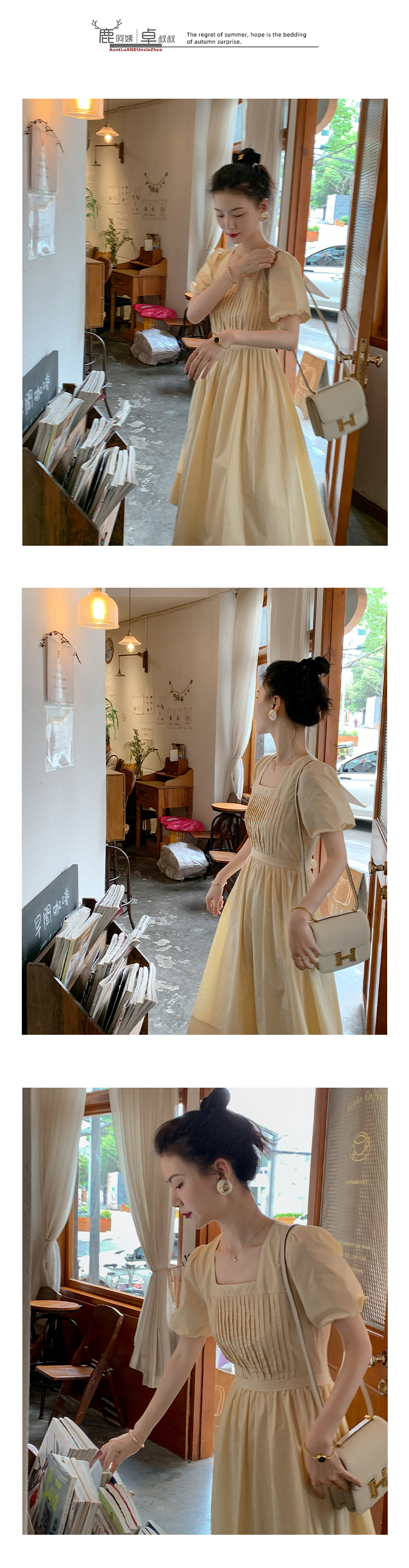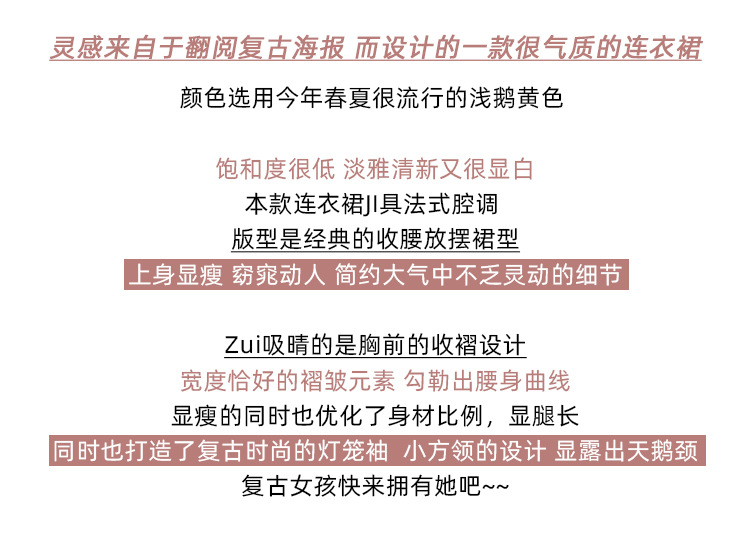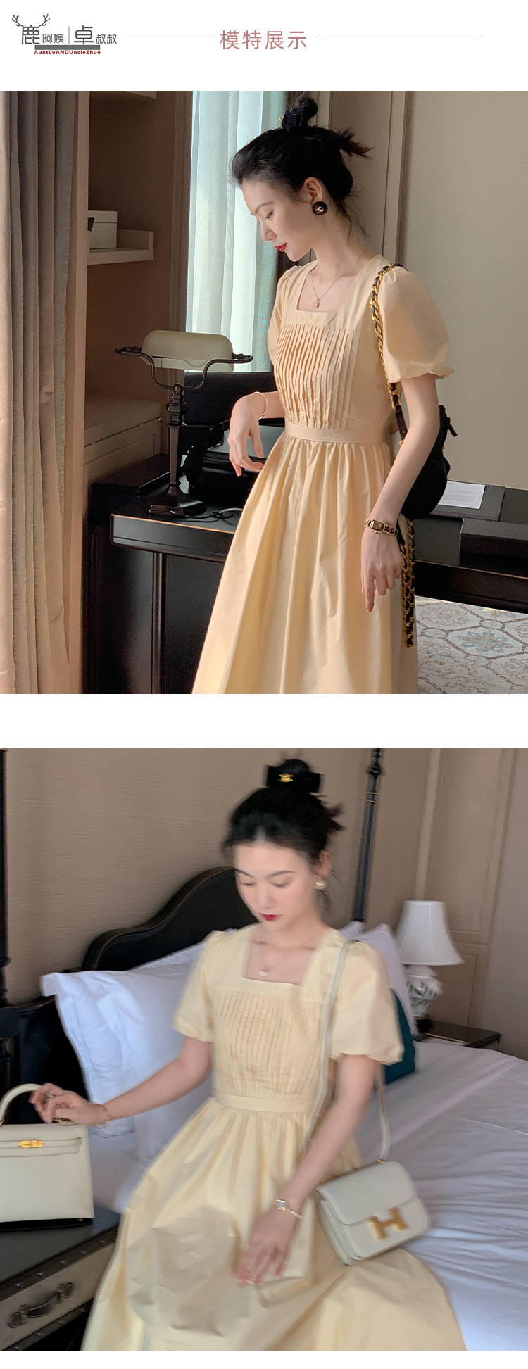 标题:鹿阿姨卓叔叔法式复古鹅黄方领茶歇泡泡袖连衣裙女收腰2021新款