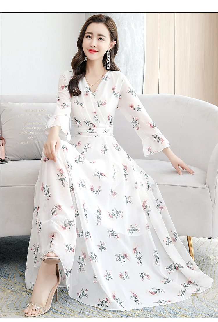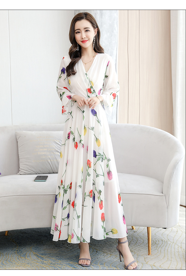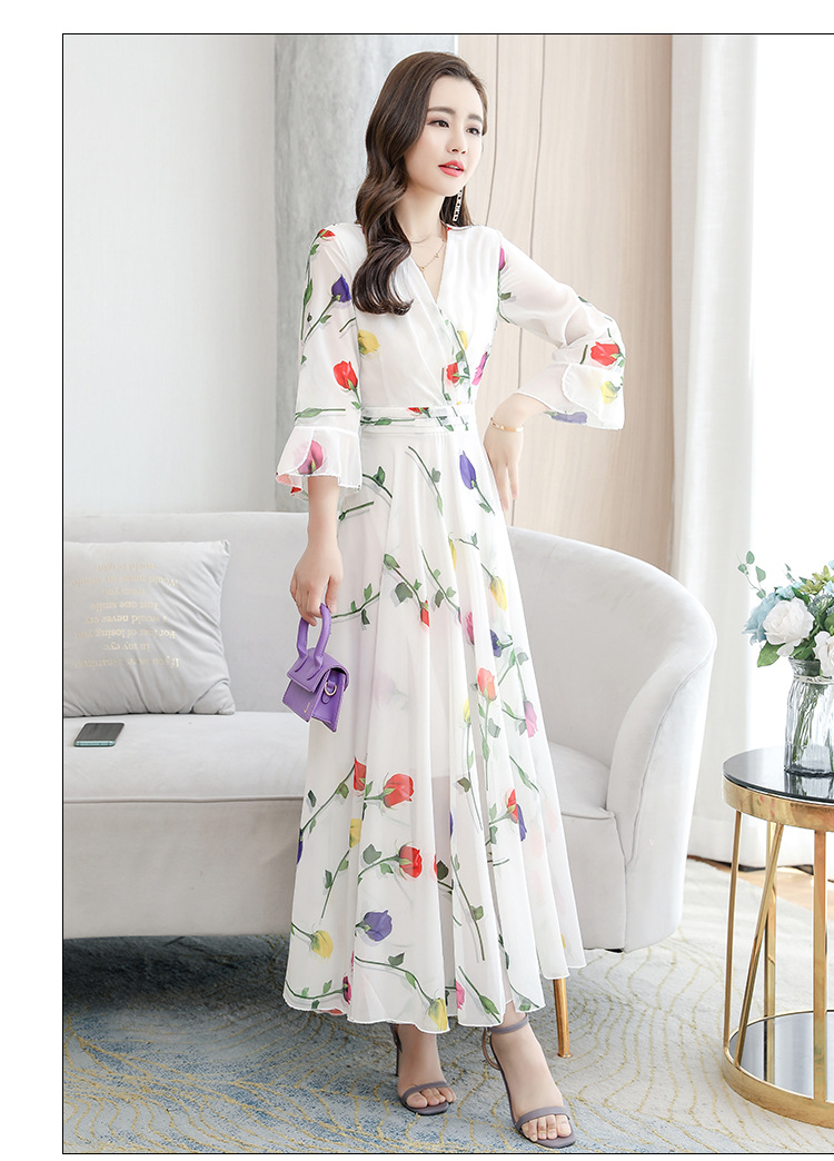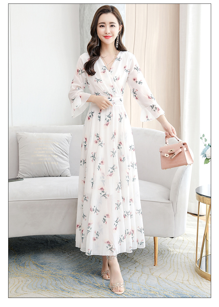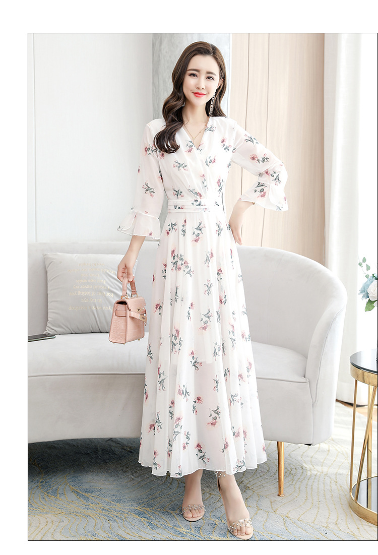 描述:生地名称:シフォン、図案:色柄、工芸:プリント/捺染、産地:広州、デザイン:基本モデル、組み合わせ形式:単品、スカート長:ロングスカート、スカート型:大振り子型、襟型:Vネック、袖型:ラッパ袖、袖丈:五分袖、腰型:中腰、流行元素:その他、発売年/季節:2022年夏、主生地成分:ポリエステル繊維(ポリエステル)、主生地成分2:ポリエステル繊維(ポリエステル)、商品番号:689050、ブランド:その他