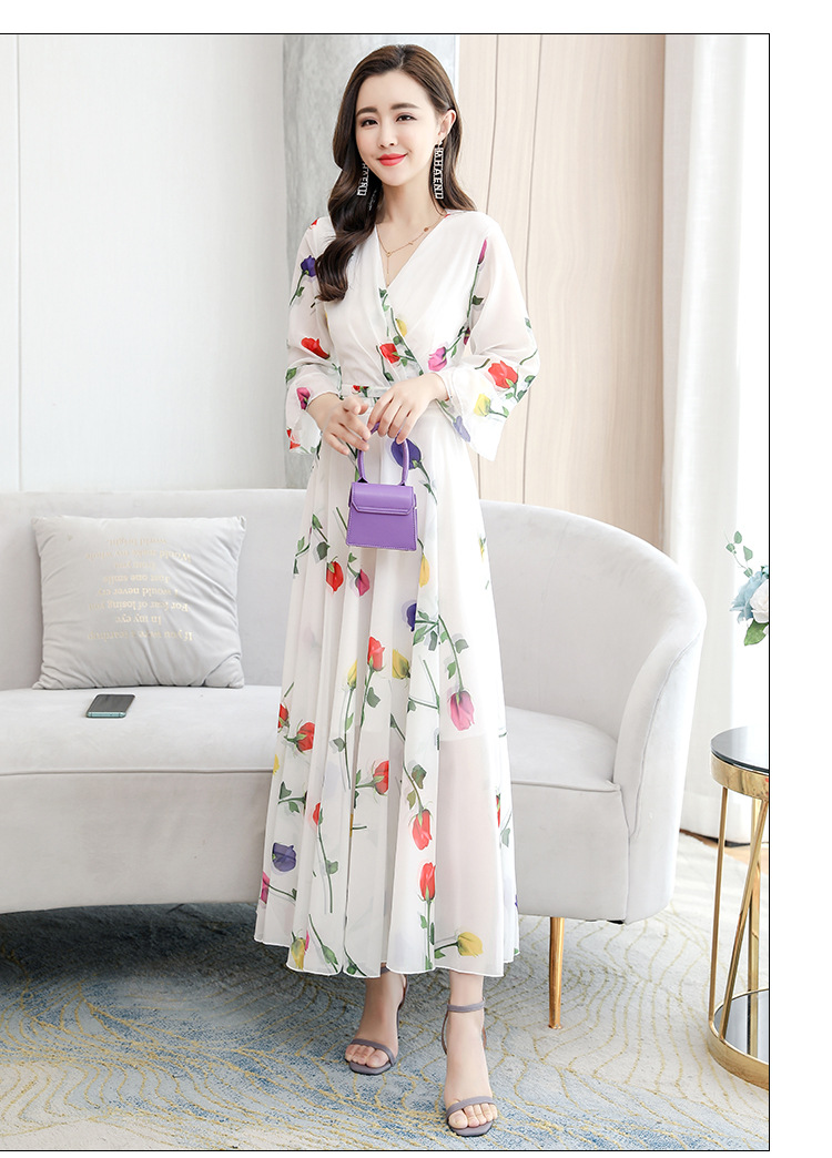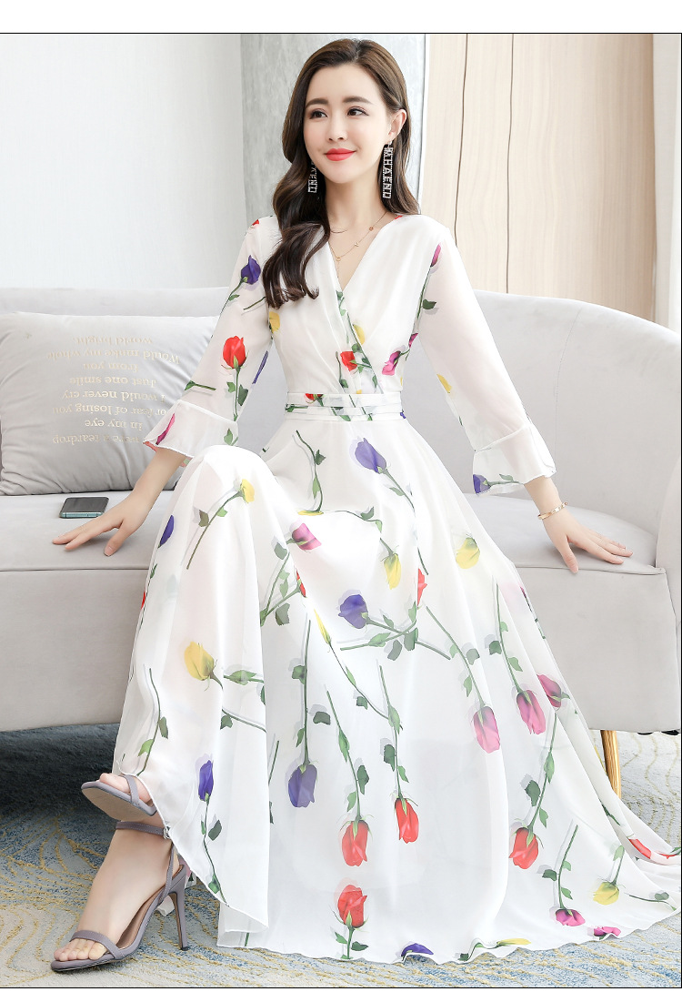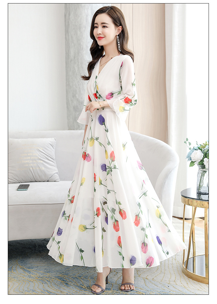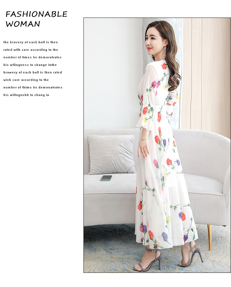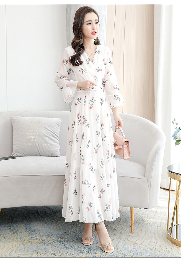 描述:生地名称:シフォン、図案:色柄、工芸:プリント/捺染、産地:広州、デザイン:基本モデル、組み合わせ形式:単品、スカート長:ロングスカート、スカート型:大振り子型、襟型:Vネック、袖型:ラッパ袖、袖丈:五分袖、腰型:中腰、流行元素:その他、発売年/季節:2022年夏、主生地成分:ポリエステル繊維(ポリエステル)、主生地成分2:ポリエステル繊維(ポリエステル)、商品番号:689050、ブランド:その他