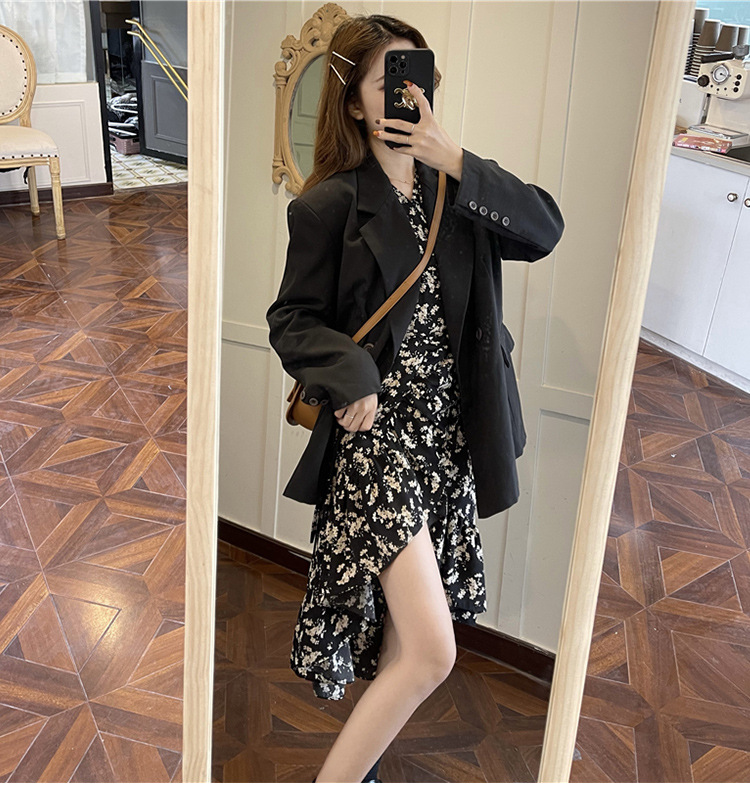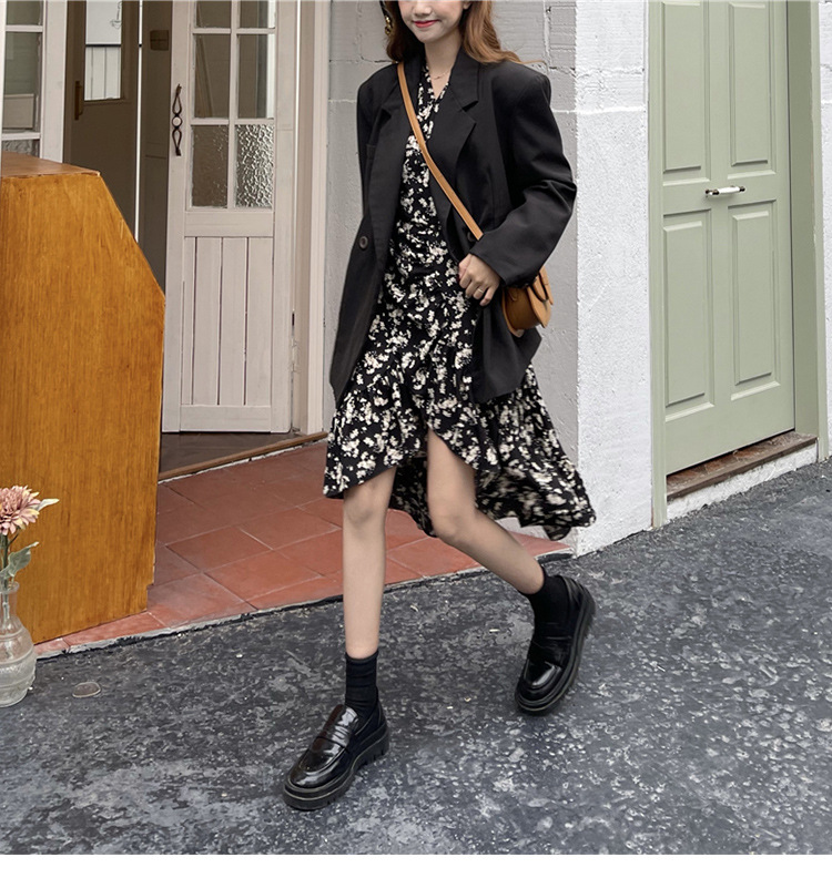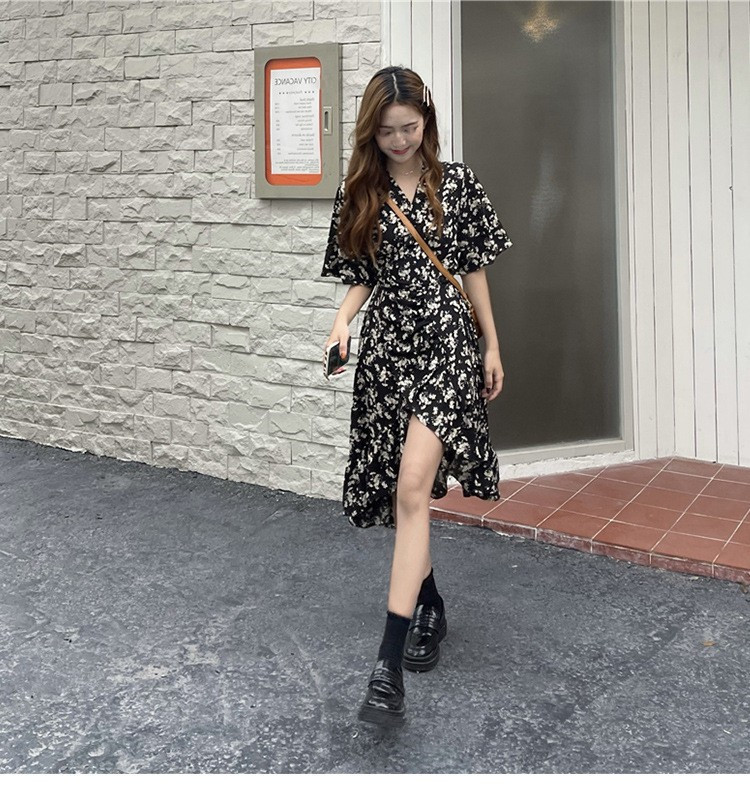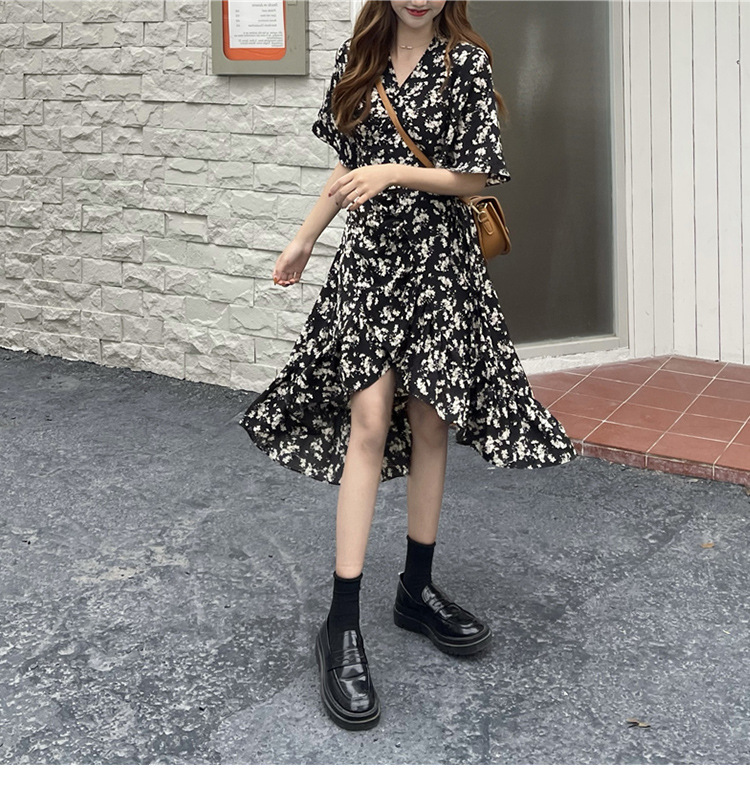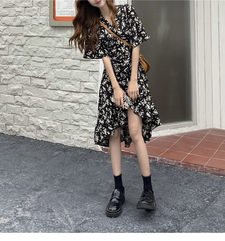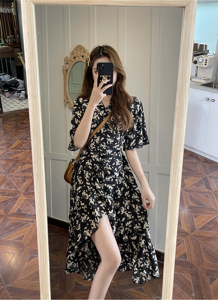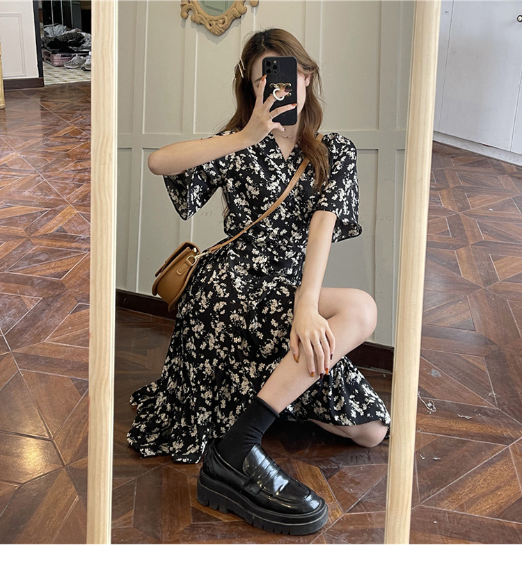 标题:2022夏新型フレンチシフォン花柄ワンピース女レトロデザイン感気質Vネックスカート初恋スカート