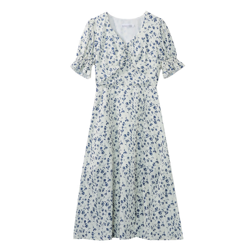 标题:フレンチレトロシフォン花柄ワンピース女性夏2022新型泡袖方襟修身気質ロングスカート