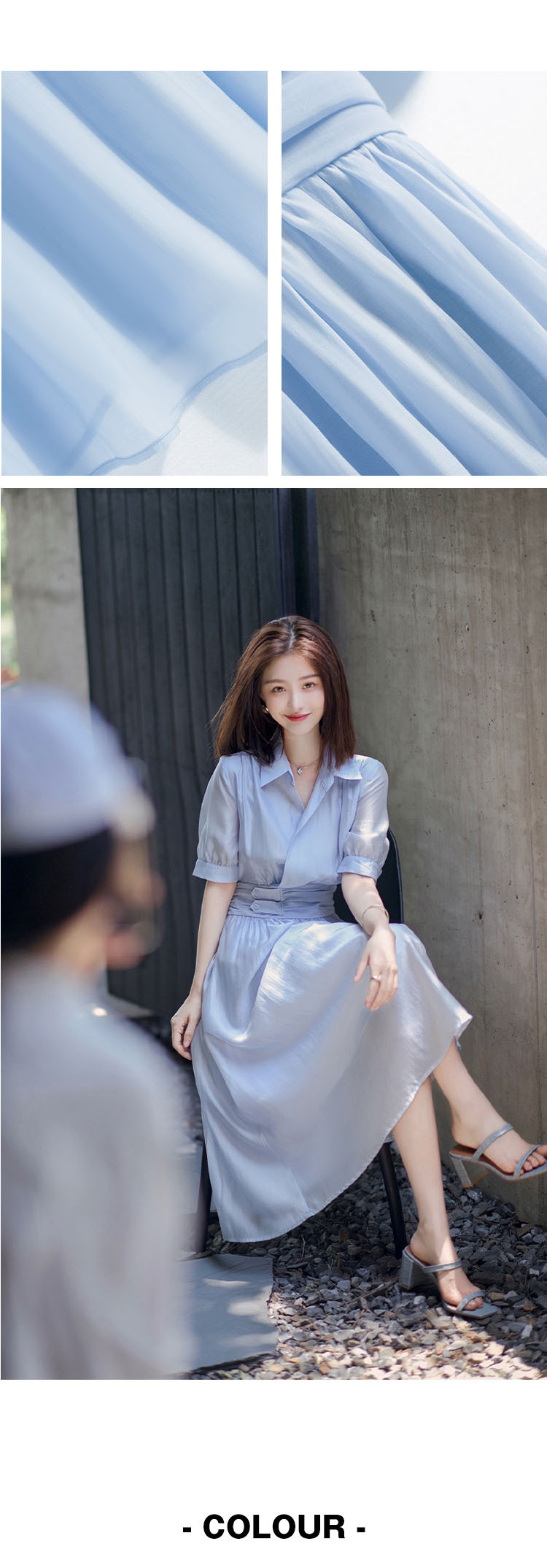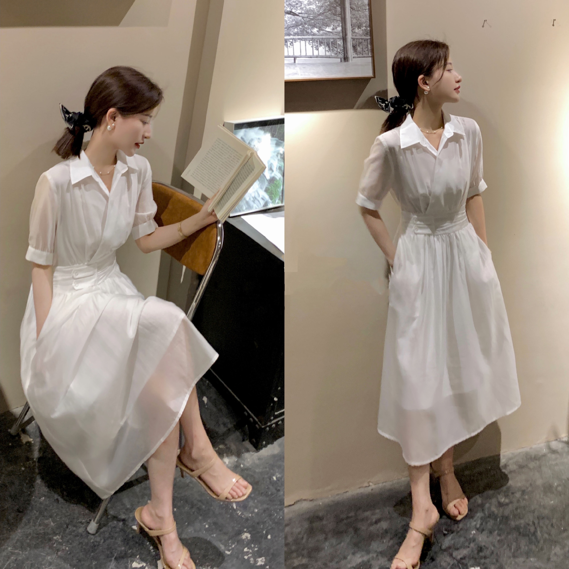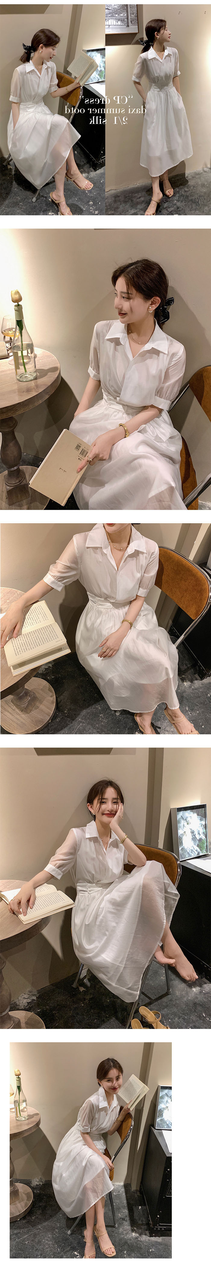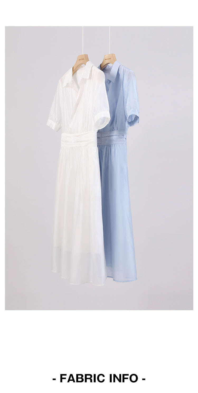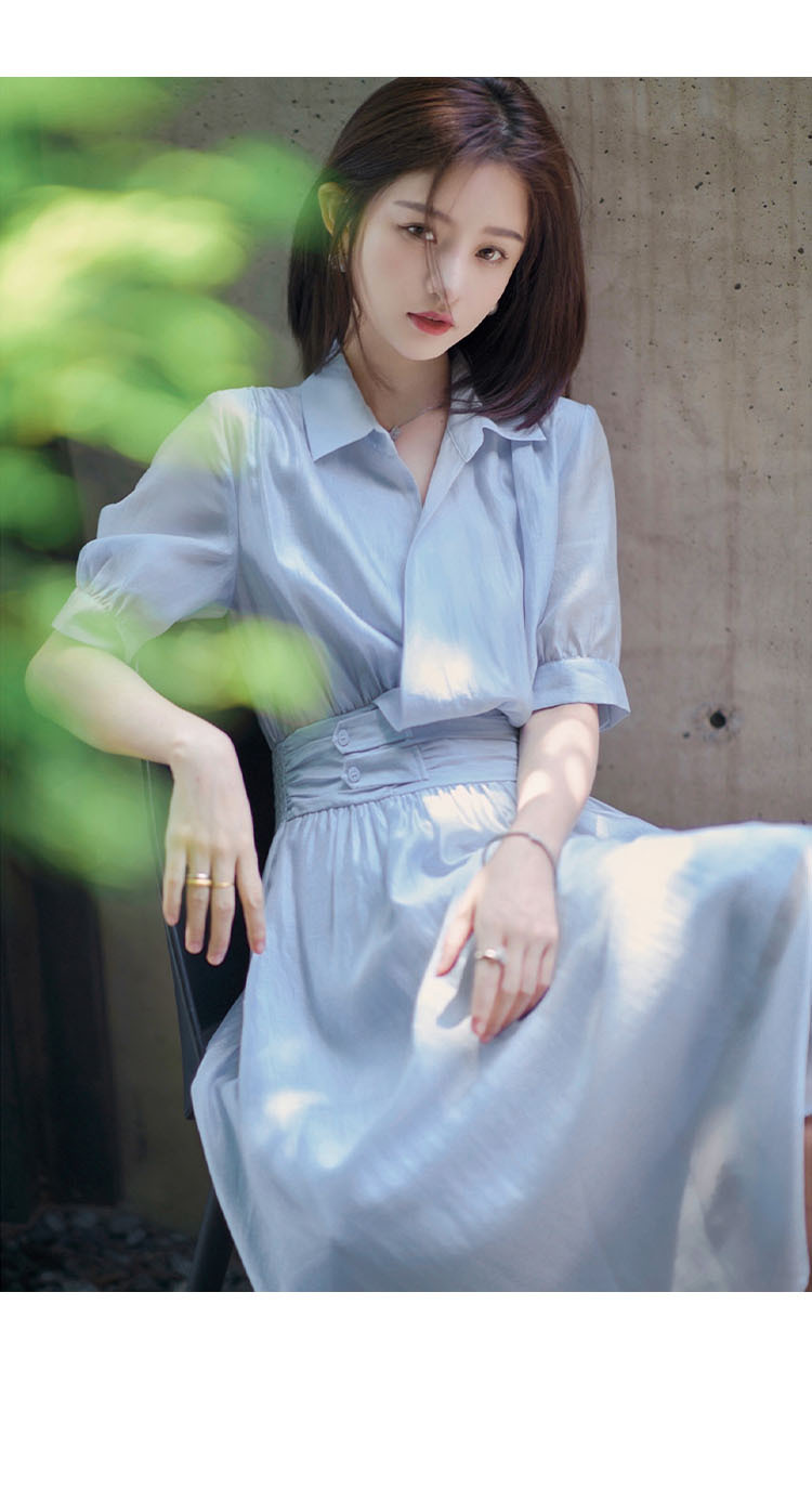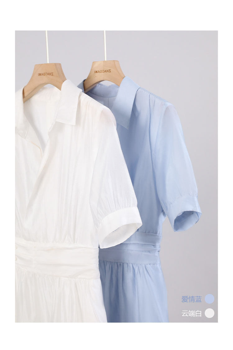 标题:2022夏新作ワンピース女性フレンチシンプルピュアカラーウエスト丸襟半袖ロングスカート