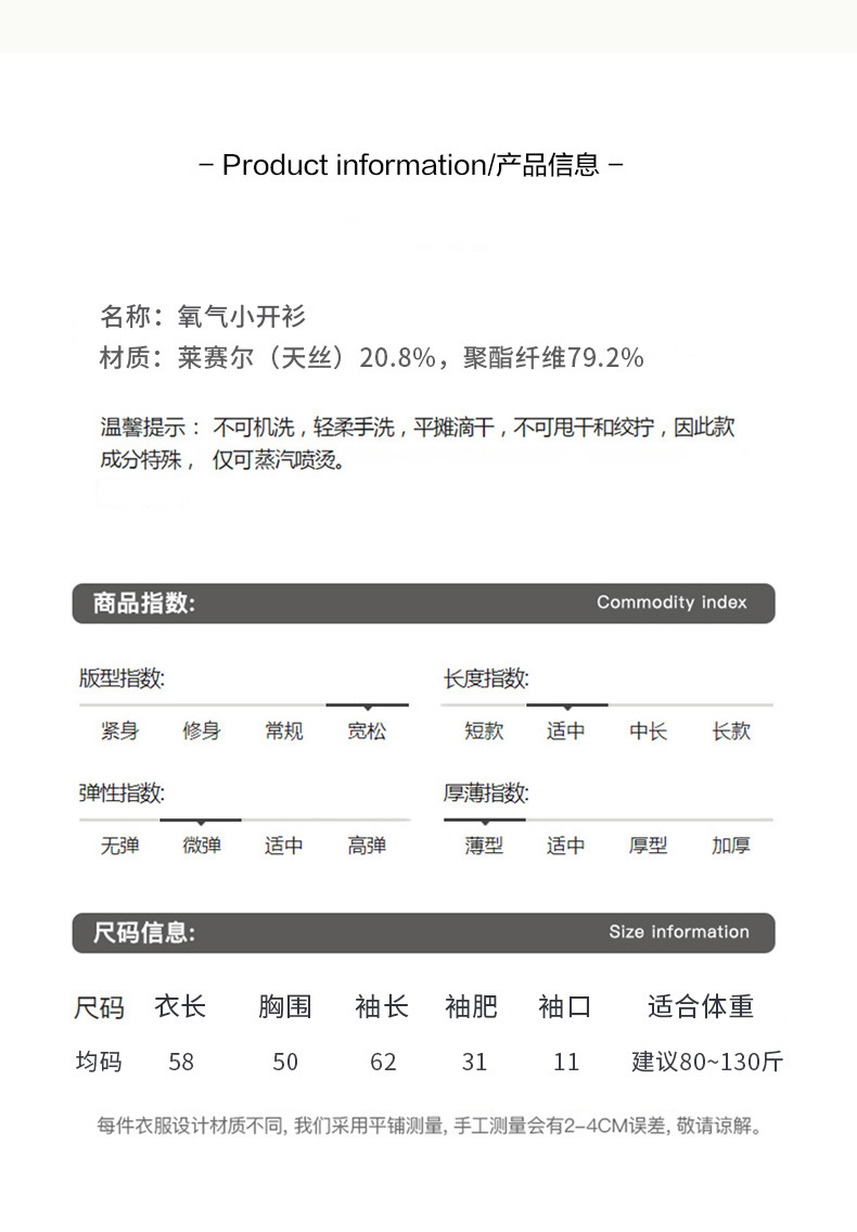描述:货号:9627,品牌:KPUWARM,面料名称:聚酯纤维,主面料成分2:莱赛尔,主面料成分:聚酯纤维(涤纶),图案:纯色,厚薄:薄,款式:开衫,版型:宽松型,袖型:常规,上市年份/季节:2022年夏季,领型:V字领,袖长:长袖,工艺:拼贴/拼接,颜色:果冻绿,松石绿,淡雅白,碳素灰,轻柔米,尺码:均码,风格类型:气质通勤,主面料成分含量:70%(不含)-80%(含),风格:优雅风,知性风,服装风格:韩版,是否跨境货源:否,主面料成分2含量:30%及以下,适用年龄段:成人,适用性别:女,
