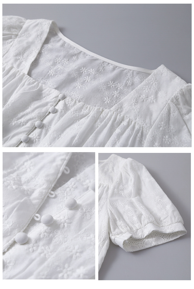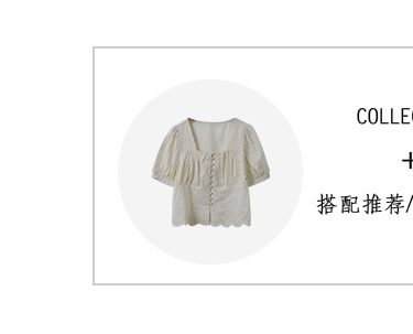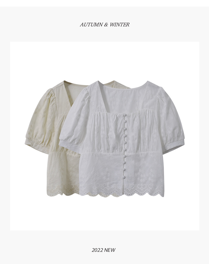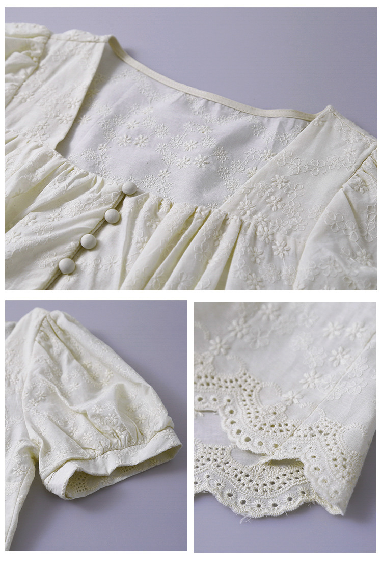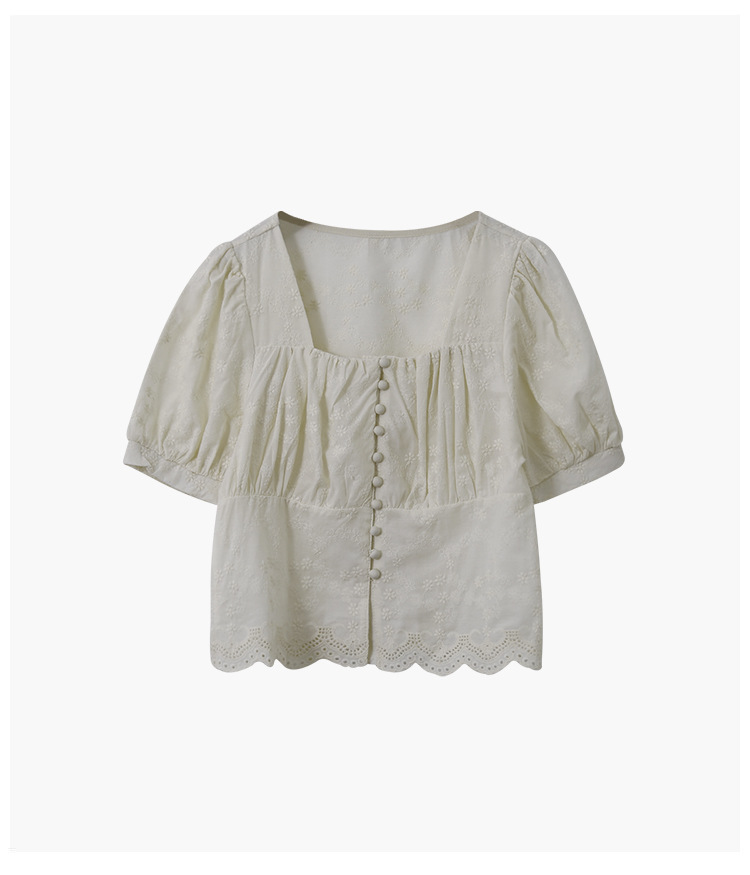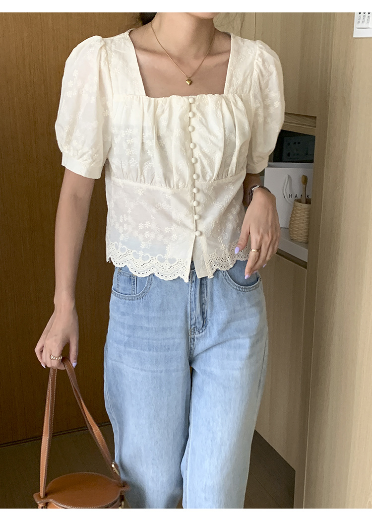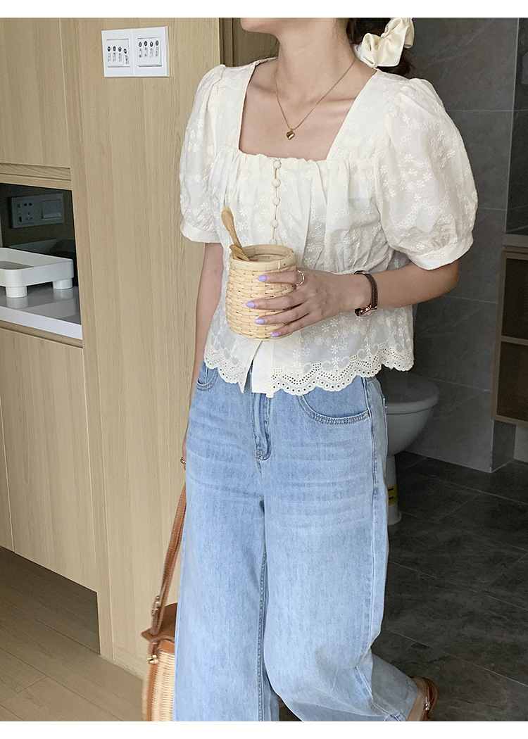 标题:【欧凡】8688提花蕾丝方领泡泡袖单排扣开衫女2022夏季别致小衫