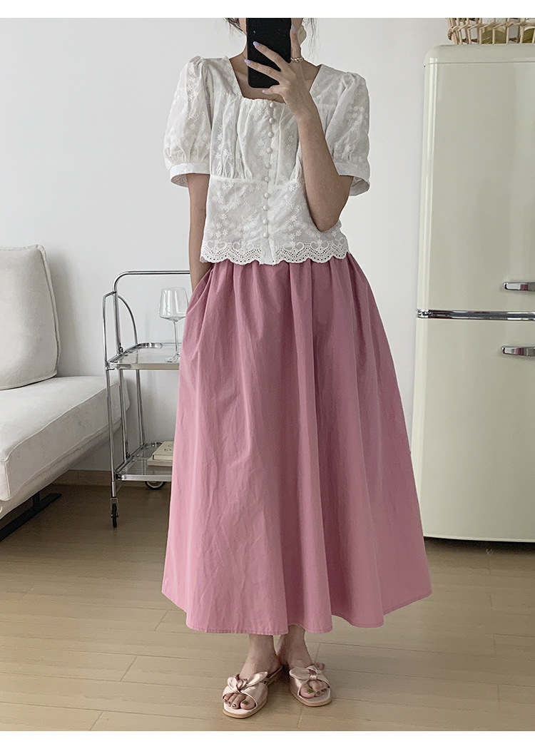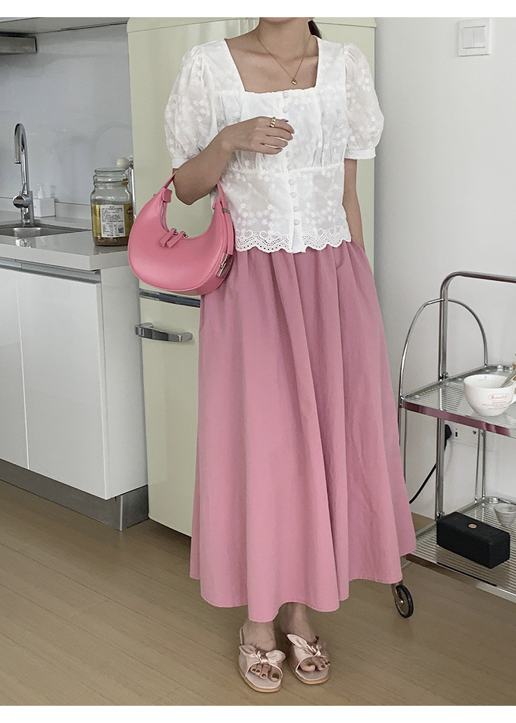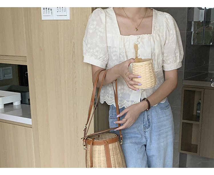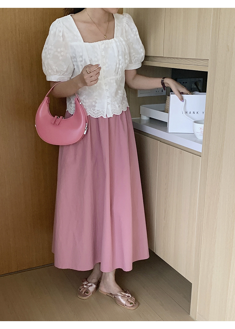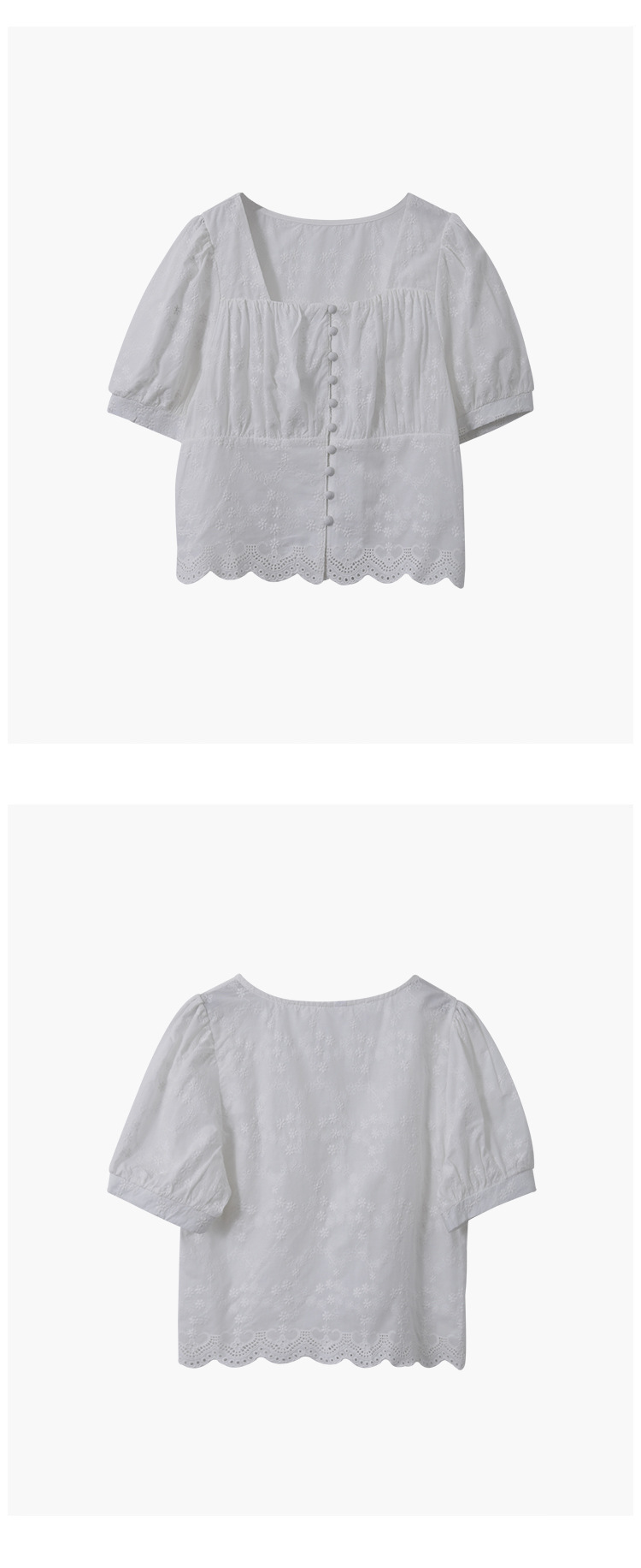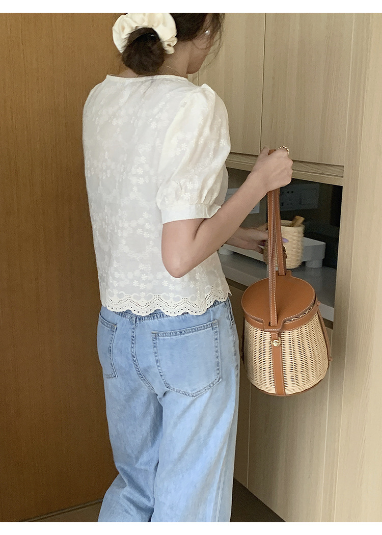 标题:【欧凡】8688提花蕾丝方领泡泡袖单排扣开衫女2022夏季别致小衫