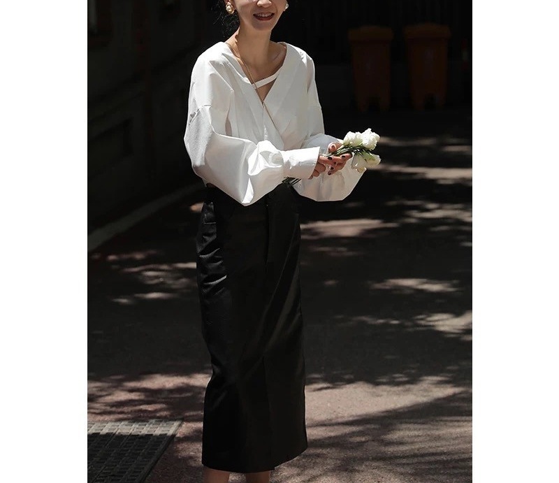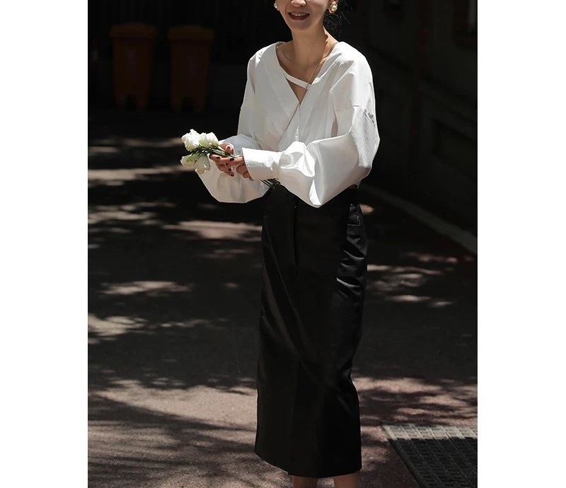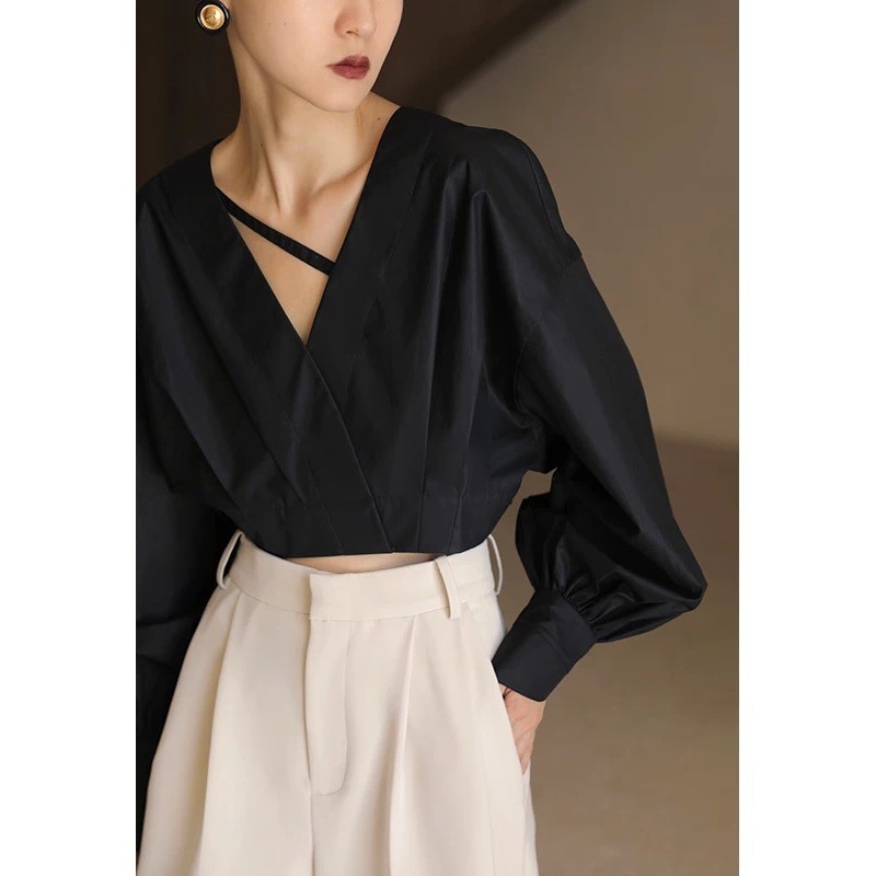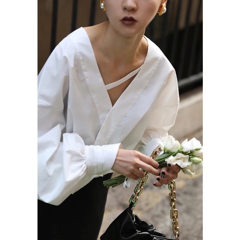 标题:2022春秋新款设计感宽松廓型V领衬衣泡泡袖女士短款长袖白色衬衫