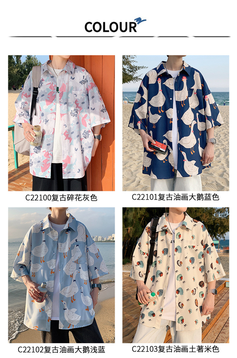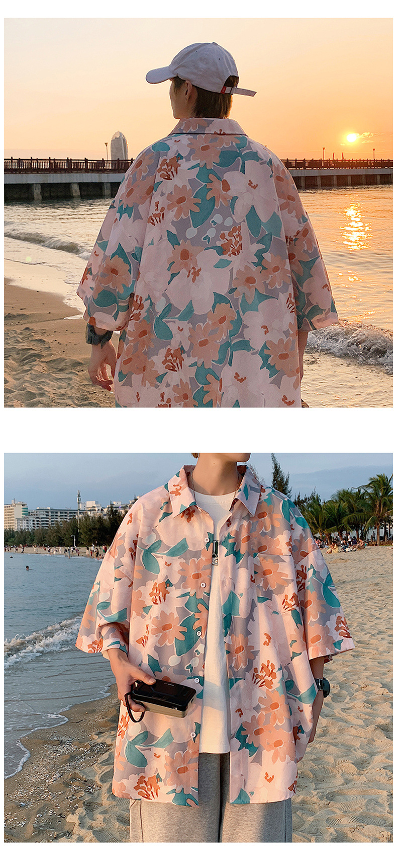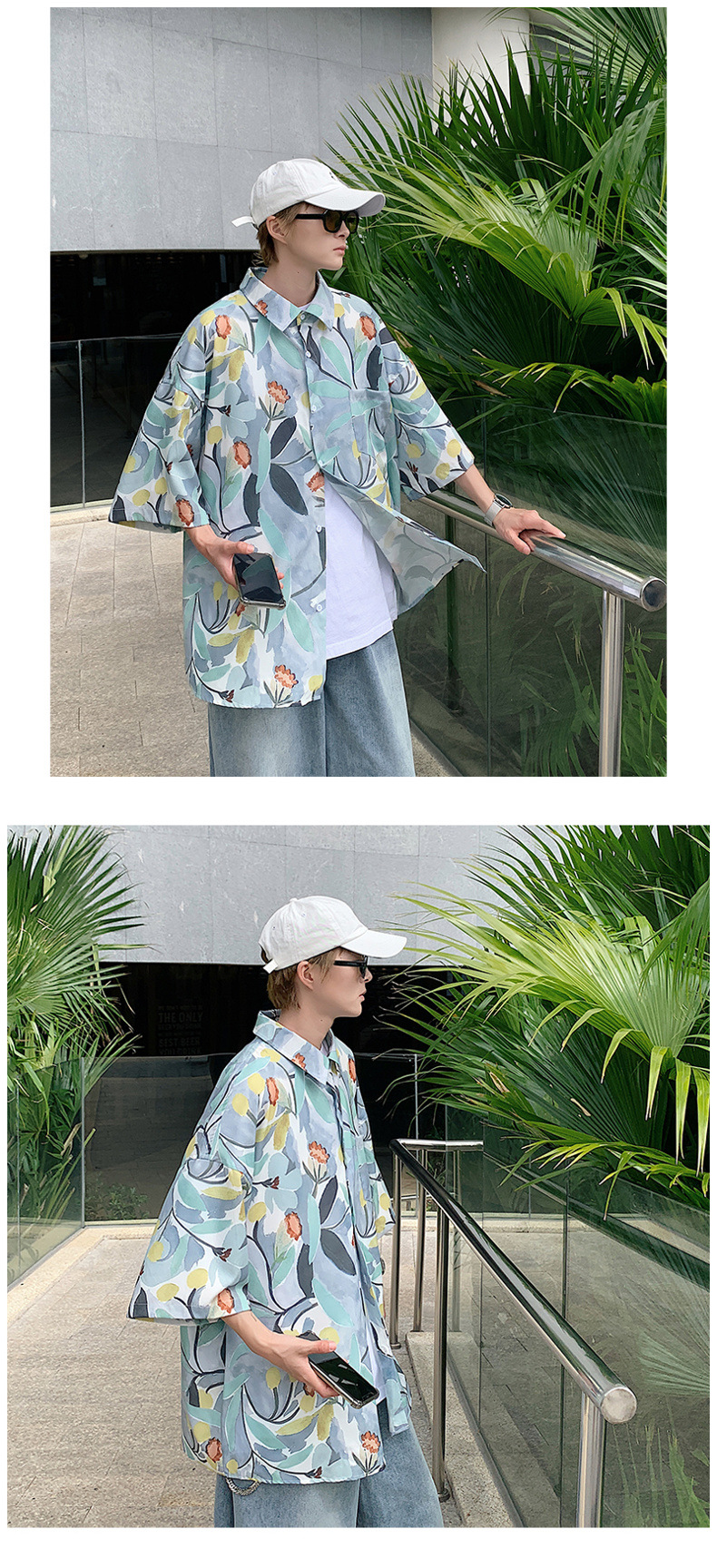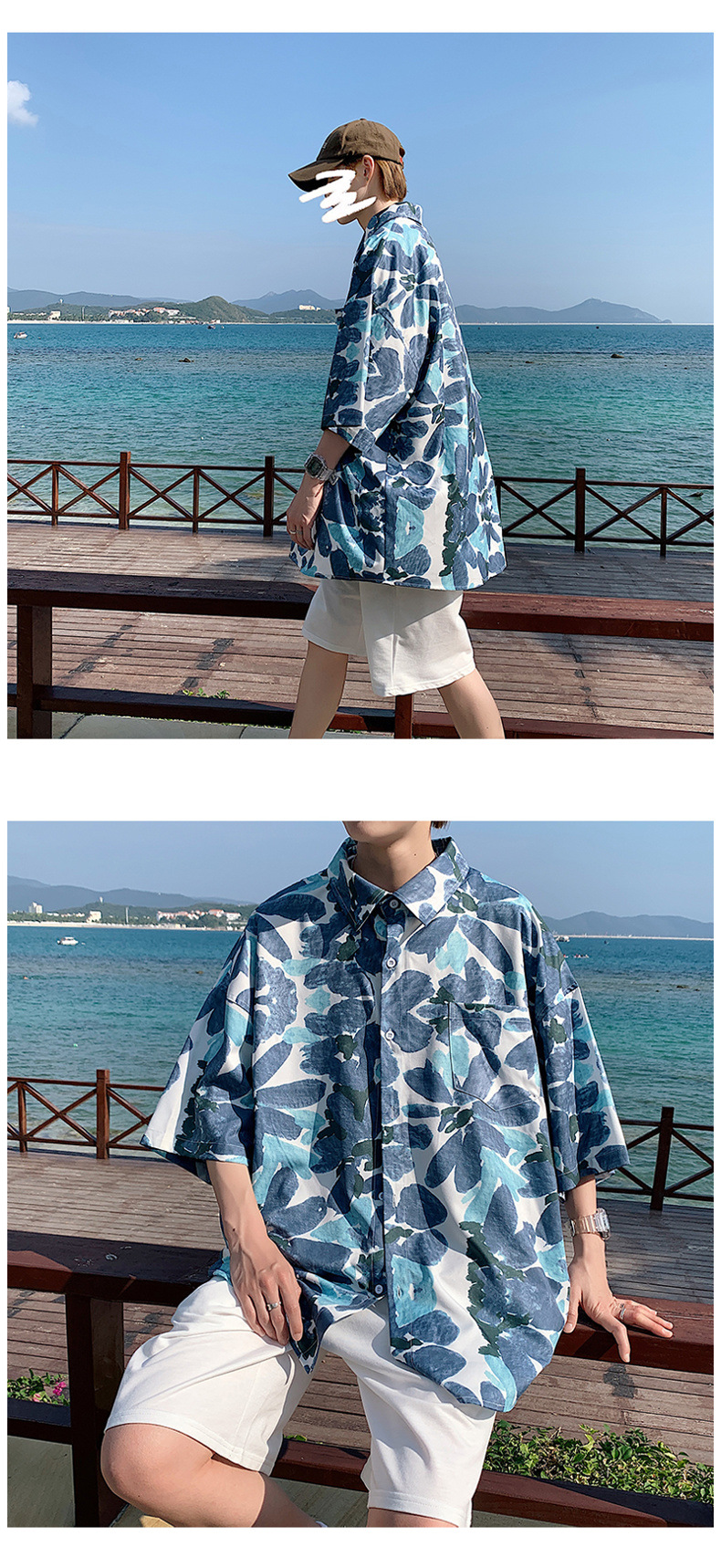 标题:2022夏季新款冰丝花衬衫男五分短袖情侣沙滩宽松休闲ins潮流衬衣