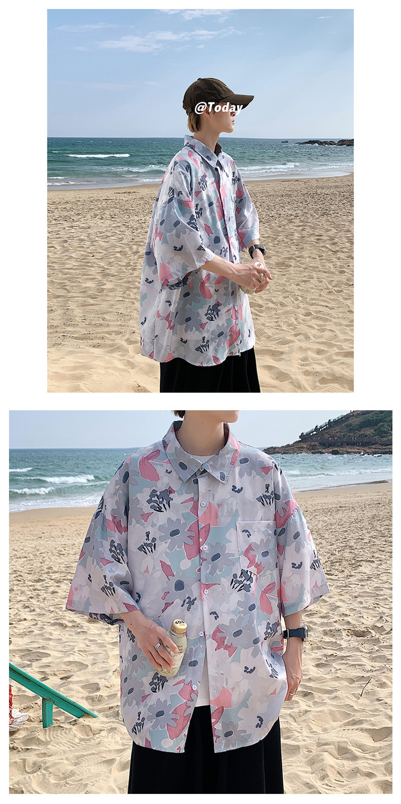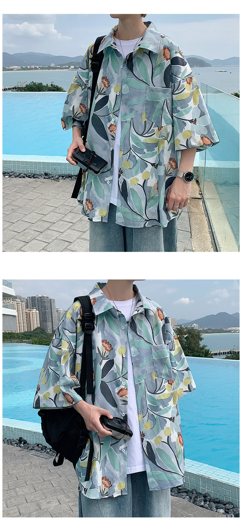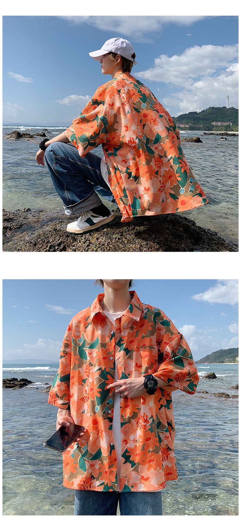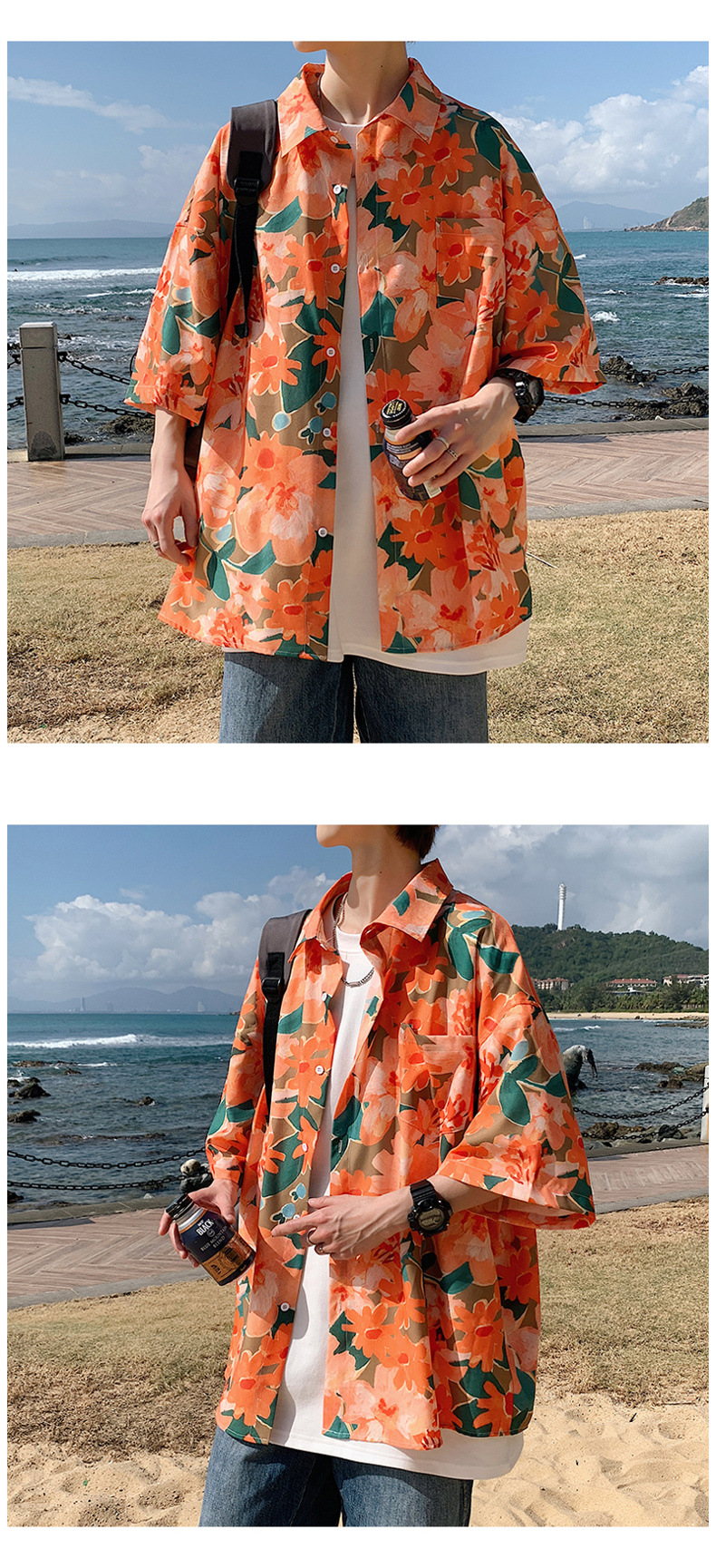 标题:2022夏季新款冰丝花衬衫男五分短袖情侣沙滩宽松休闲ins潮流衬衣