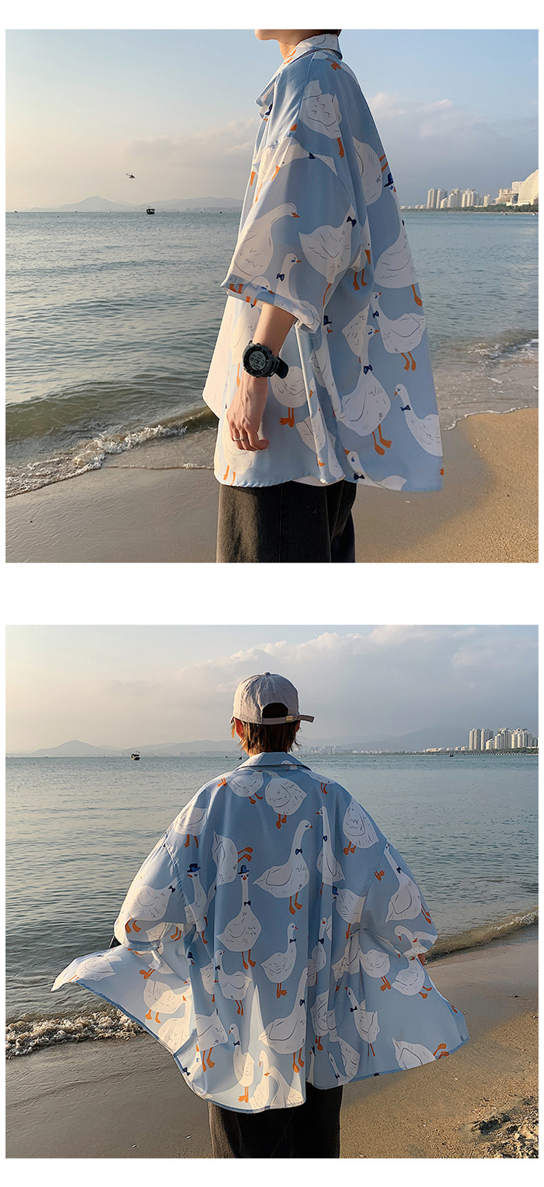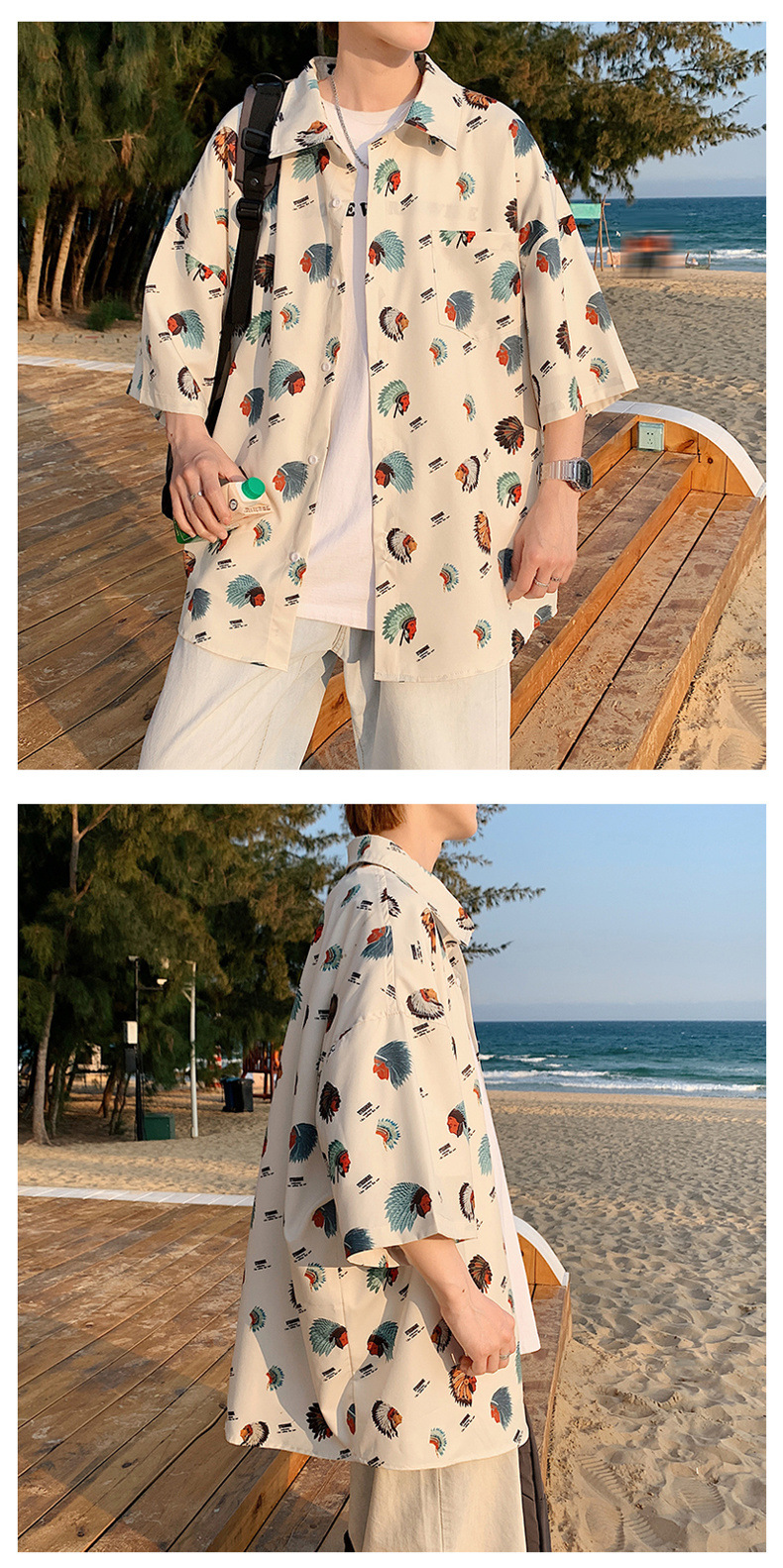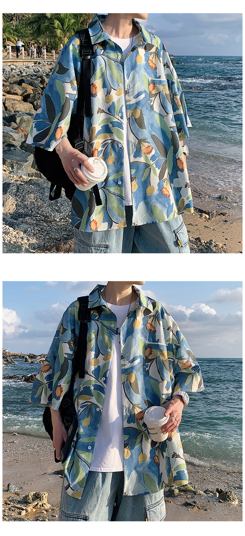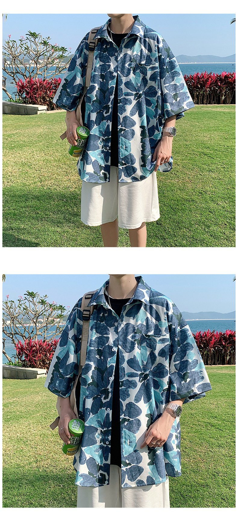标题:2022夏季新款冰丝花衬衫男五分短袖情侣沙滩宽松休闲ins潮流衬衣