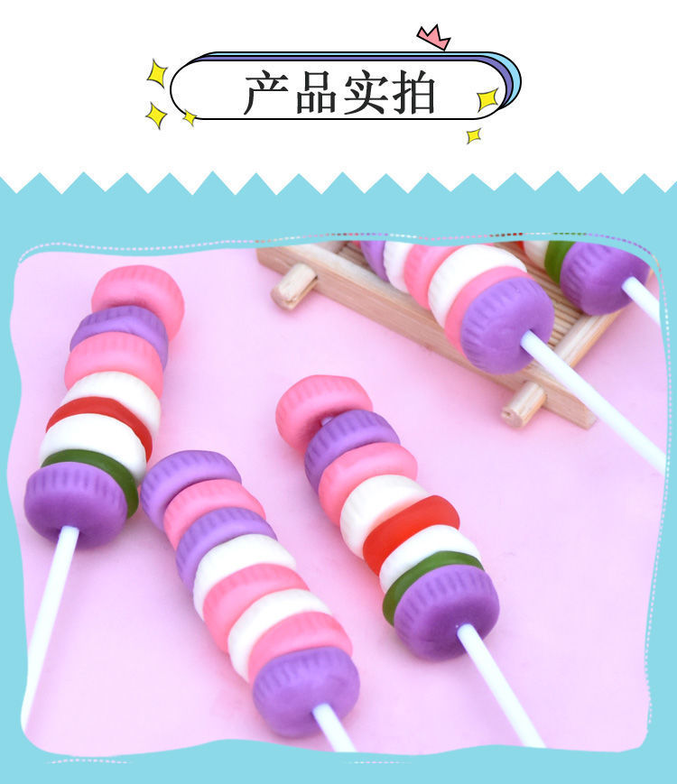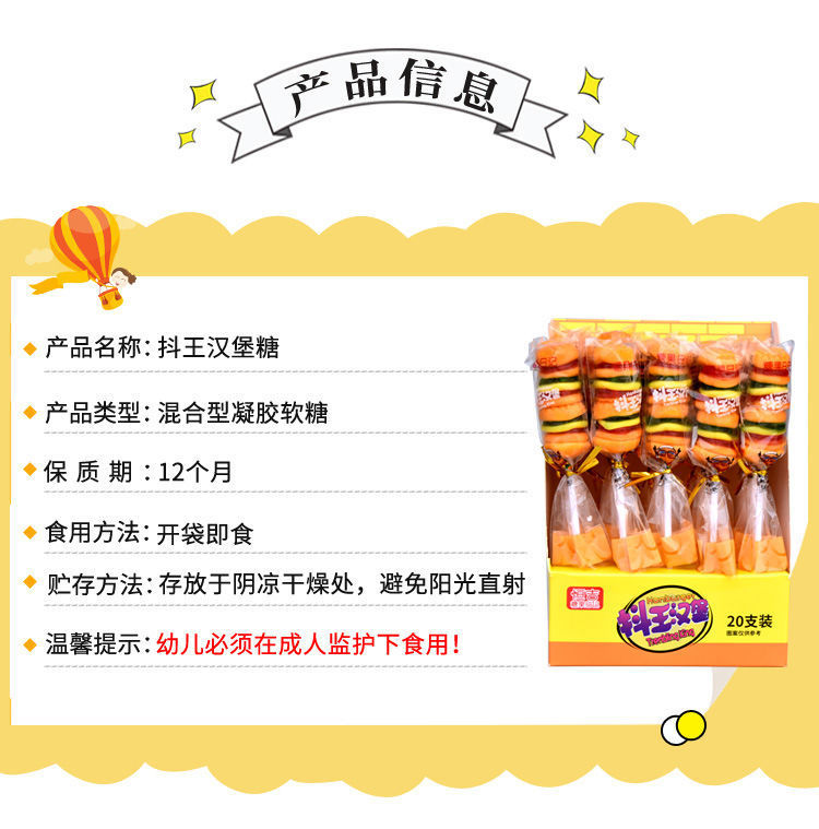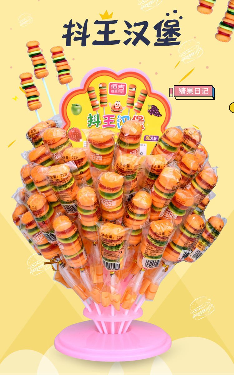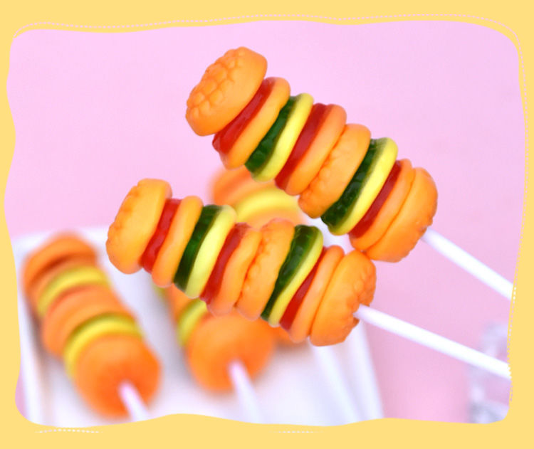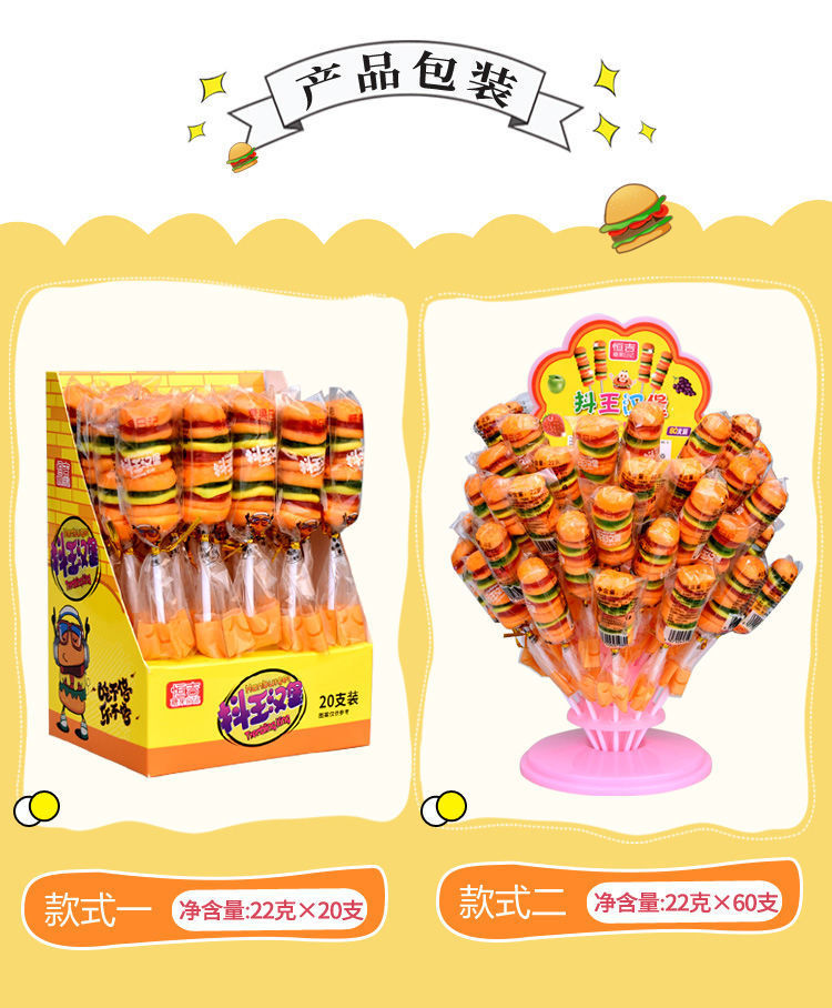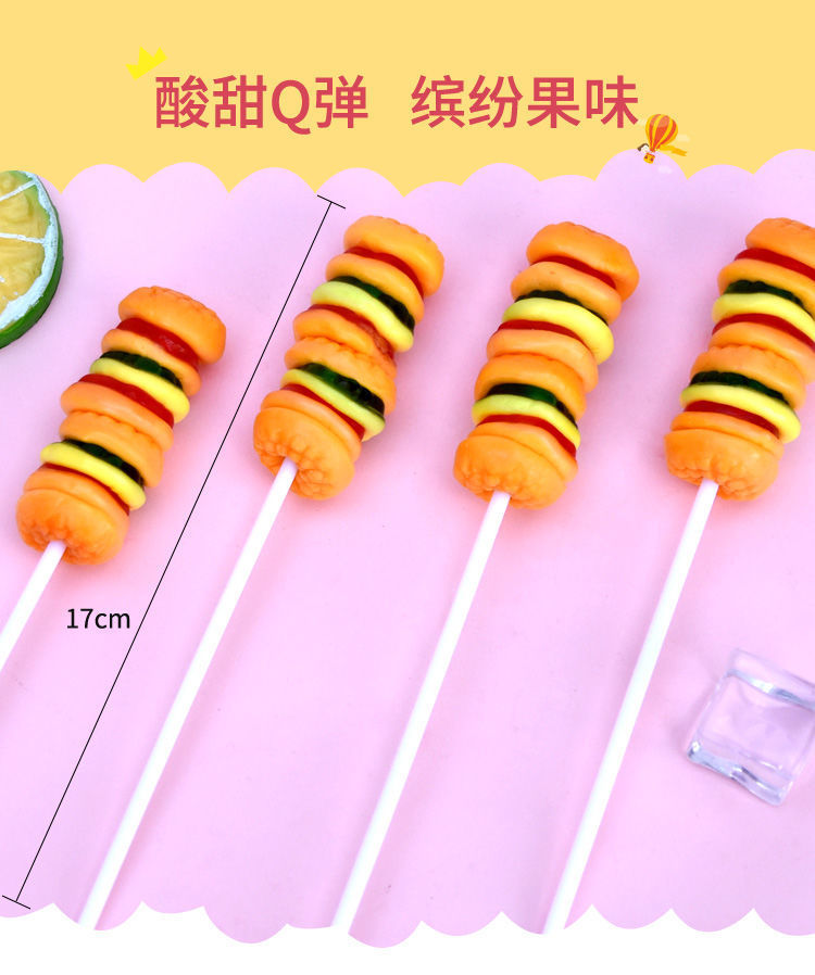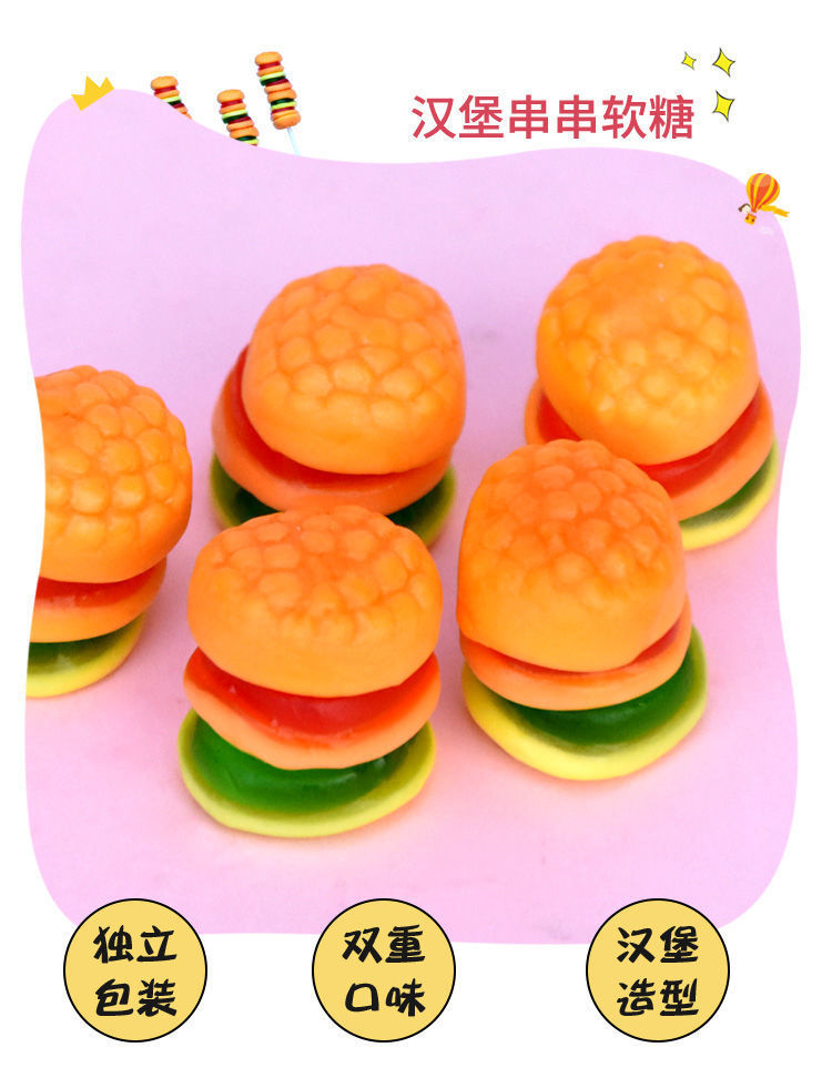 标题:网红汉堡糖果汁软糖橡皮糖大量批发儿童小零食摆地摊高颜值棒棒糖