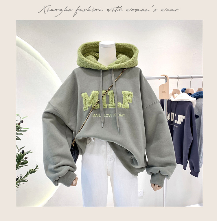 标题:拼接仿羊羔绒连帽卫衣女宽松秋冬季加绒加厚跨境女装一件代发批发