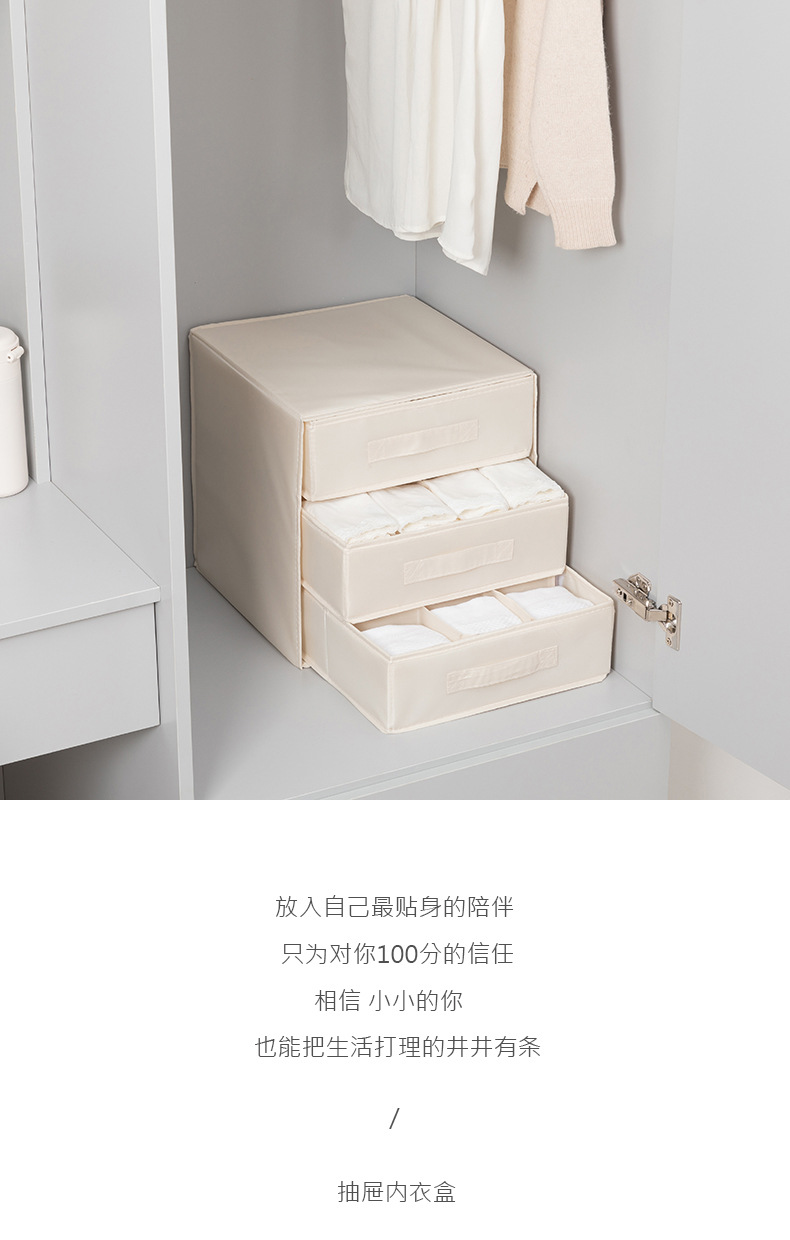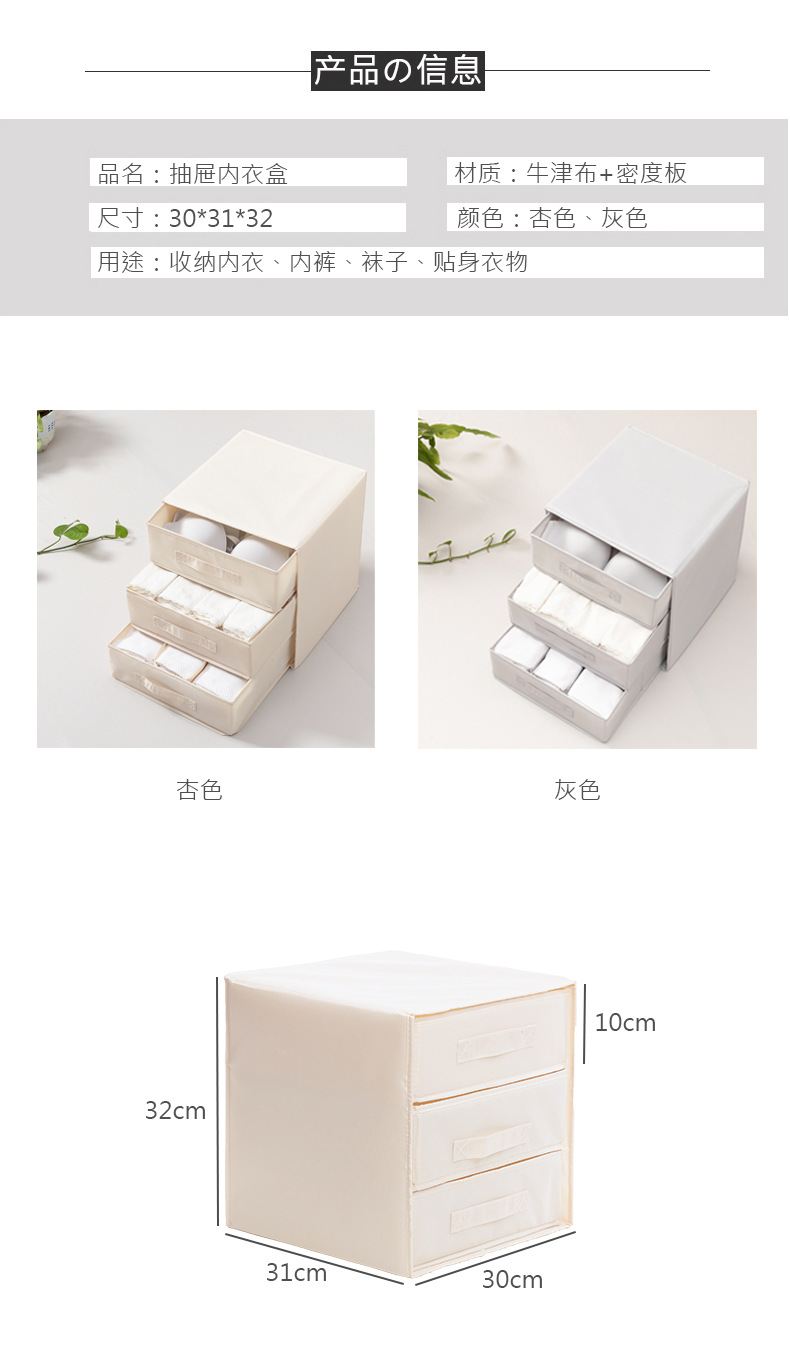 描述:产品类别:内衣收纳盒,品牌:那生活,是否进口:否,型号:三层三抽,材质:牛津布,具体材质:牛津布,商品特性:可折叠,功能:整理,收纳场景:卧室,衣柜内,适用范围:内衣,风格:现代简约,图案:纯色,容量:1L,规格:31*31*31cm,产地:浙江,货号:A6-135纯色牛津布三层三抽,加工定制:是,加印LOGO:可以,贸易属性:内贸+外贸,箱装数量:50,价格段:30-40元,专利:否,颜色:杏色,灰色,主要下游平台:亚马逊,主要销售地区:欧洲,有可授权的自有品牌:是,是否跨境出口专供货源:是,毛重:0.5,