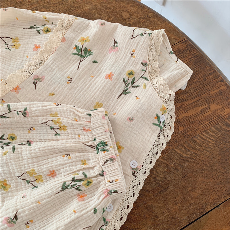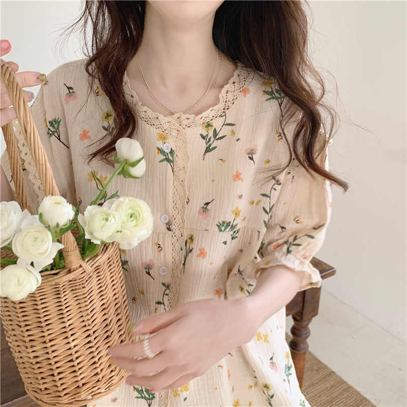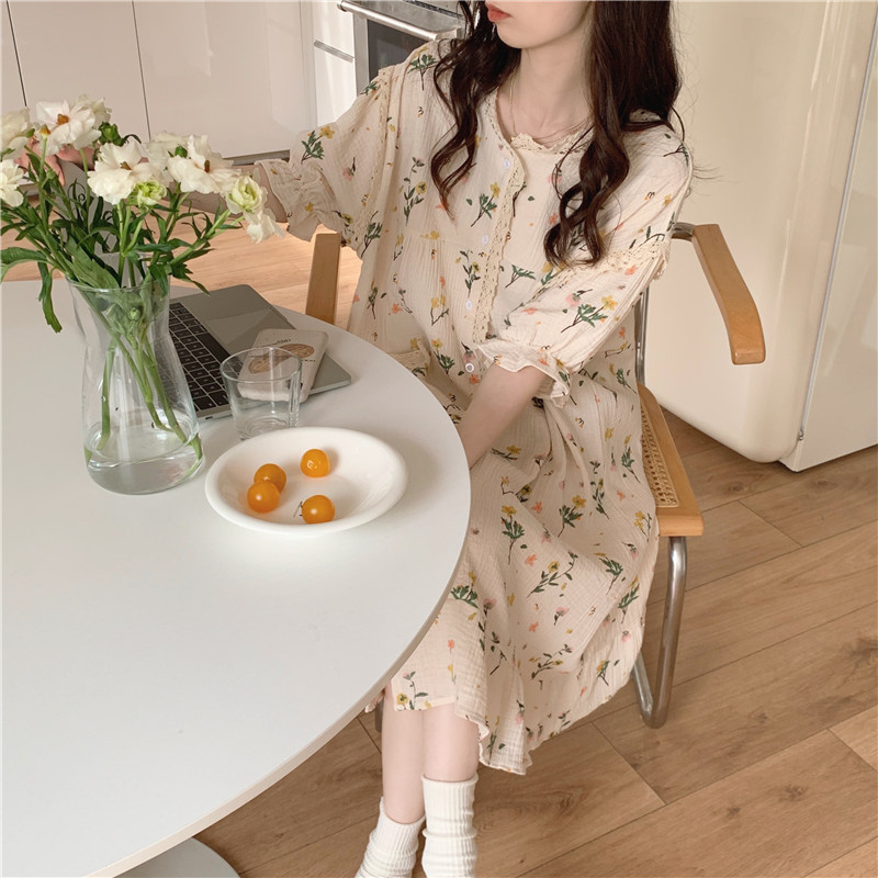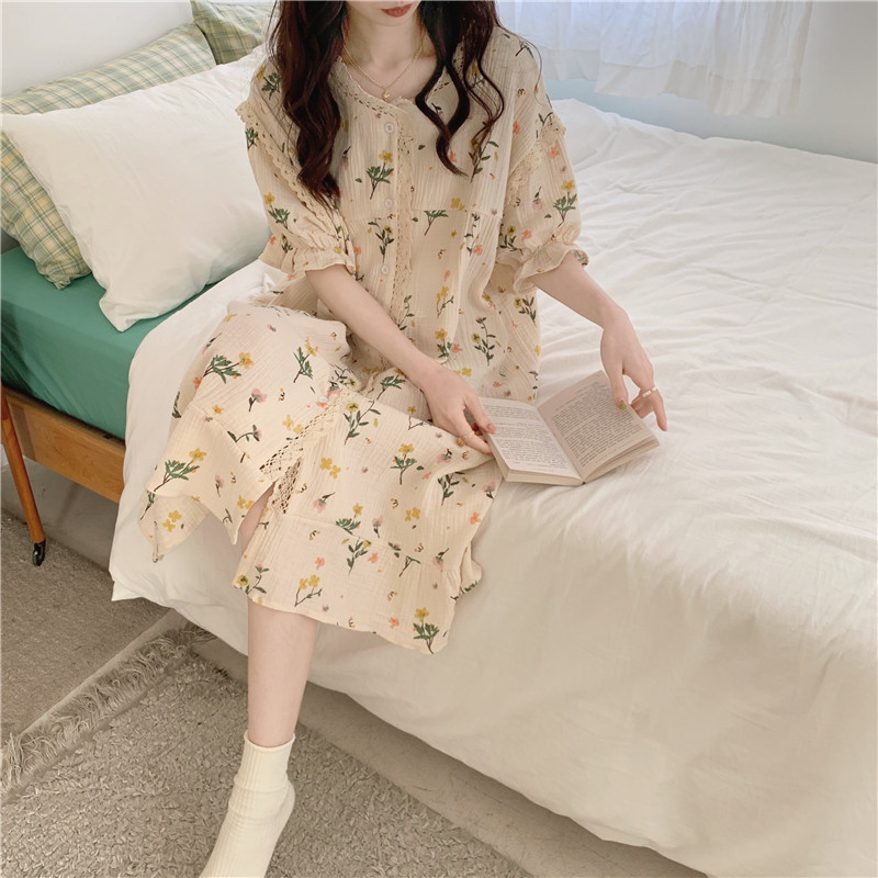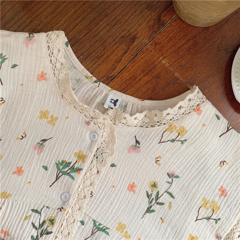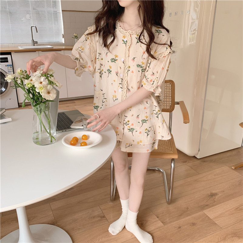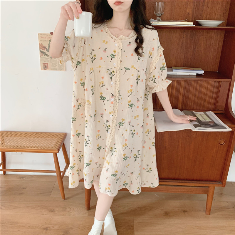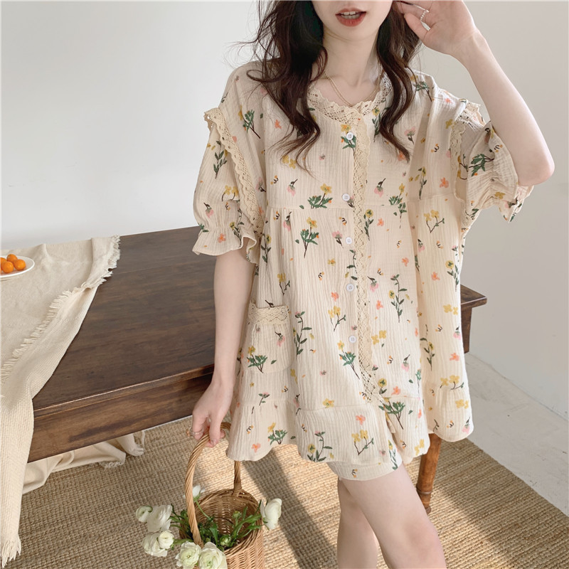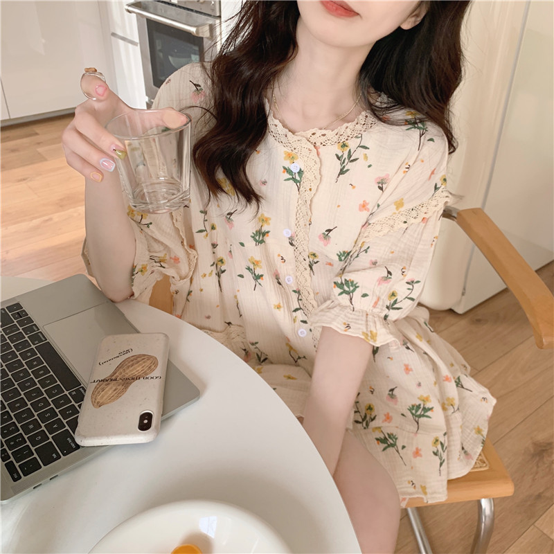 标题:韩国ins全棉纱印花甜美蕾丝宽松可外穿短袖睡裙睡衣套装家居服夏