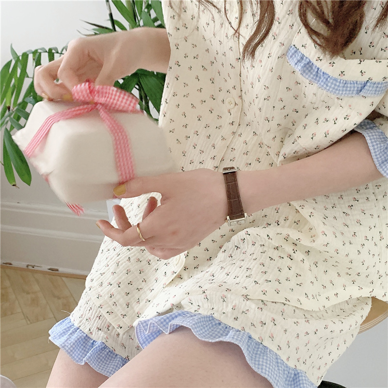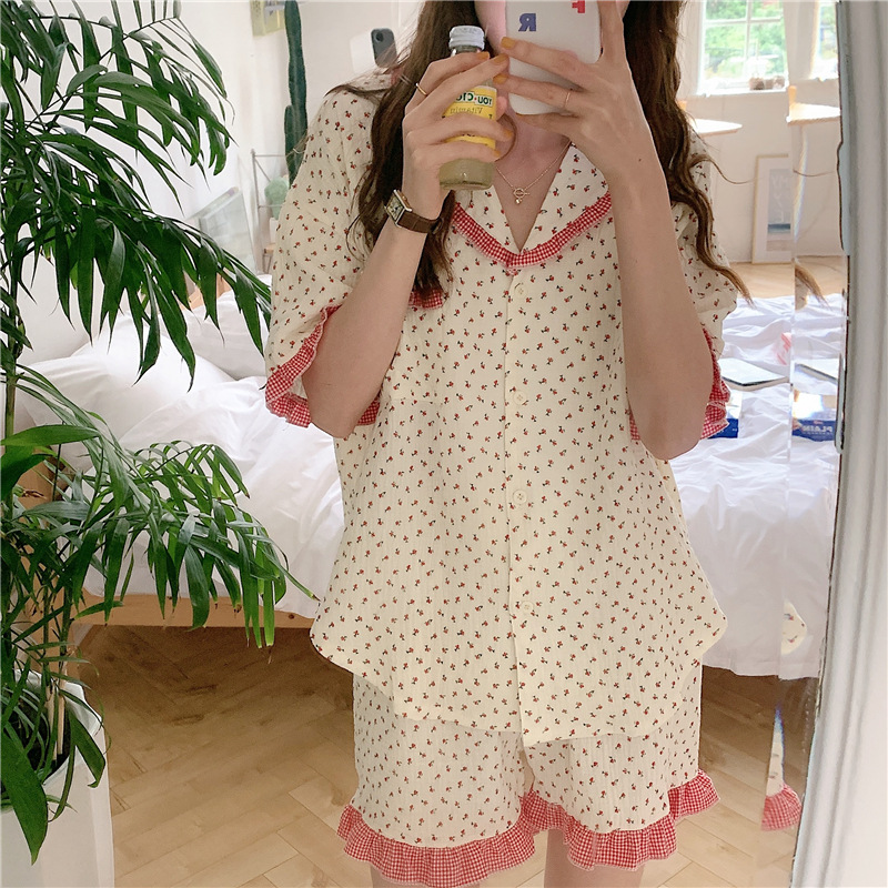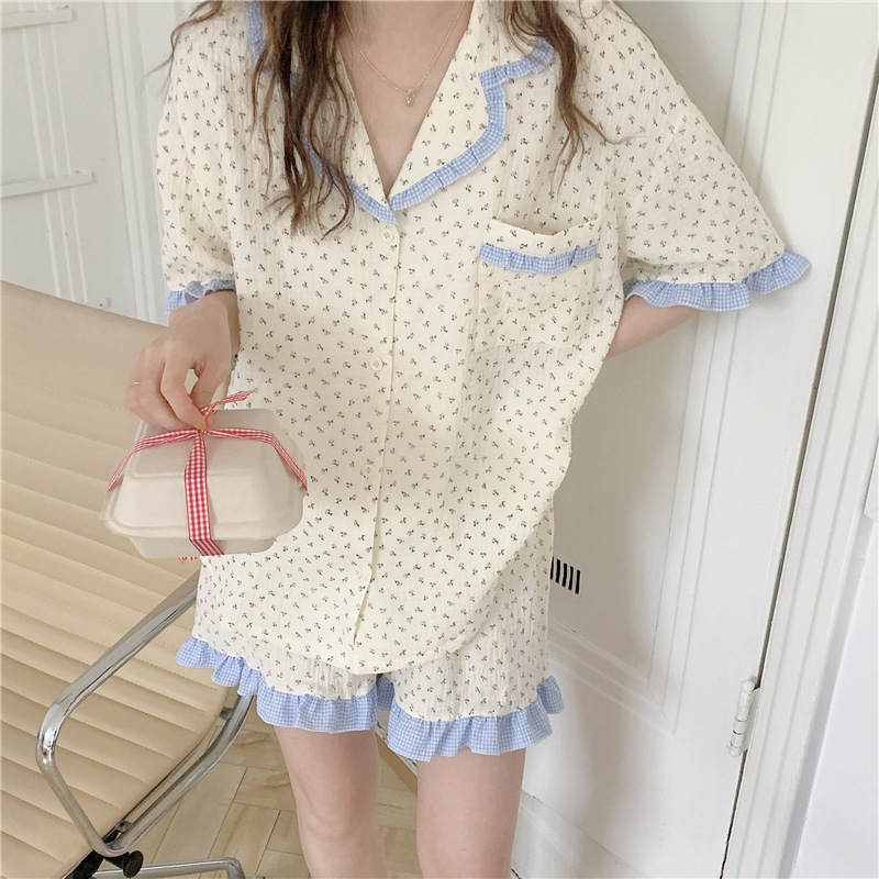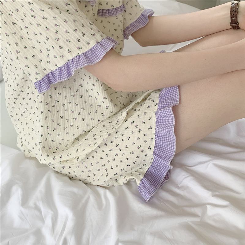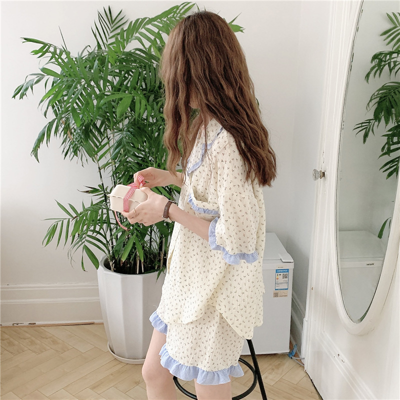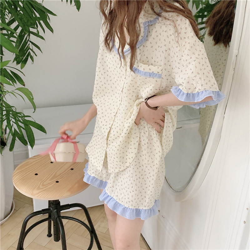标题:外贸ins荷叶边碎花棉纱睡衣少女夏季短袖短裤韩版家居服两件套装