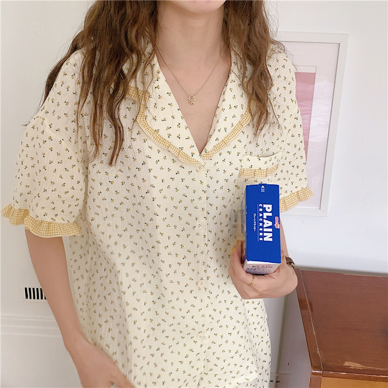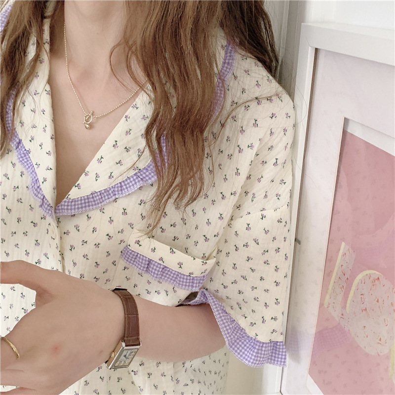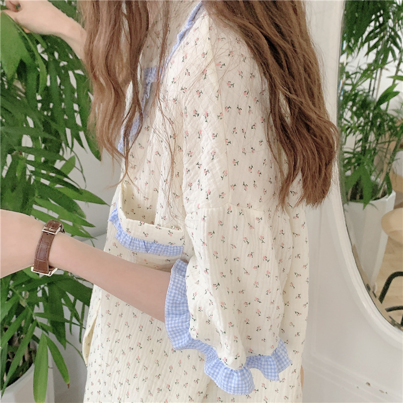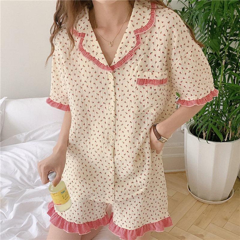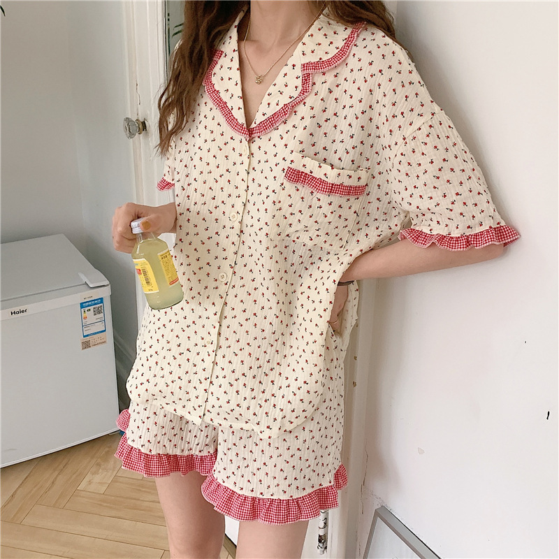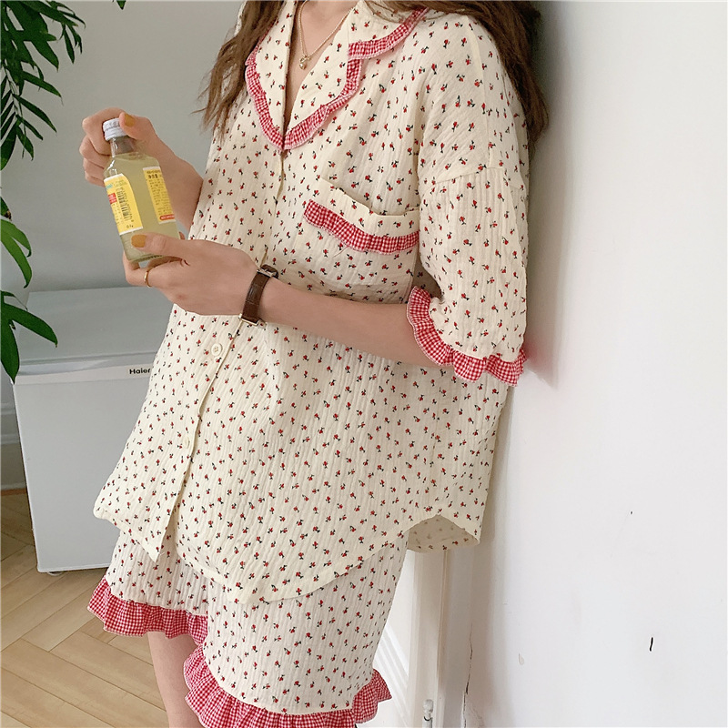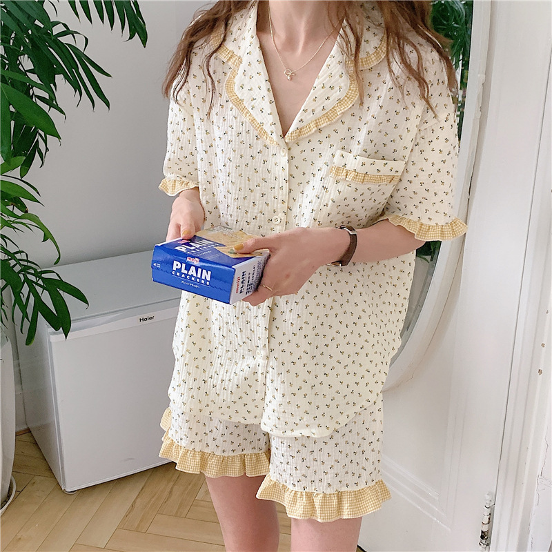 标题:外贸ins荷叶边碎花棉纱睡衣少女夏季短袖短裤韩版家居服两件套装