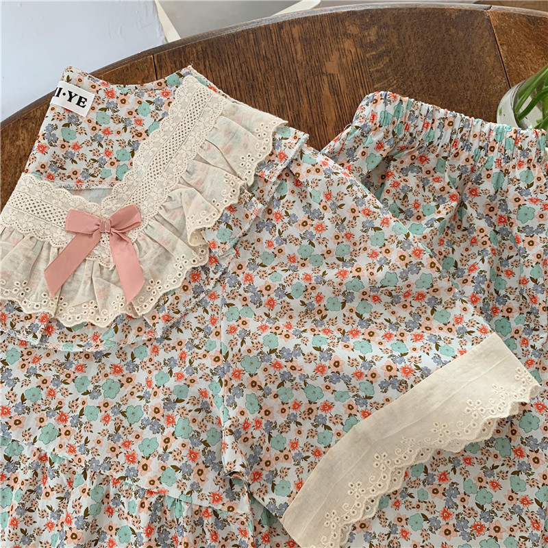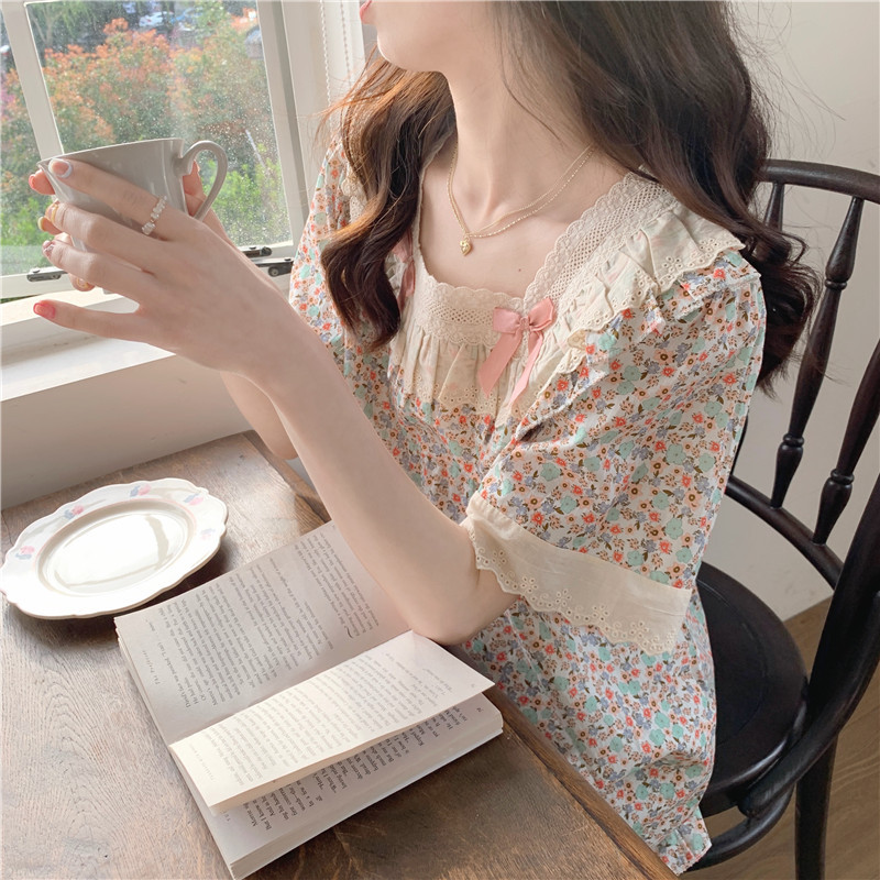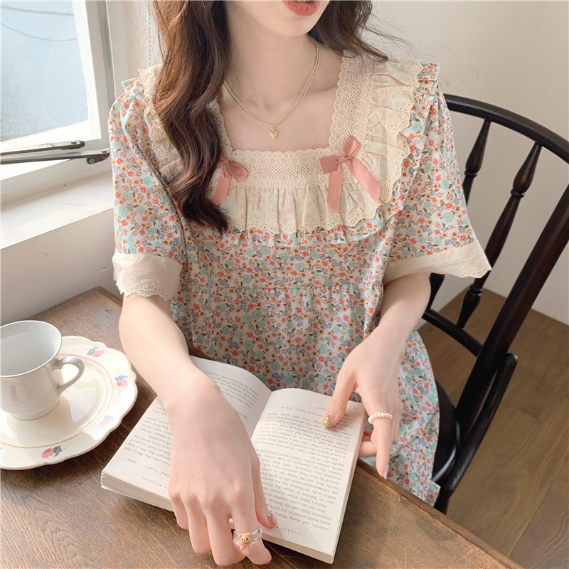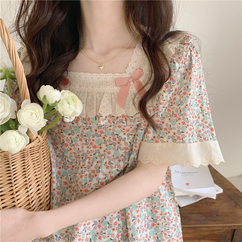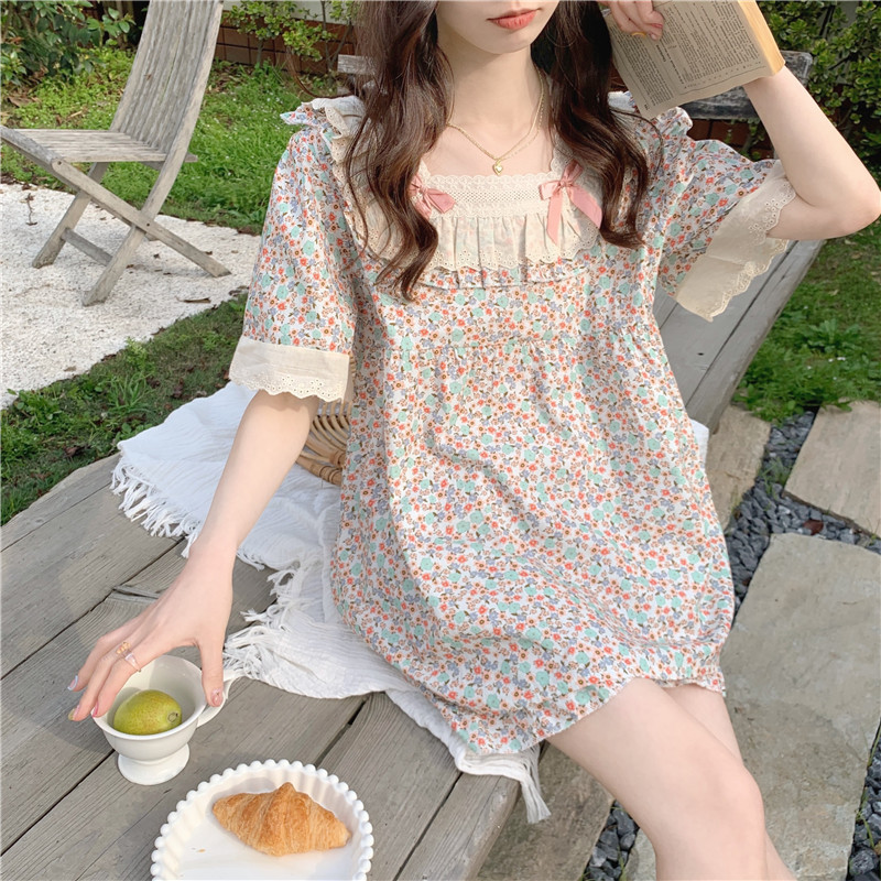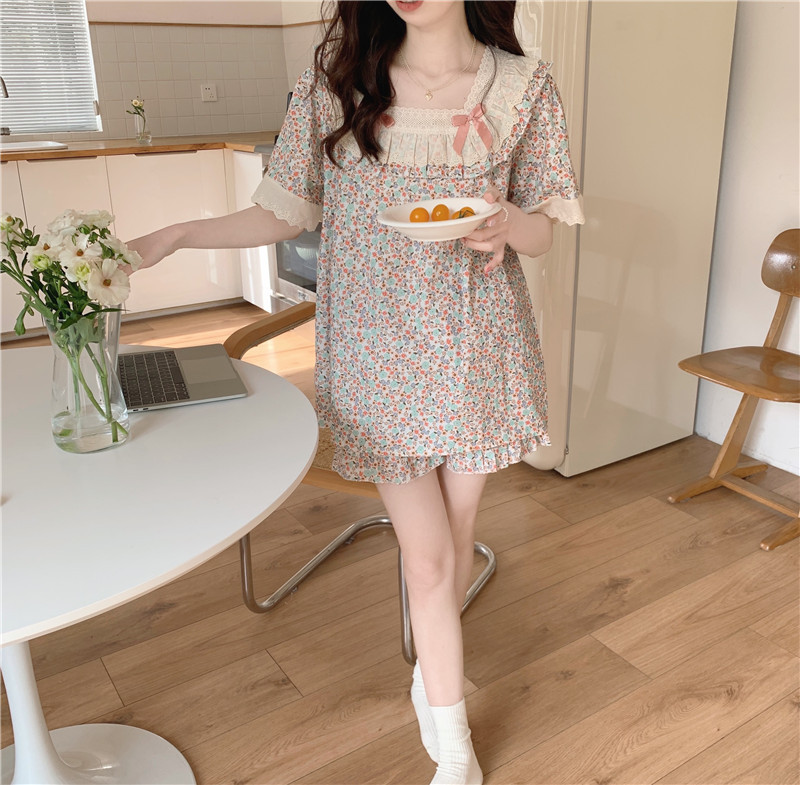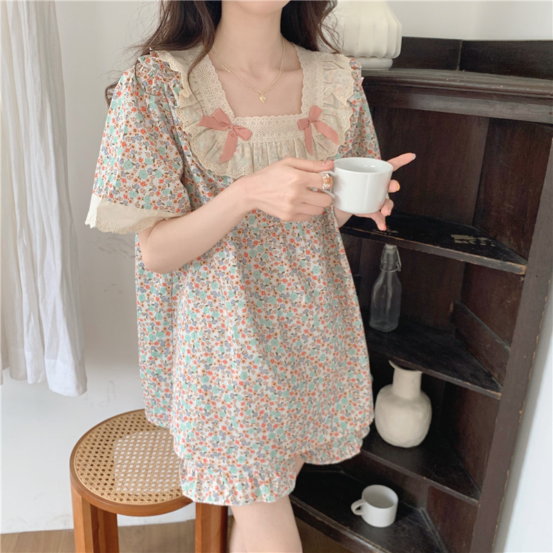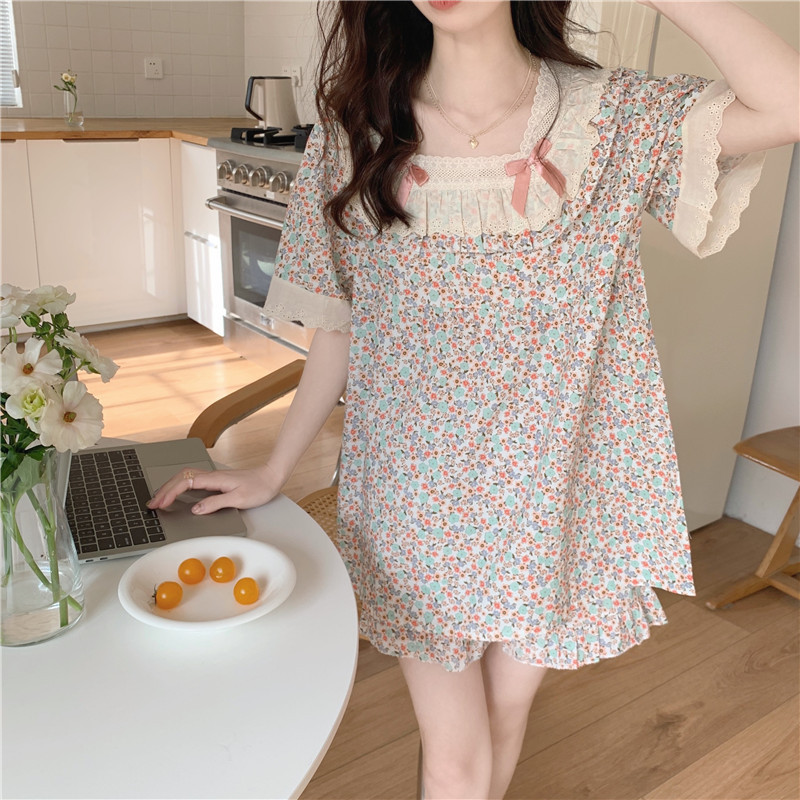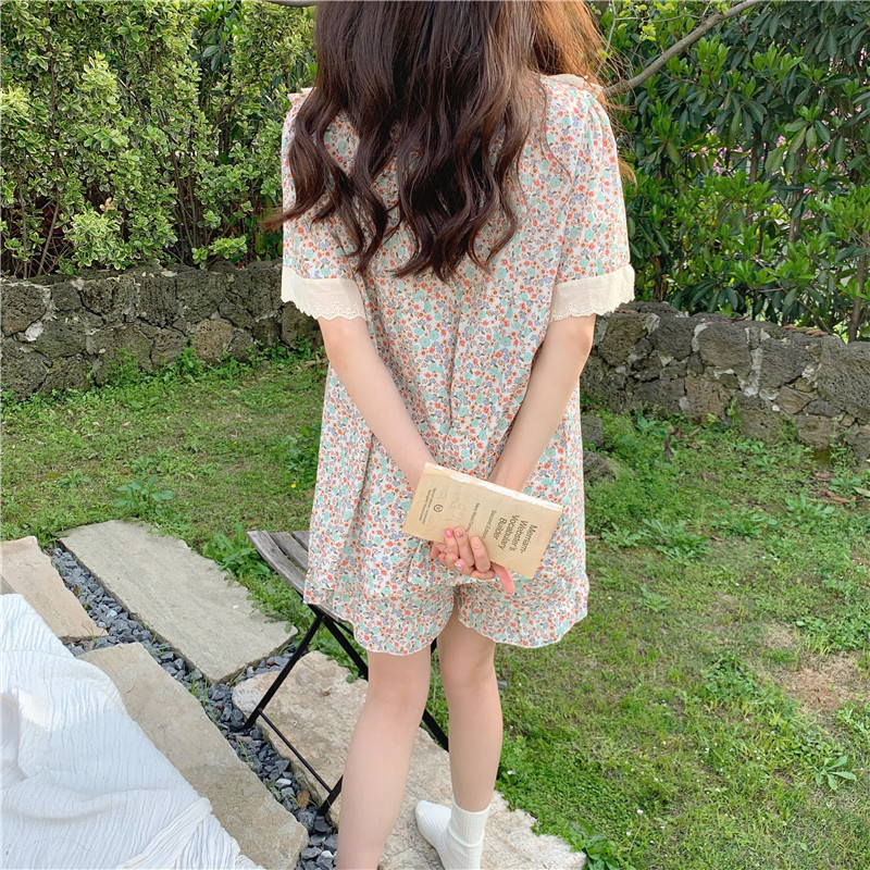 标题:日系甜美蕾丝小碎花睡衣夏季新款方领短袖休闲家居服套装可外穿女